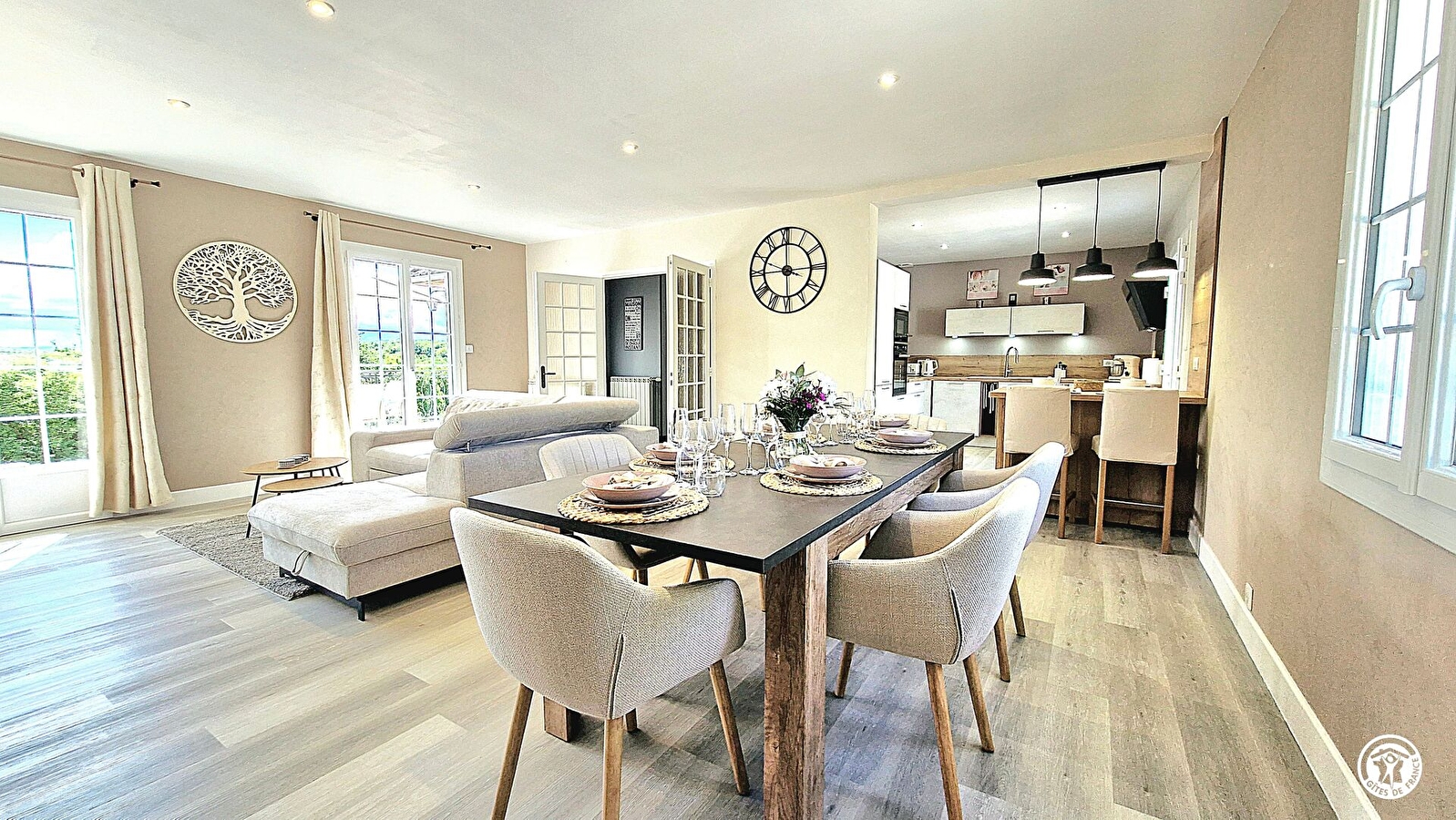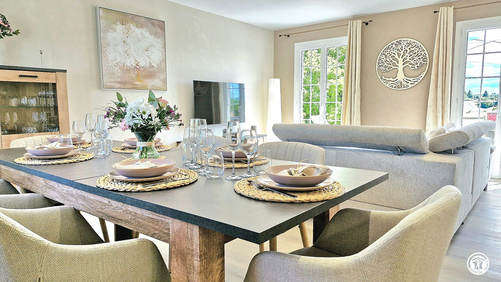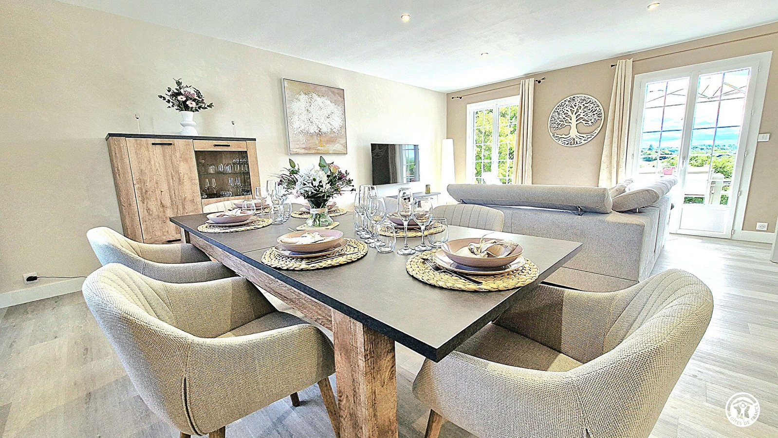 Venez séjourner au calme dans une maison individuelle entièrement climatisée, rénovée et joliment décorée bénéficiant d’une très belle vue dégagée sur la campagne. Garage et parking privé, grande terrasse avec salon de jardin, barbecue, spa (été) et jardin non clos. Grande pièce à vivre très lumineuse avec cuisine intégrée et équipée ouverte, espace salle à manger et salon avec télé et canapé convertible (possibilité couchage 1 personne 20€/nuit) avec accès direct à la terrasse. Espace nuit composé de 3 chambres (2 avec 1 lit 160x200 et 1 avec 2 lits 80x200 jumelables), 1 wc indépendant avec lave-mains et salle d’eau (douche grande dimension) avec double vasque. Formule tout compris : linge de lit avec lits faits à l’arrivée, linge de toilette, linge de cuisine, chauffage, électricité et ménage fin de séjour inclus