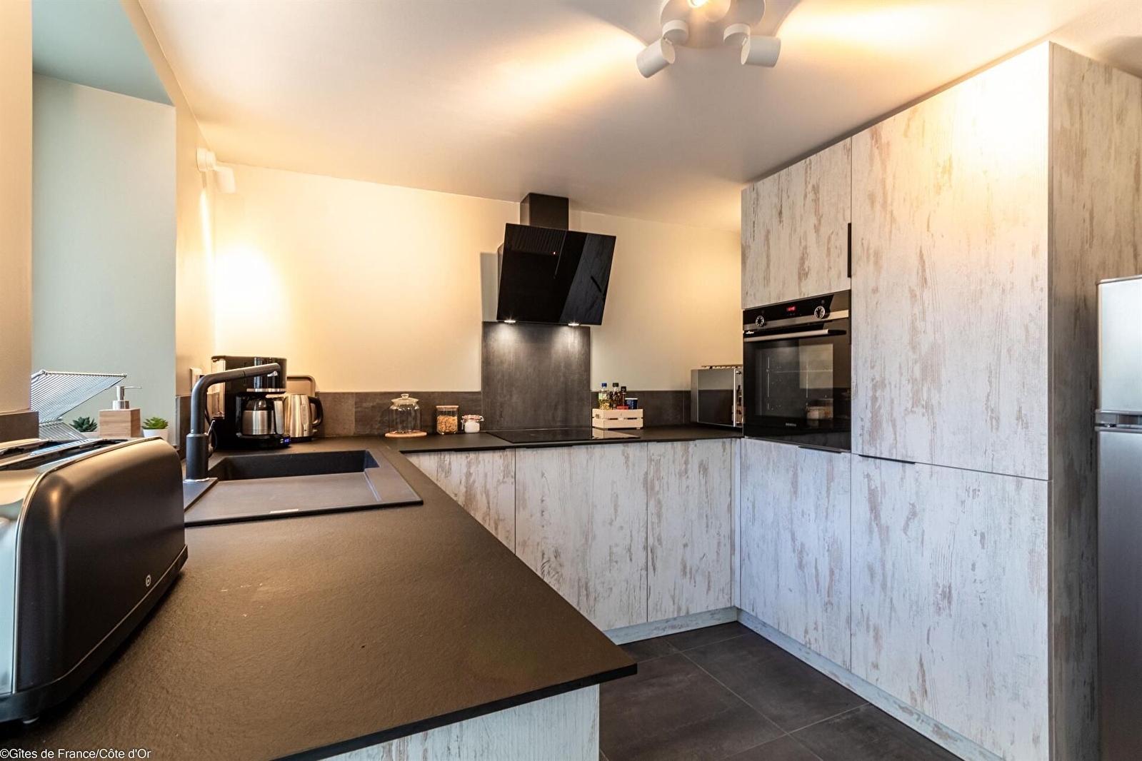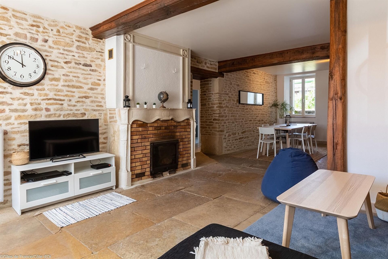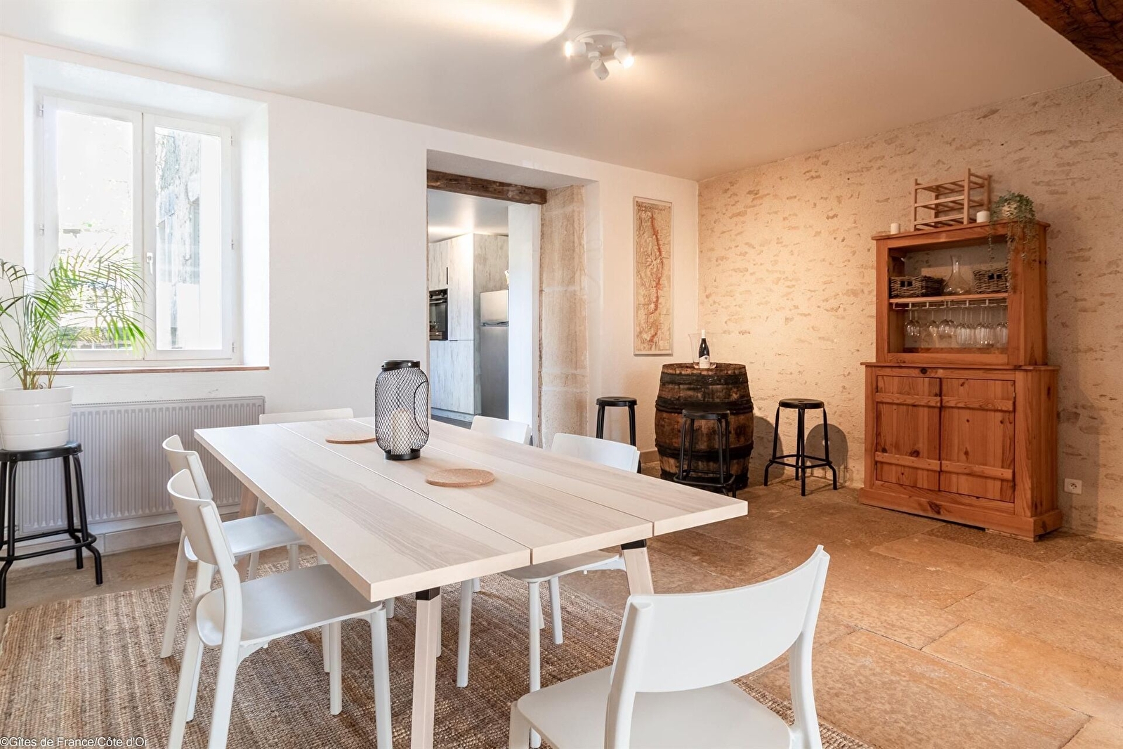 Au coeur d'un petit village à 10 minutes des portes de Dijon, la Maison de Juliette est une bâtisse rénovée, datant de 1850, avec pierres apparentes, dalles de Bourgogne et poutres.
