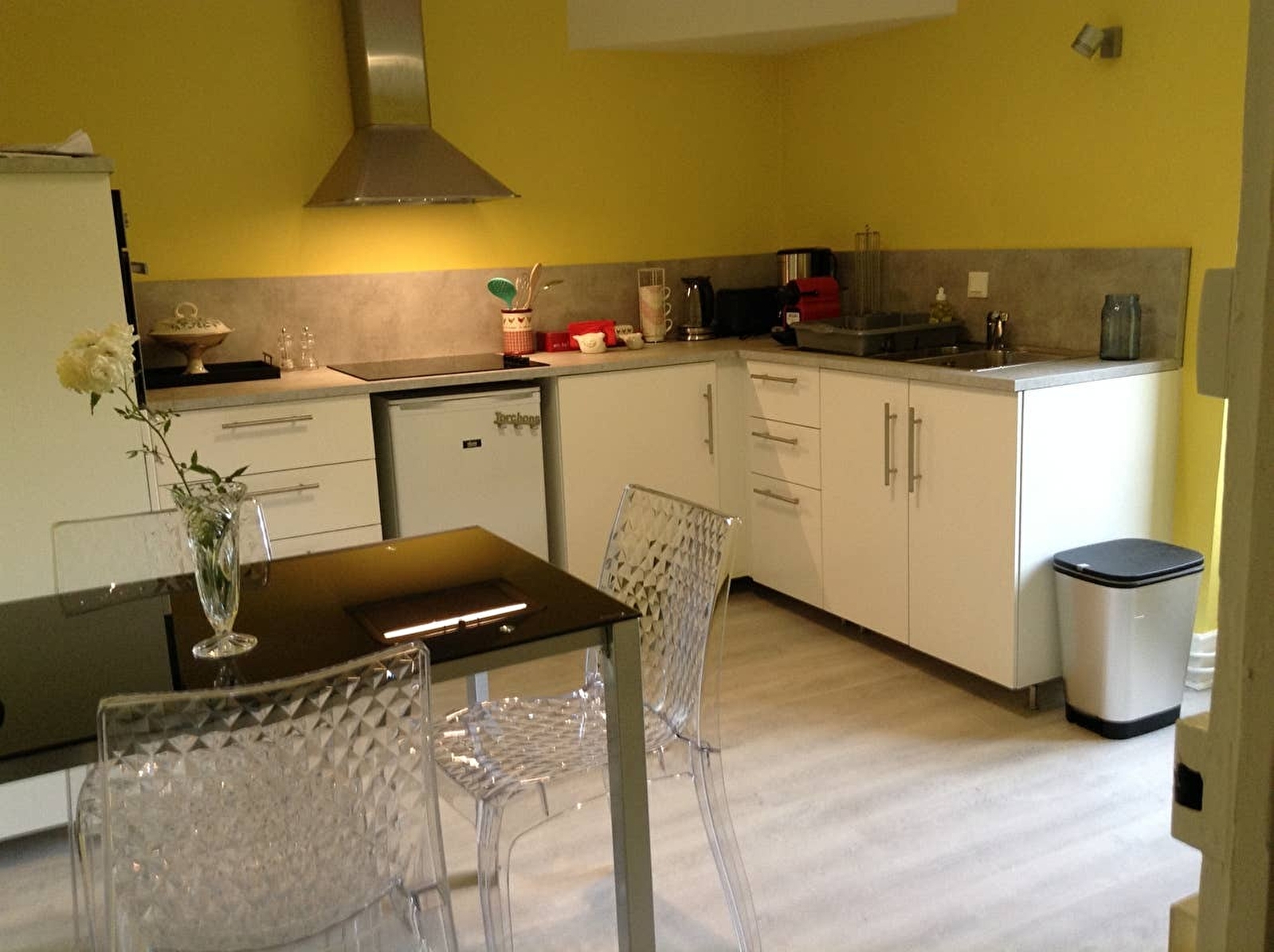 Appartement d'une chambre lit double, salle de bain et cuisine.