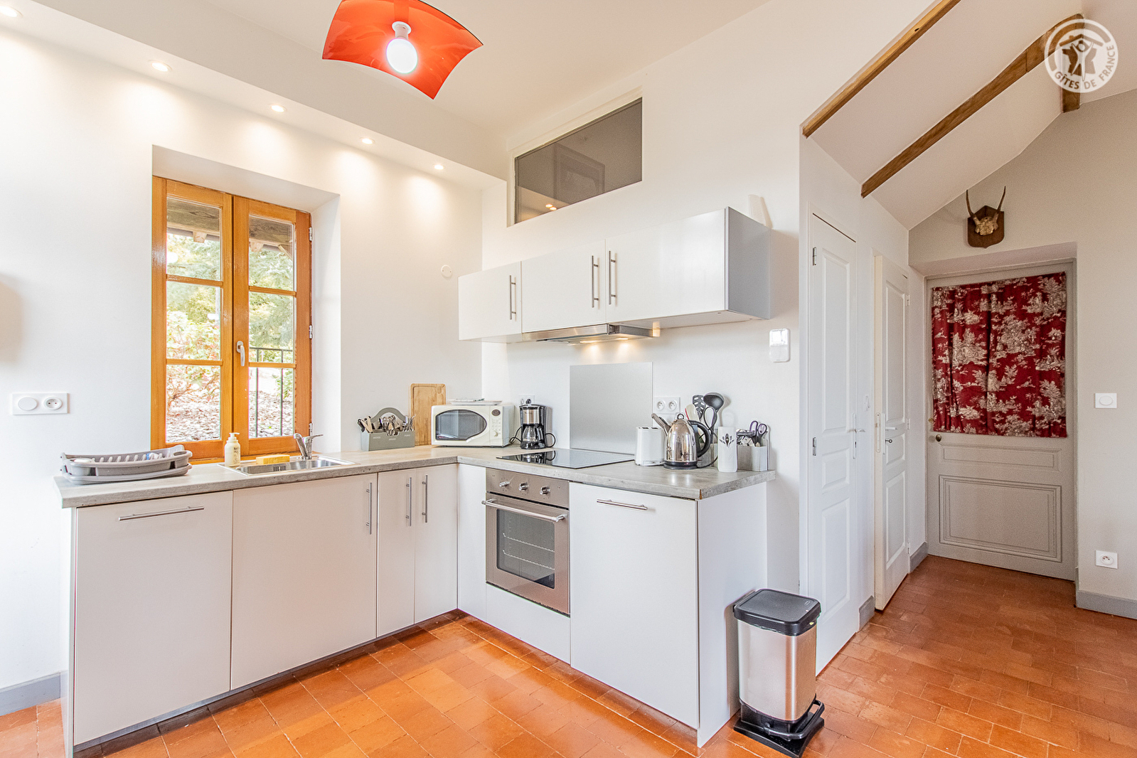 Composition : propriété comprenant 3 gîtes (totalement indépendants) + bâtiment historique ouvert au public. Gîte dans maison individuelle comprenant le bureau/accueil du domaine. Wifi (fibre). Chauffage électrique. Rdc surélevé (4 marches) : cuisine-séjour-salon, Wc indépendant. 1er étage : 2 chambres (1 lit 2 p. 140x190cm / 4 lits 1 p.90x190cm), salle d'eau (douche/Wc). Jardin (150m²) + parking privés. Local vélos. Piscine 12x6m (accès de 9h à 18h30) + tennis en commun. Commodités 2.5 km.