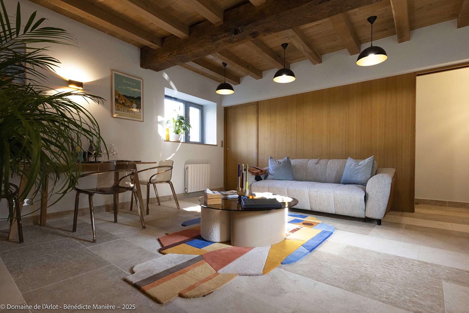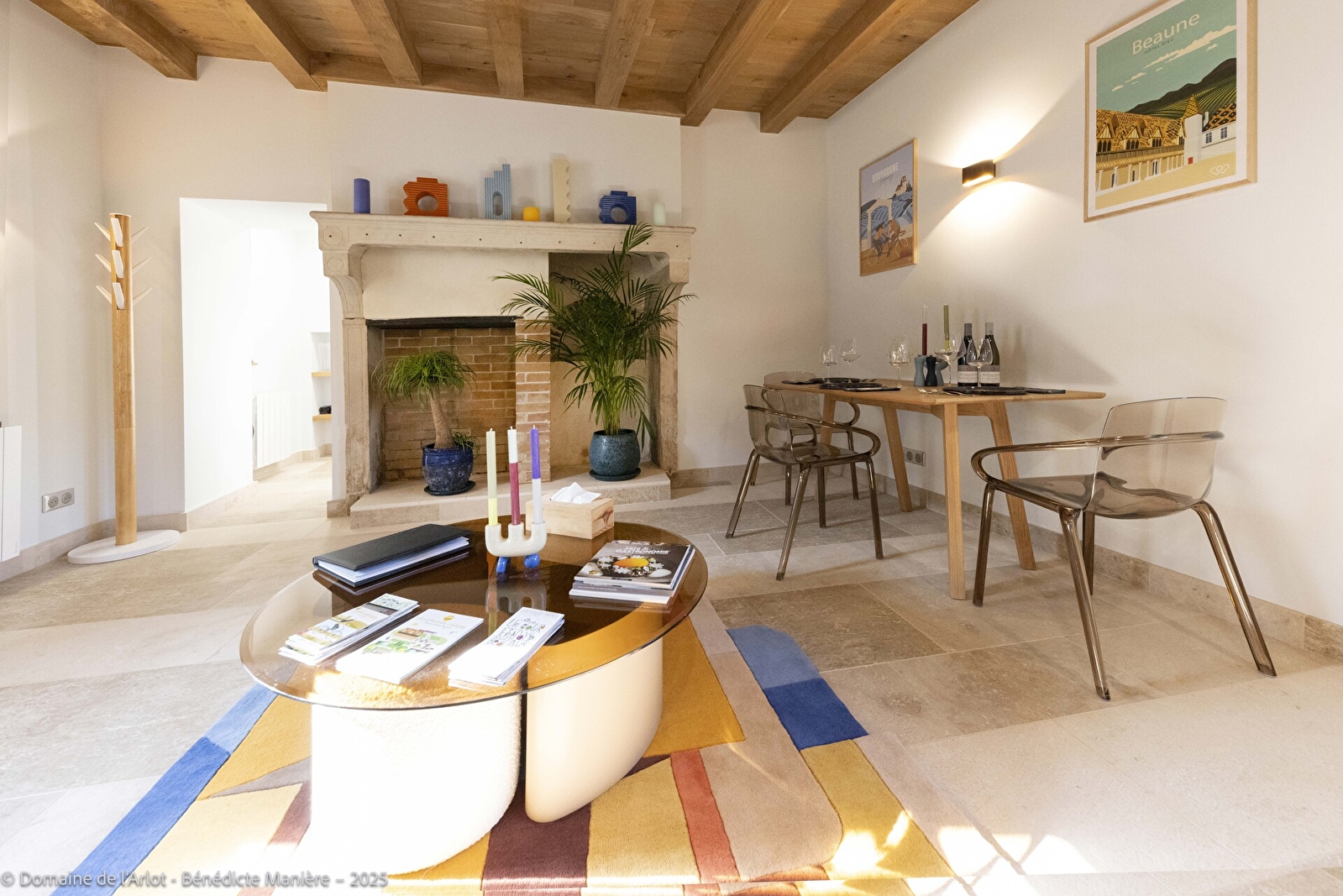 Plafonds à la française, chêne massif et pierre de Bourgogne créent une atmosphère chaleureuse et typiquement bourguignonne.