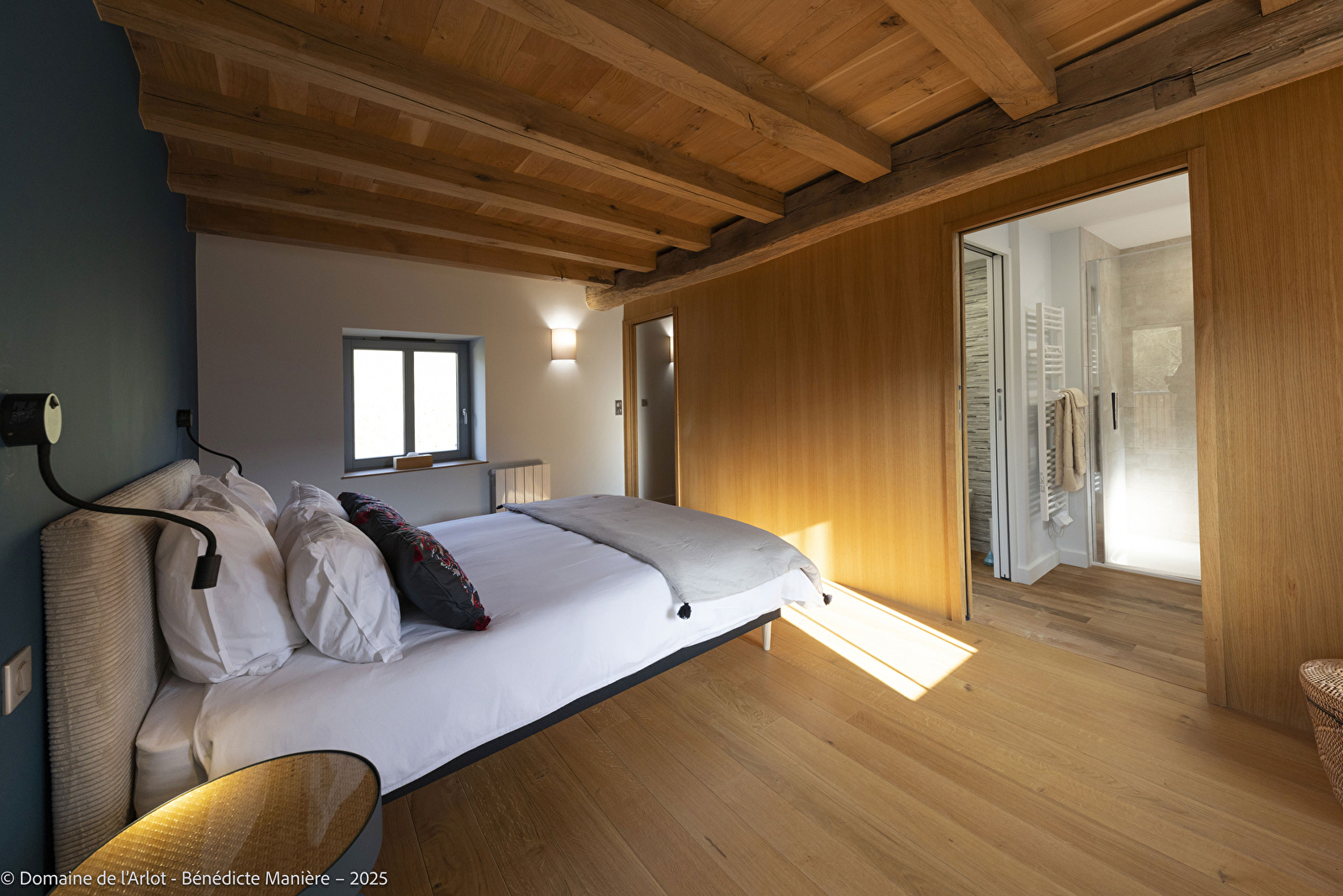 A l’étage, la chambre dispose d’un dressing, d’un lit Queen size (160 x 200), d’une salle de bain avec douche à l’italienne et toilettes.