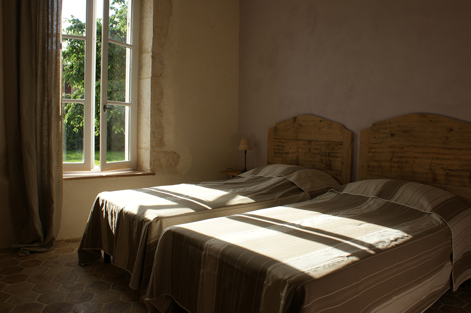 Une chambre avec un lit double donne sur le jardin et une chambre avec deux lits simples.