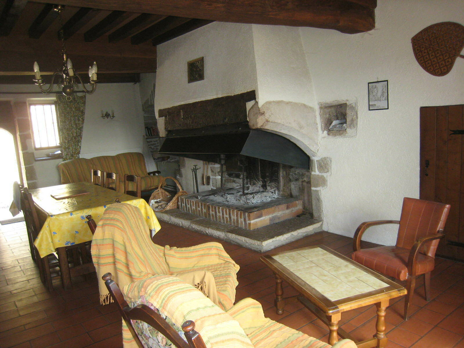 RDC : grande pièce à vivre avec coin cuisine et salon (réfrigérateur/congélateur, lave-vaisselle, lave-linge, four à micro-ondes, bouilloire électrique, cuisinière avec plaques gaz et four électrique, grille-pain), TV, grande cheminée.