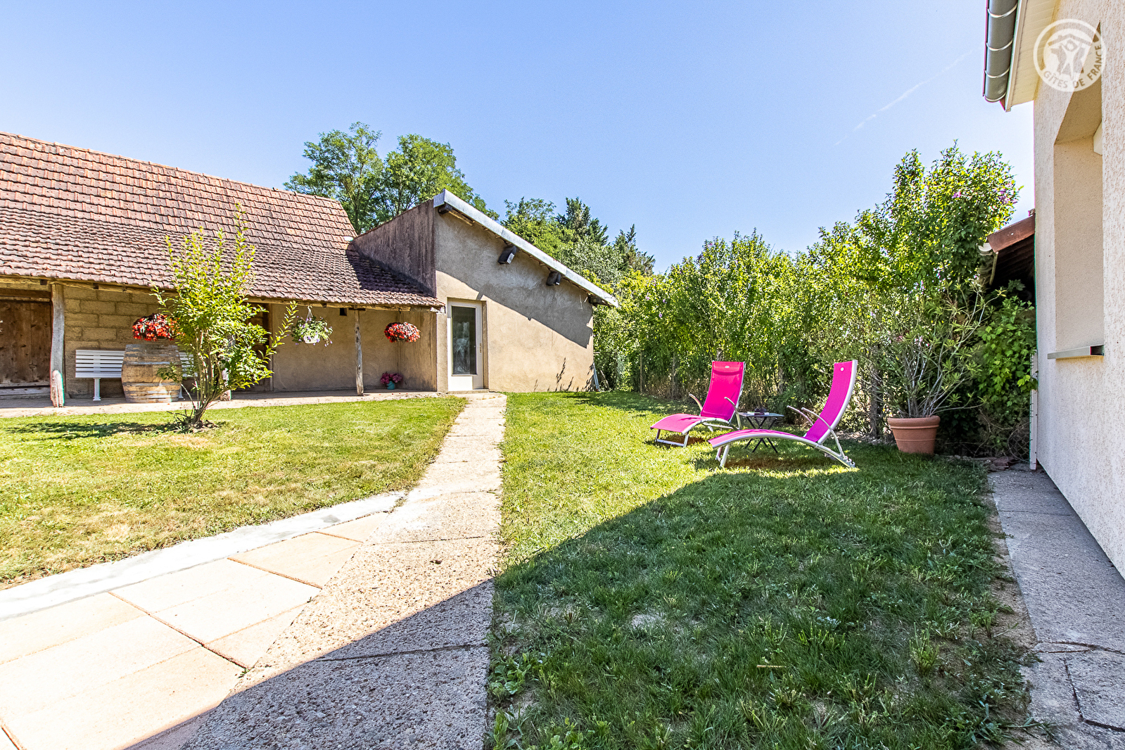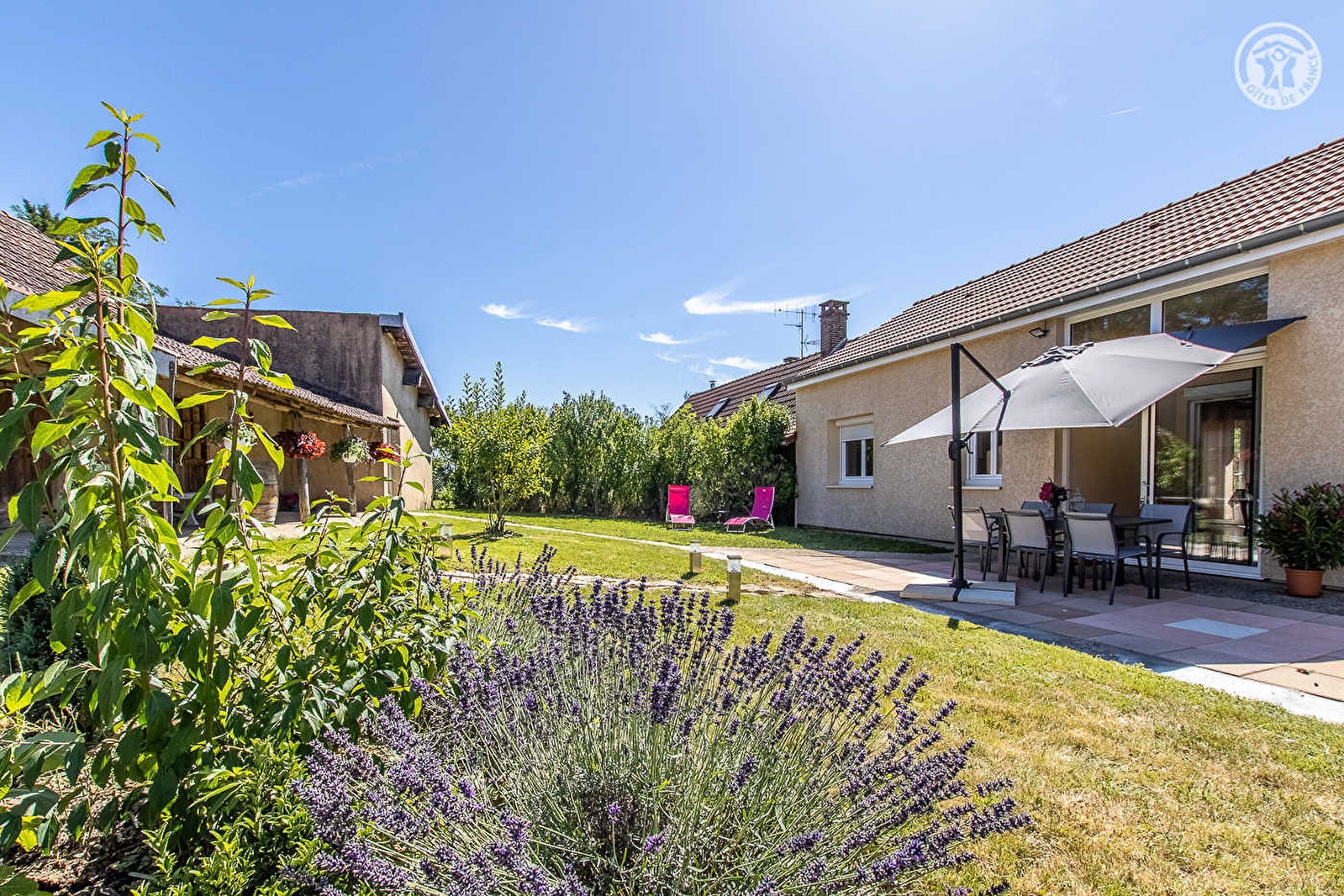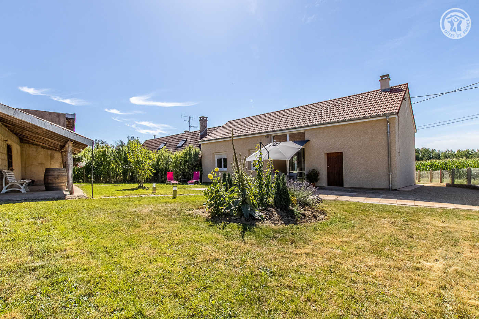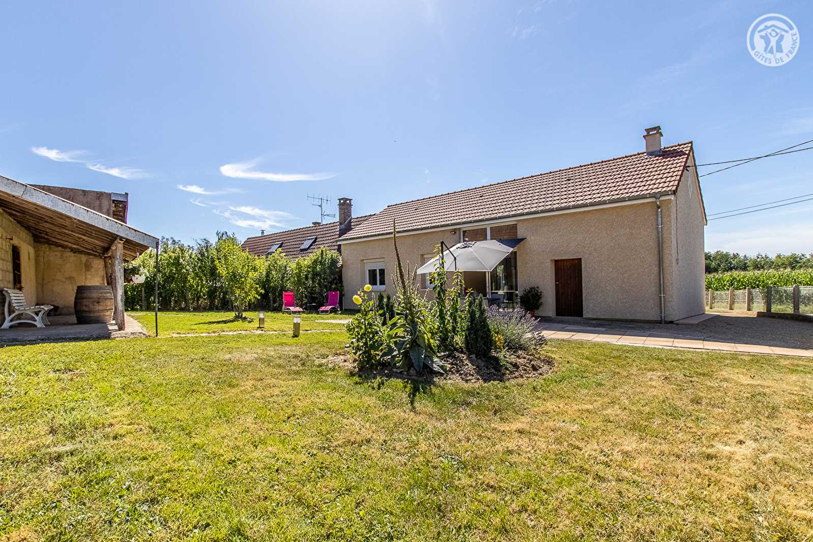 Agriculteurs aujourd'hui retraités, dont vous pourrez visiter la ferme toute proche qui accueille toujours de nombreux animaux pour le plaisir des enfants (chevaux, ânes, oies, poules, canards, lapins…), Évelyne & Michel vous accueillent au sein d'une ancienne « fermette » de pays datant de la fin du 19ème siècle, désormais intégralement restaurée & relookée en confortable villégiature contemporaine. Calme absolu, en plein cœur d'un paisible petit hameau résidentiel niché en pleine campagne à 2.5 km du centre du charmant village bressan typique de Simard. Au creux d'un relaxant cadre champêtre & agricole préservé en lisière immédiate de vastes champs, rivières & prairies, à deux pas d'un bucolique petit étang privé intimiste & arboré, protégé des regards par un petit bois, disposant d'un local abrité aménagé avec cuisine d'été, parfait petit « spot » pour tout amateur de pêche ou pour lézarder & se prélasser dans un écrin naturel privilégié. Site verdoyant reposant & ultra ressourçant. Spacieux gîte de bon confort. Ravissant cachet campagnard contemporain d'esprit « rustique chic ». Chaleureuse ambiance douce et dépaysante d'une ancienne demeure. Spacieuse terrasse exposée & ombragée ouverte sur un agréable jardin clos aménagé et fleuri avec soins, doté des dépendances historiques de la ferme intégrant une large terrasse en coursive abritée (et un local à vélo) ainsi qu'une cour en gravier (potentiel terrain de pétanque naturel !). Belle vue dégagée sur la campagne environnante.
