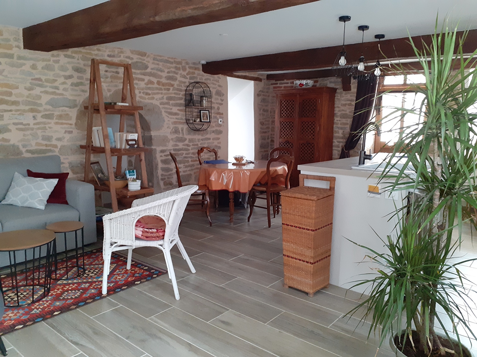 Une grande pièce à vivre avec ilot central, sur cave voûtée, ouvre sur une véranda, vue sur la campagne environnante et les couchers de soleil!