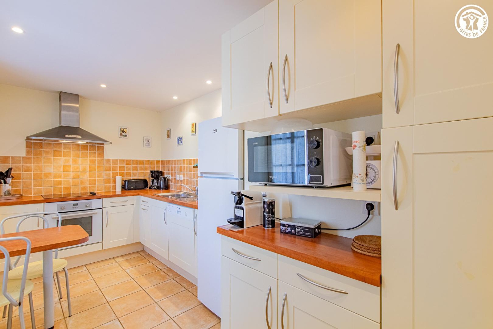 Composition : Maison de village mitoyenne. Wifi (fibre). Chauffage électrique + poêle à bois. Accès gîte situé au 1er étage par escalier extérieur. 1er étage : séjour-cuisine-salon, 1 chambre (lit 2 p. 140x200cm), salle d'eau (douche), Wc indépendant. 2ème étage : 2 chambres (2 lits 1 p. 90x200cm dans chacune), salle d'eau (douche), Wc indépendant. Terrain clos + balcon abrité + double terrasse + abri couvert voitures (3 places) + local vélos + parking privé privatifs. Commerces & services dont supermarché 5 km.