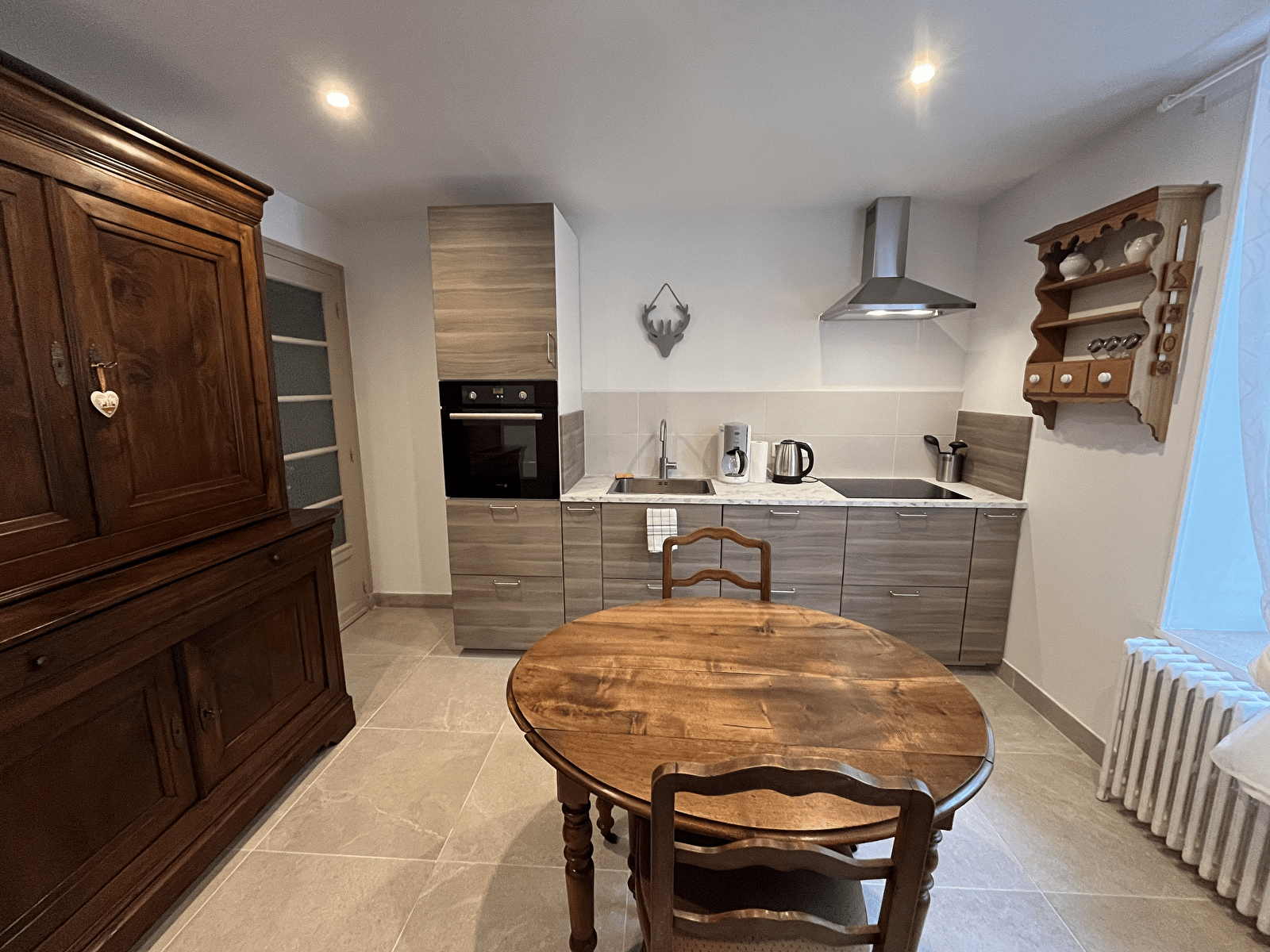 - un rez-de-chaussée comprenant une cuisine toute équipée (four, micro-ondes, réfrigérateur, lave-vaisselle, cafetière, bouilloire, grille-pain, plaque de cuisson), une pièce à vivre (salle à manger et salon), des toilettes et une buanderie (machine à laver)