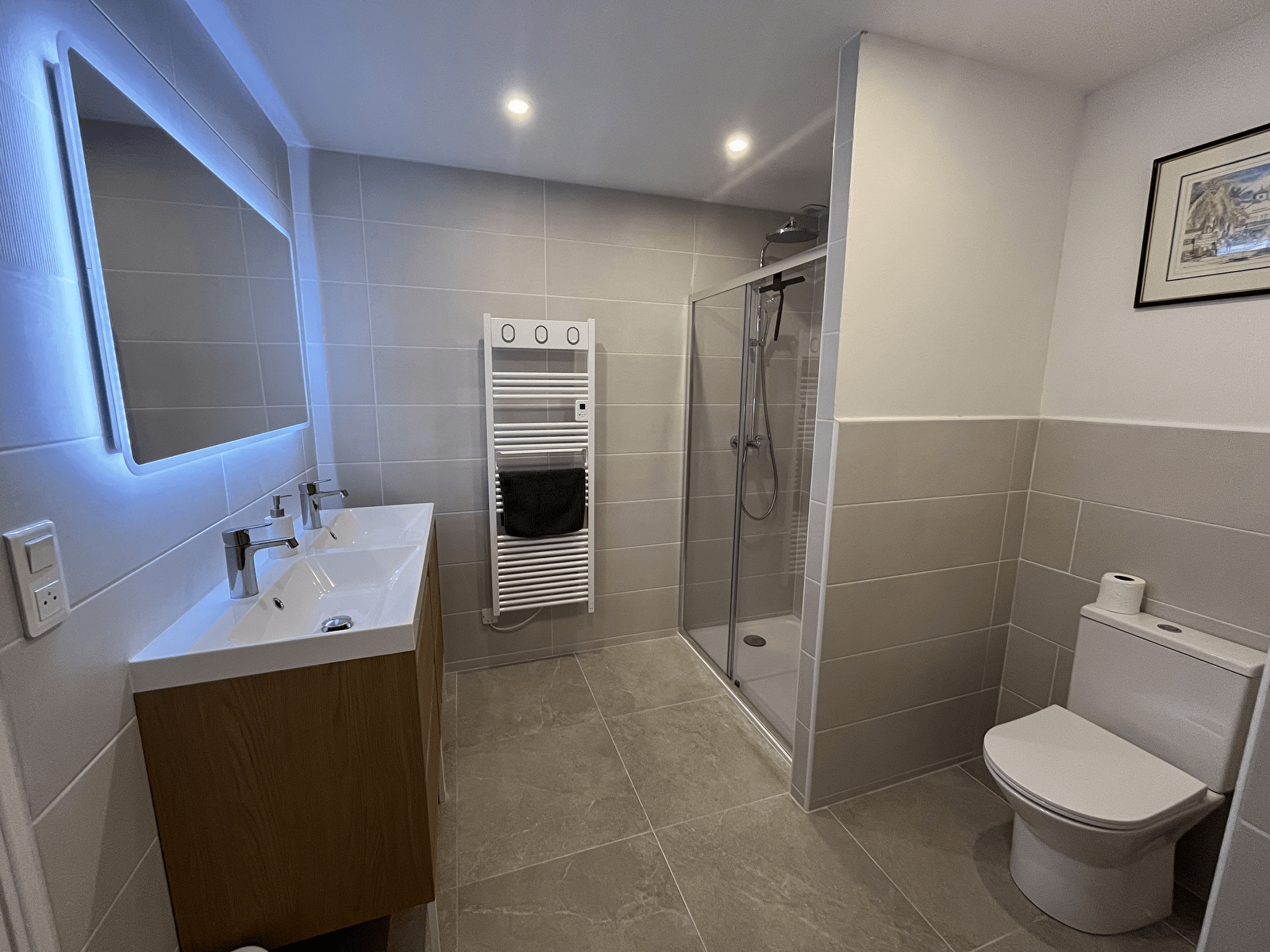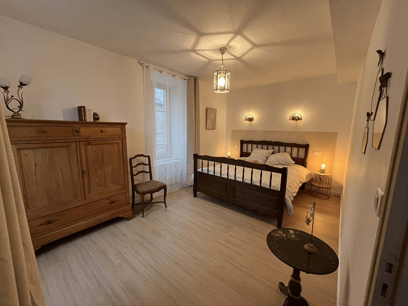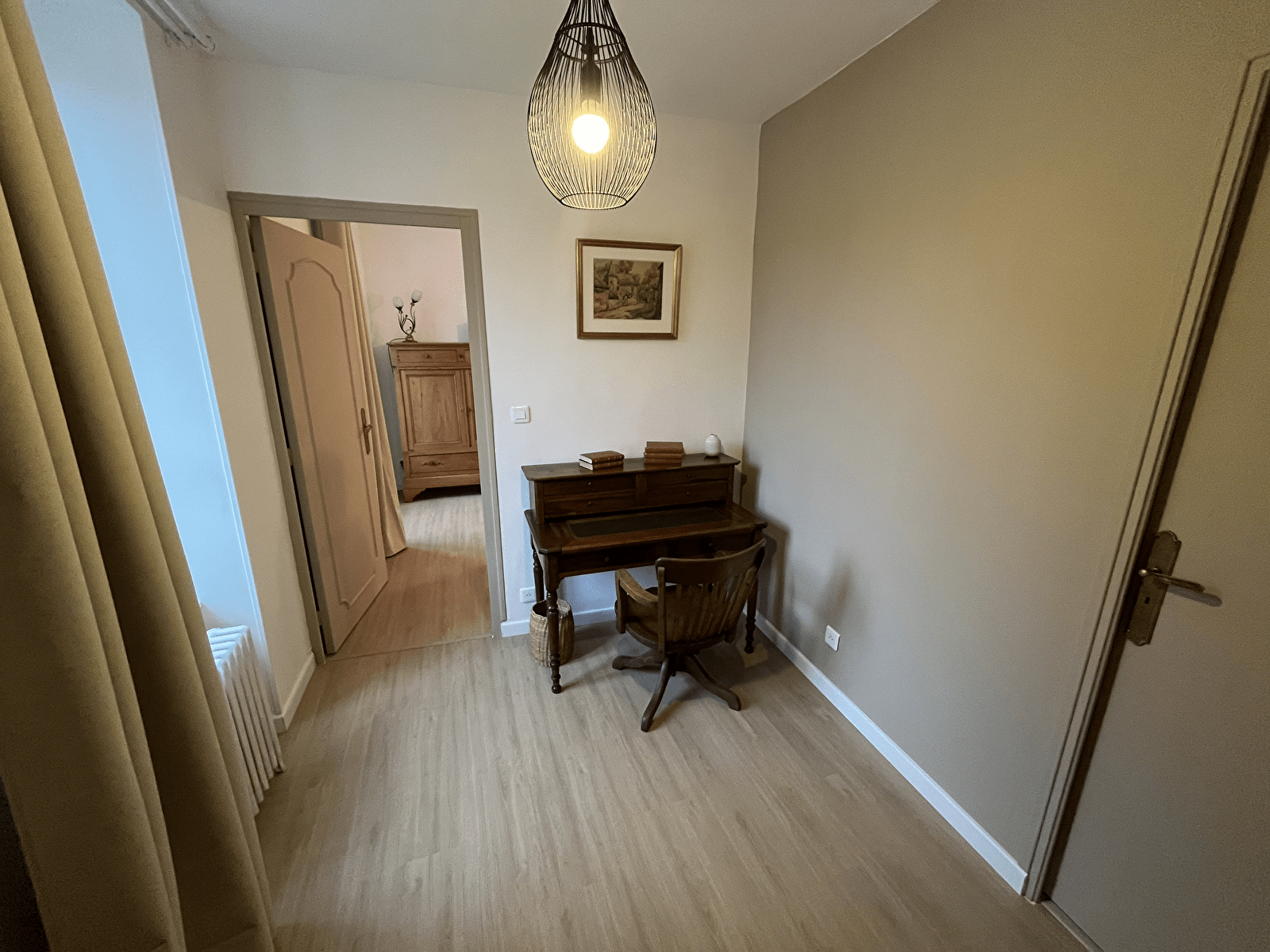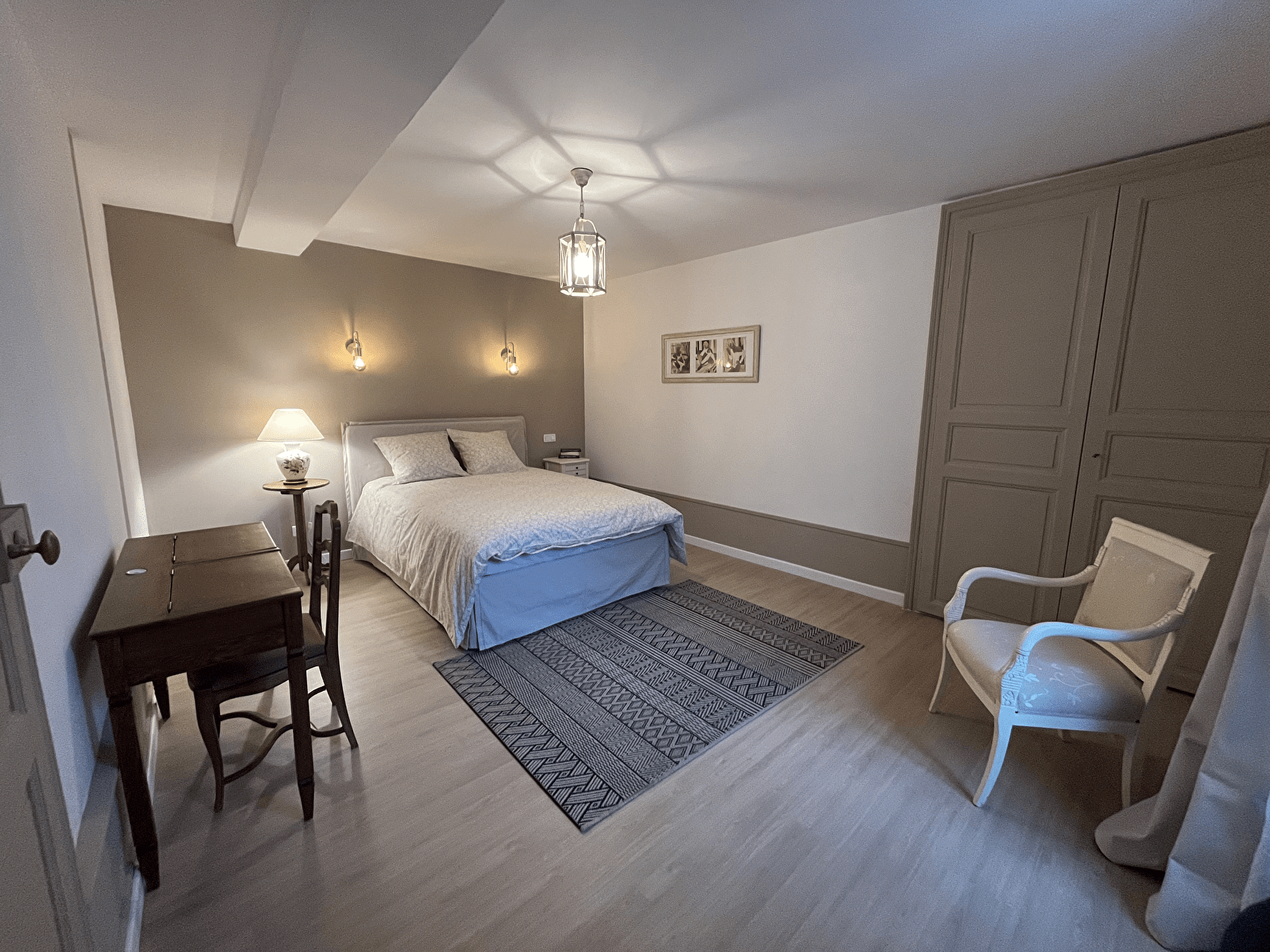 - un premier étage disposant d’une suite : chambre avec lit 160x200, bureau et salle d’eau privative avec douche et toilettes et d’une deuxième chambre avec lit 140x200 (cette dernière a accès à la salle de bain du même étage)