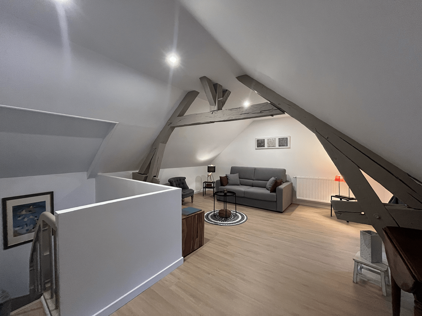 -un deuxième étage comprenant une suite : chambre avec lit 140x200, salle d’eau avec douche et toilettes et une mezzanine avec salon. Un canapé convertible avec un matelas de qualité permet un couchage supplémentaire pour 2 personnes.