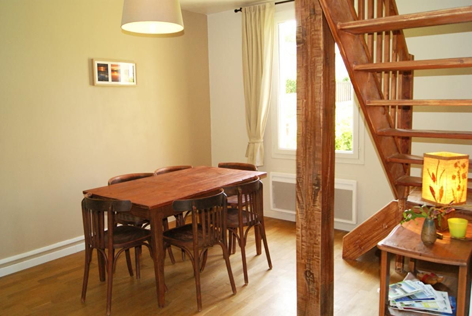 Maison rénovée alliant confort modernisme et authenticité. Jardin avec vue sur le lac (baignade, pêche, barques, canoës). Parking. Au rez-de-chaussée : entrée, salon avec télévision écran plat, cuisine ouverte équipée et aménagée sur pièce à vivre, salle d'eau avec douche de grande dimension, et wc séparé. A l'étage, 1 chambre avec 1 lit 140x190 cm et 1 chambre avec 2 lits 90x190 cm. Il n'y a pas de wifi mais le réseau mobile passe bien.