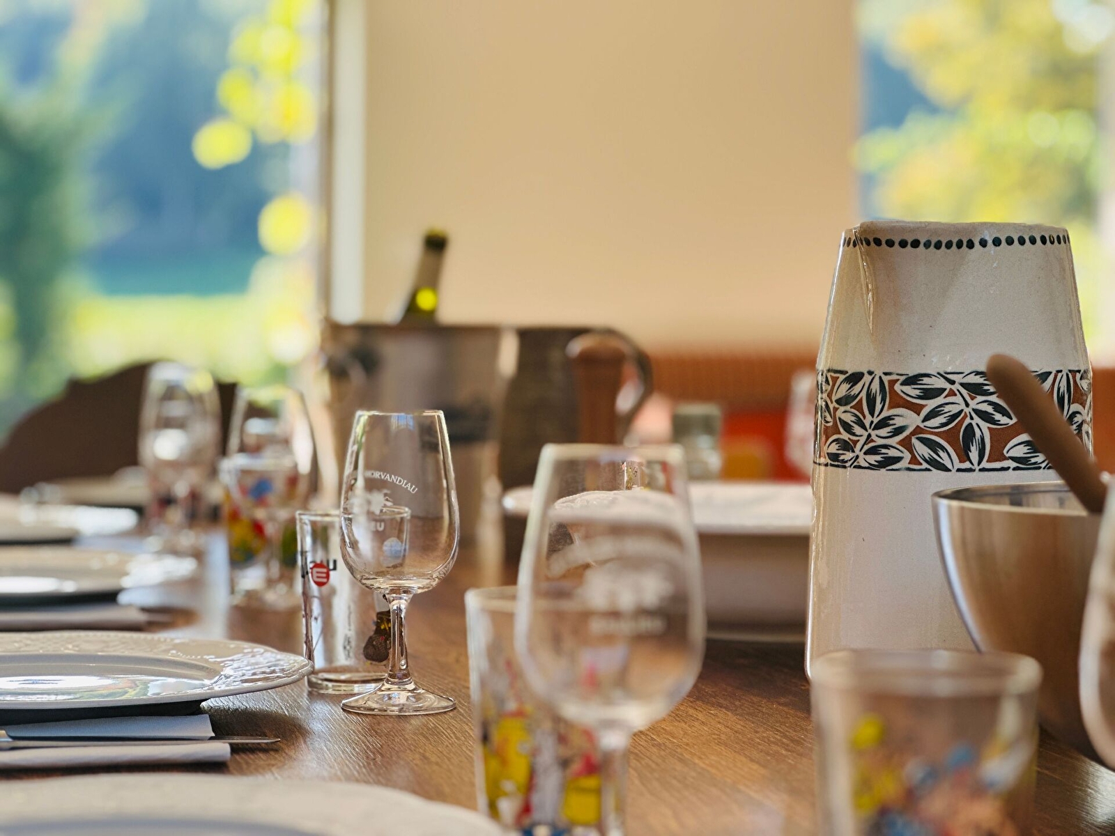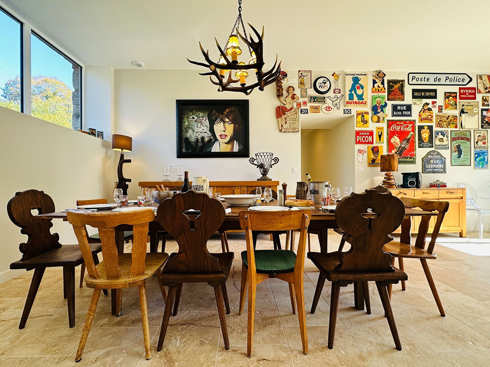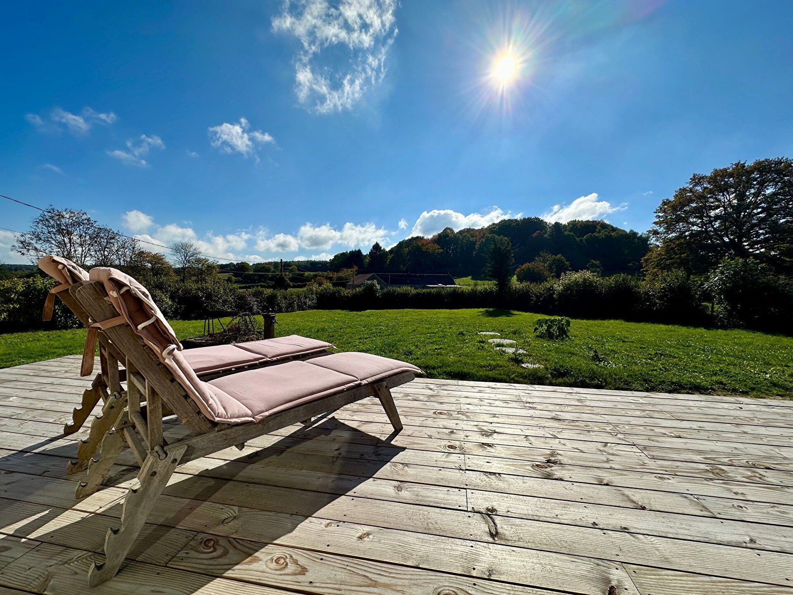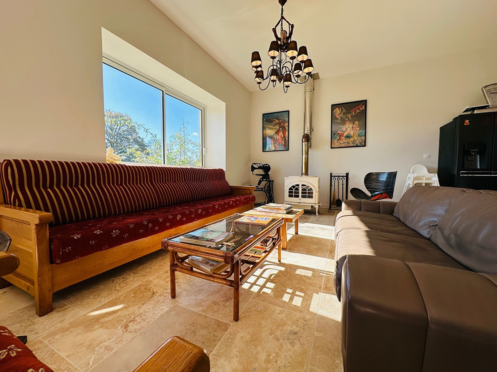 Une vaste pièce à vivre lumineuse et chaleureuse vous attend. Elle comprend une cuisine ouverte entièrement équipée, un espace repas convivial pour partager de bons repas et un coin salon avec un poêle à bois (bois fourni), parfait pour les soirées d’hiver. Cet espace offre un accès direct à une grande terrasse avec mobilier de jardin et barbecue charbon.