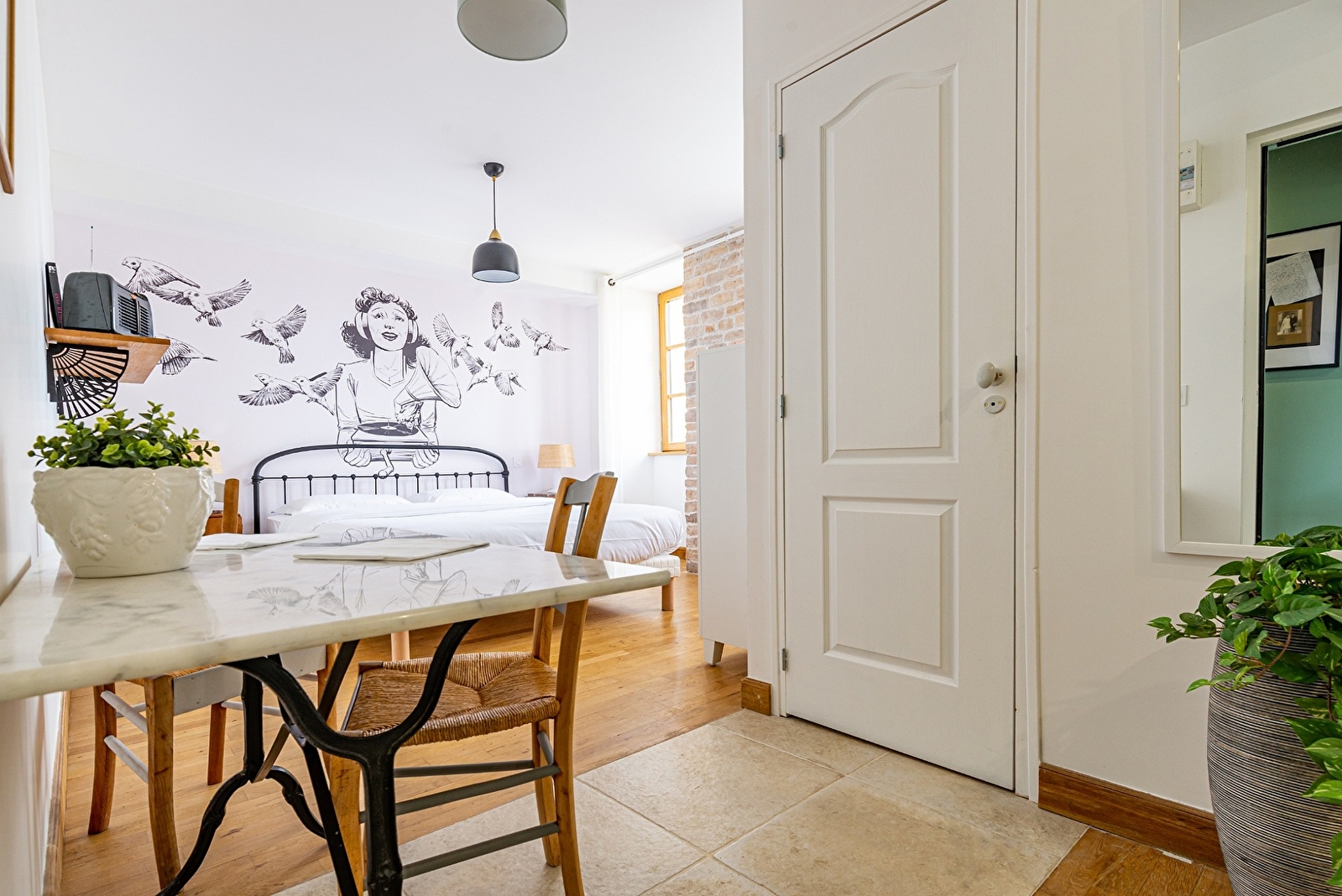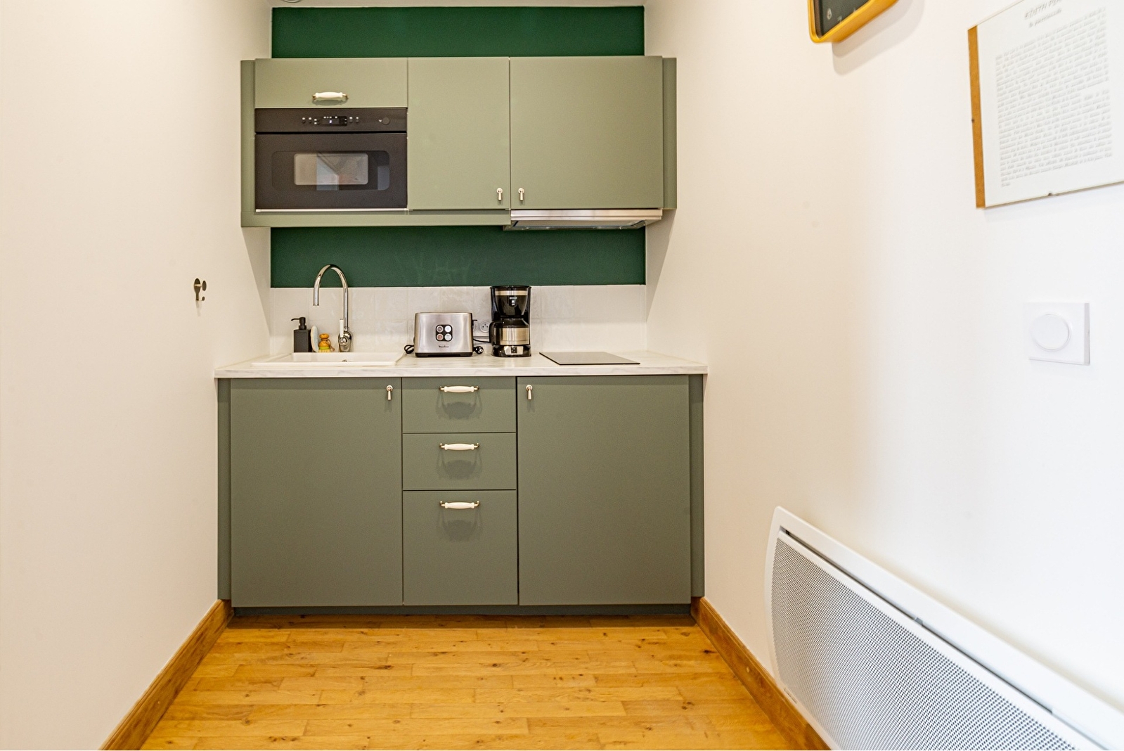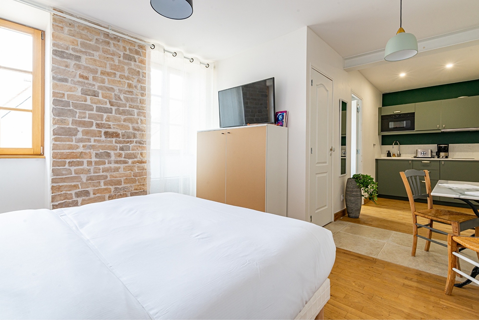 Composé d'un grand lit double Queen size, d'une cuisine équipée et d'une salle de bain dotée d'une grande douche à l'italienne avec double vasque (WC séparés), le logis EDITH est très agréable à vivre, parfait pour un séjour en amoureux. Il est baigné d'une lumière douce que reflète tout un joli mur en pierre de Bourgogne. Sur demande, nous pouvons vous fournir gratuitement un lit parapluie, un joli berceau et/ou une chaise haute pour bébé. Durant votre séjour, si vous souhaitez un ménage supplémentaire, sélectionnez l'option "ménage supplémentaire" au moment de la réservation. Dès votre arrivée, nous programmerons ensemble le jour de votre choix. Des petits-déjeuners et tapas sont servis au bar de La Maison George. Une formule à emporter et déguster en chambre est possible sur demande ! Demandez au bar directement à votre arrivée.