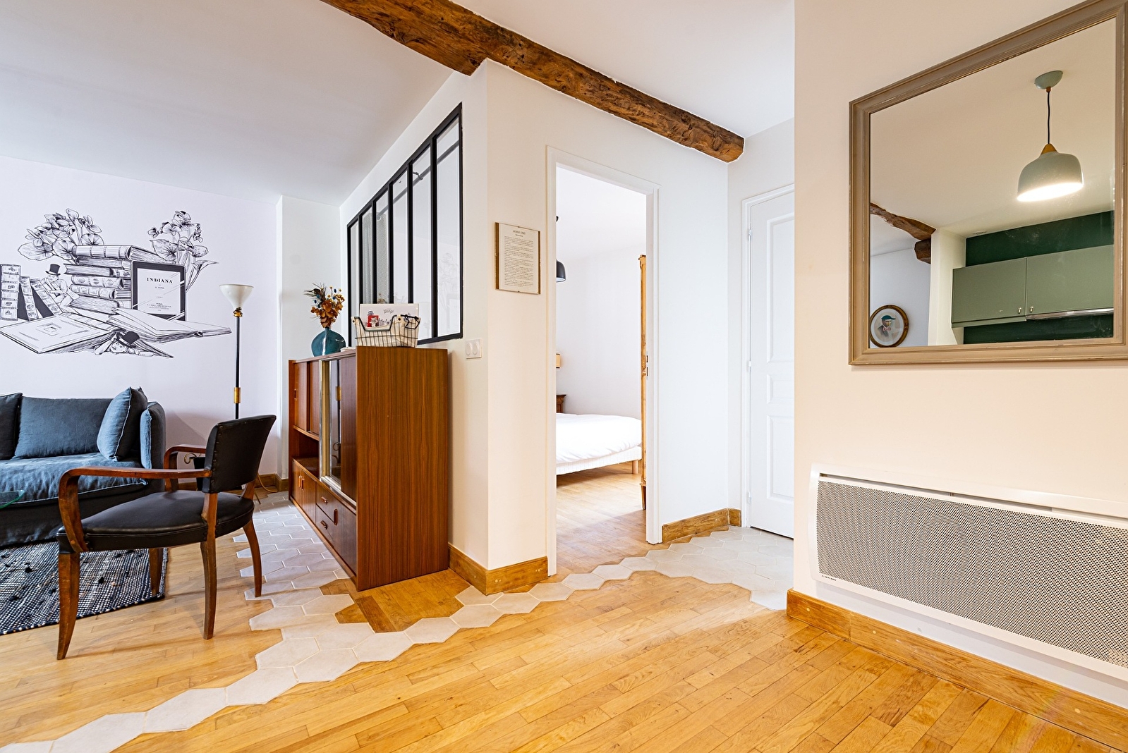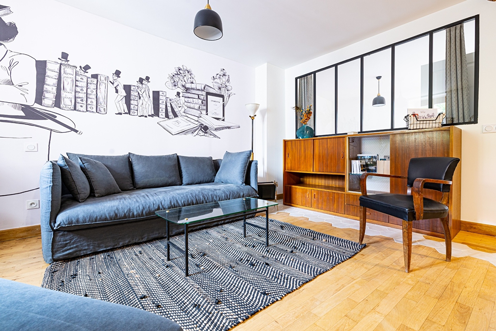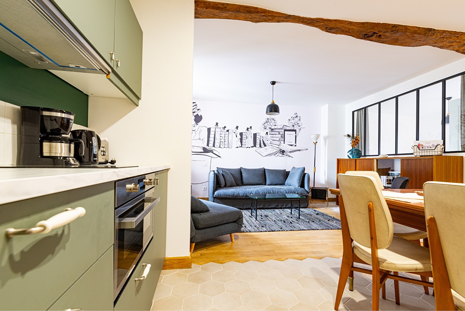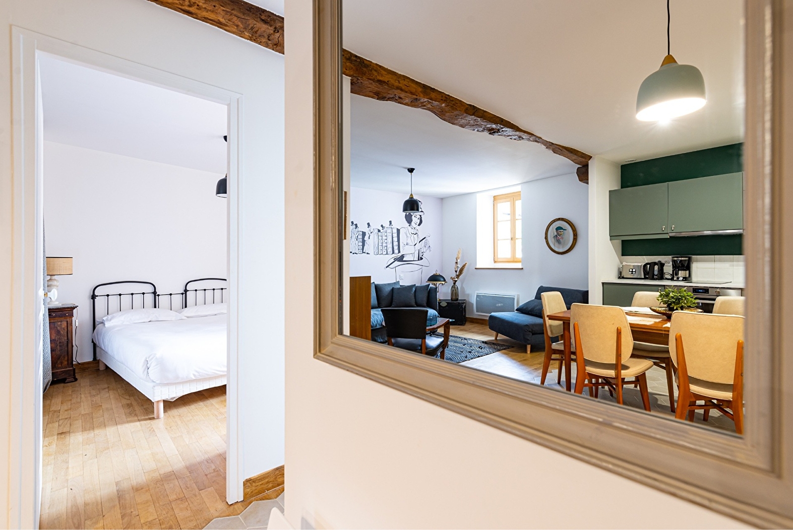 Notre plus grand logis (50m2) avec ses deux belles pièces bénéficie d'un très bel espace de vie avec son grand salon meublé d'un canapé lit (160cm) et d'un fauteuil convertible (90cm), attenante sa cuisine équipée d'un coin repas pour 5 personnes et d'une TV murale. La chambre est séparée par une élégante verrière et vous permettra de vous reposer dans un lit double Queen size. Les WC sont séparés ainsi que la jolie salle de bain munie d'une douche et d'une baignoire. Ce logis est idéal pour les familles ou les couples qui veulent passer un séjour confortable. Sur demande, nous pouvons vous fournir gratuitement un lit parapluie, un joli berceau et/ou une chaise haute pour bébé. Durant votre séjour, si vous souhaitez un ménage supplémentaire, sélectionnez l'option "ménage supplémentaire" au moment de la réservation. Dès votre arrivée, nous programmerons ensemble le jour de votre choix. Des petits-déjeuners et tapas sont servis au bar de La Maison George. Une formule à emporter et déguster en chambre est possible sur demande ! Demandez au bar directement à votre arrivée.