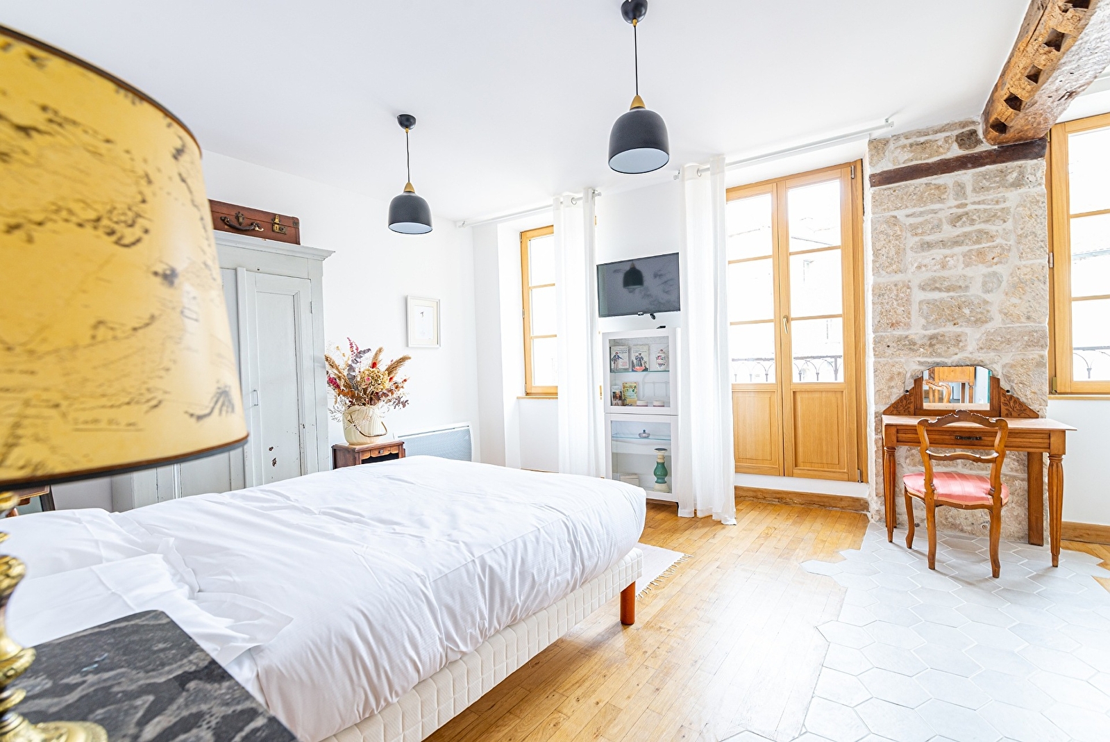 Composé d'un grand lit double Queen size, d'une cuisine équipée, d'une salle de bain dotée d'une grande douche à l'italienne (WC séparés), le logis JEANNE bénéficie d'une belle lumière grâce à ces quatre fenêtres dont une s'ouvrant sur un joli balcon qui mène sur la place des Anciennes Halles et sur la terrasse du café. Sur demande, nous pouvons vous fournir gratuitement un lit parapluie, un joli berceau et/ou une chaise haute pour bébé. Durant votre séjour, si vous souhaitez un ménage supplémentaire, sélectionnez l'option "ménage supplémentaire" au moment de la réservation. Dès votre arrivée, nous programmerons ensemble le jour de votre choix. Des petits-déjeuners et tapas sont servis au bar de La Maison George. Une formule à emporter et déguster en chambre est possible sur demande ! Demandez au bar directement à votre arrivée.