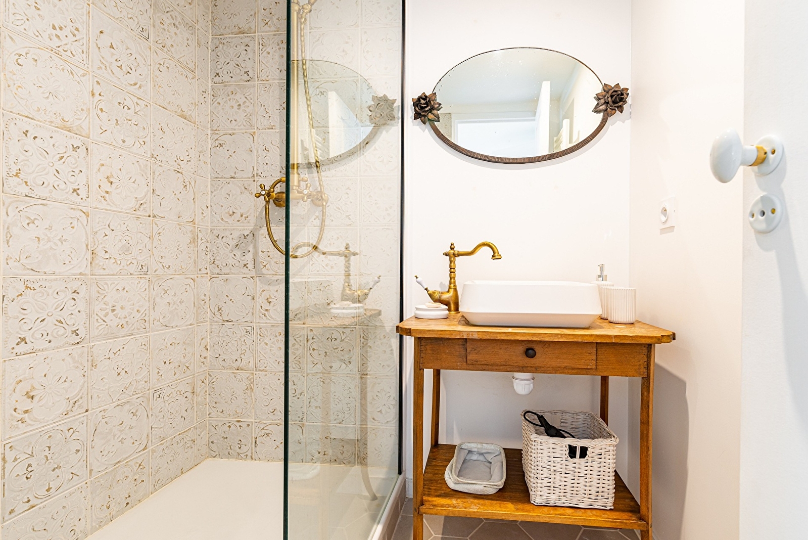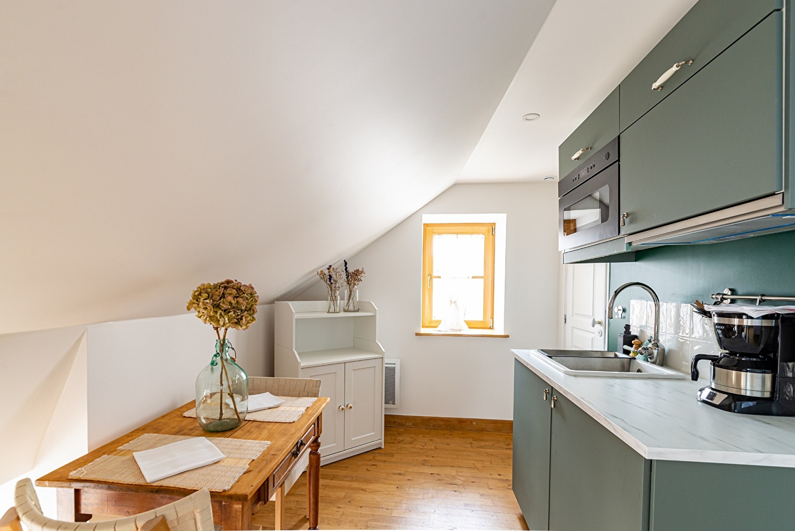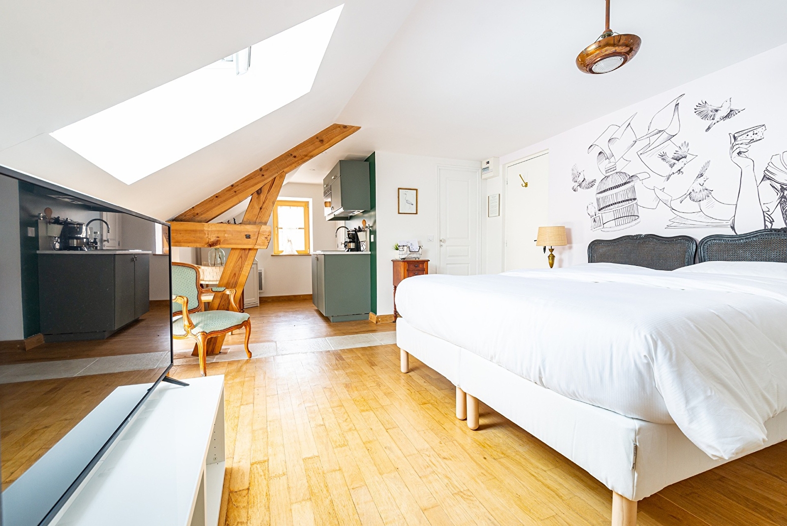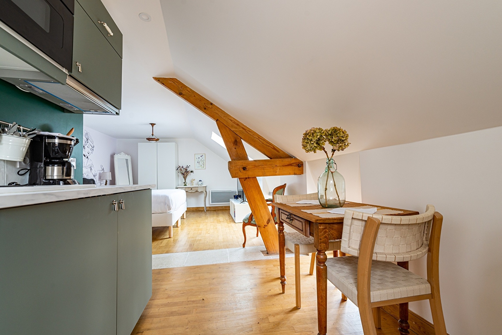 Composé d'un grand lit double King size (ou deux lits simples séparés), d'une cuisine équipée et d'une salle de bain dotée d'une grande douche à l'italienne, le logis OLYMPE est idéal pour un séjour en amoureux ou entre amis (lits séparés). Avec ses poutres apparentes et ses jolis points de vue sur le village, il bénéficie d'une belle lumière particulièrement au matin. Sur demande, nous pouvons vous fournir gratuitement un lit parapluie, un joli berceau et/ou une chaise haute pour bébé. Durant votre séjour, si vous souhaitez un ménage supplémentaire, sélectionnez l'option "ménage supplémentaire" au moment de la réservation. Dès votre arrivée, nous programmerons ensemble le jour de votre choix. Des petits-déjeuners et tapas sont servis au bar de La Maison George. Une formule à emporter et déguster en chambre est possible sur demande ! Demandez au bar directement à votre arrivée.