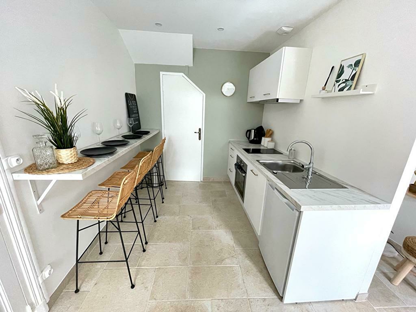 >Cuisine entièrement équipée pour se sentir comme chez soi (frigo, hotte, plaques de cuisson, four...)