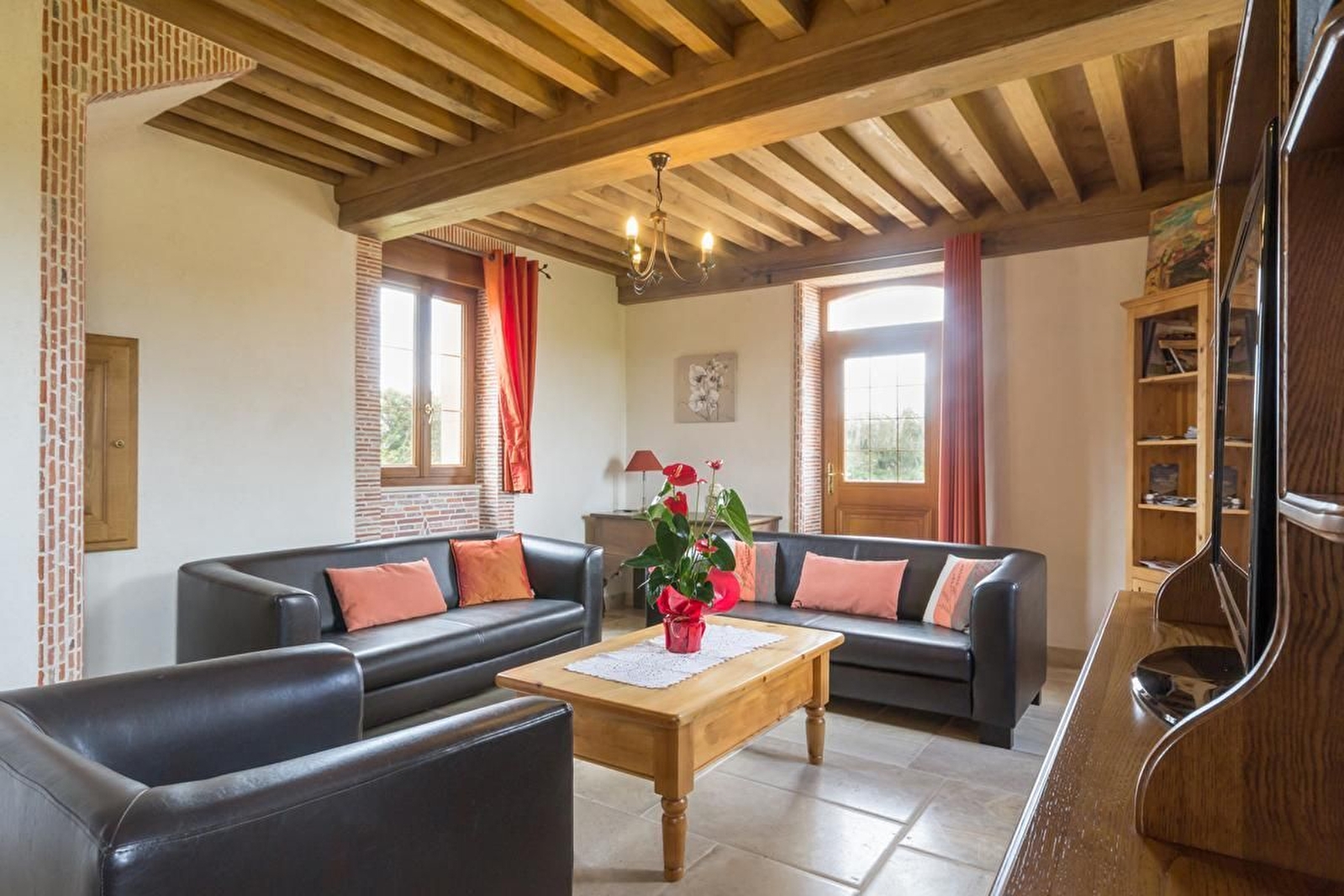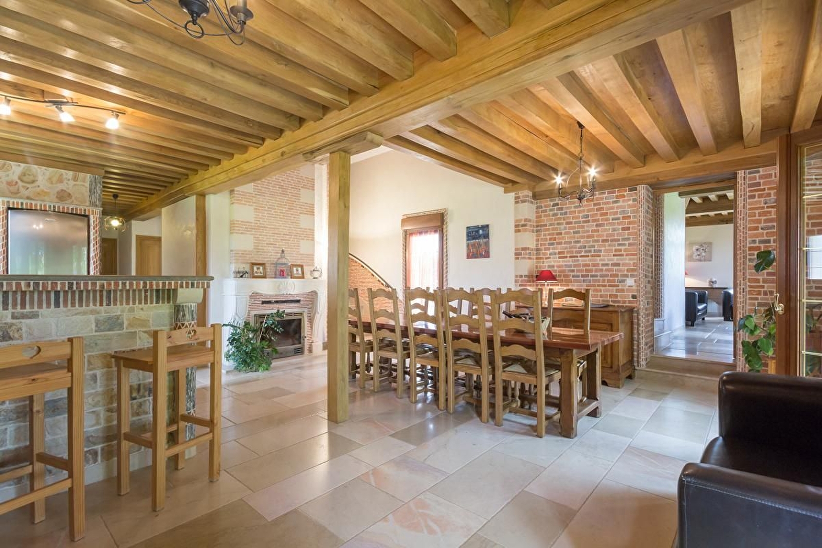 Au rez-de-chaussée : grand séjour avec salle à manger, cuisine équipée et cheminée insert. Beau salon avec cheminée à foyer ouvert. Une chambre avec un lit 160. Salle de bains et douche à l'italienne. WC.Etage desservi par 2 escaliers : 1 chambre avec 2 lits en 90, avec salle d'eau et WC attenants, 1 chambre avec 1 lit 140 et 1 lit 90, 1 chambre avec 2 lits 90 superposés et 1 chambre avec 1 lit 140. 2 salles d'eau dont une avec WC. Mezzanine avec coin jeux de société. Lit bébé en bois à barreaux et 1 chaise haute. 2 lits pliants pour 2 personnes supplémentaires.. Chauffage géothermie et pompe à chaleur.