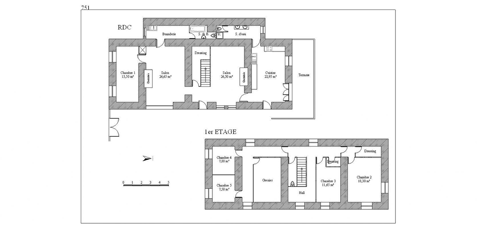 Rez-de-chaussée carrelé : cuisine aménagée, salle à manger avec cheminée insert et salon avec cheminée à foyer ouvert. 1 chambre avec 2 lits en 90 jumelables, Salle d'eau et salle de bains, WC, buanderie.