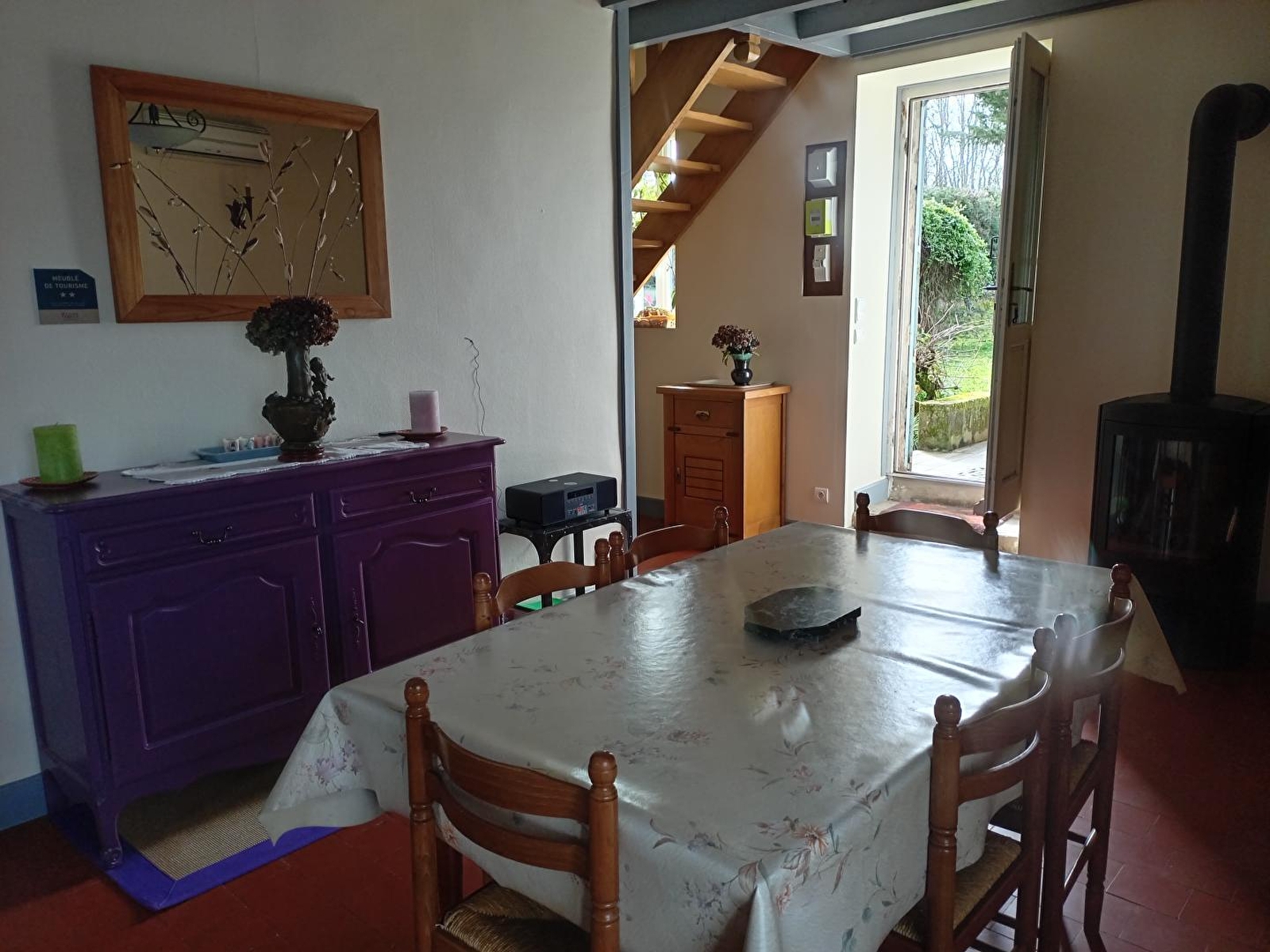 Composition : Maison mitoyenne. Wifi (fibre). Chauffage électrique (PAC dans pièce de vie) + poêle à bois. Rdc surélevé (5 marches) : séjour-cuisine, 1 chambre (lit 2 p. 140x190cm), salle d'eau (douche), Wc indépendant. 1er étage : salon TV sur mezzanine palière, 1 chambre (2 lits 1 p. 80x190cm), Wc indépendant. Terrasse couverte + terrasse + jardin clos (300m²) + parking privés. Toutes commodités à 12 km.