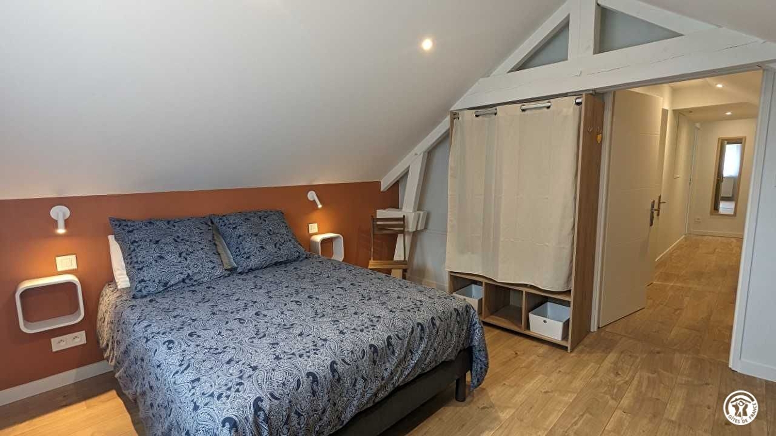 A l'étage : 2 chambres avec chacune 1 lit de 140 cm, 1 chambre avec 2 lits de 90 cm jumelables + 1 BZ. 1 salle d'eau avec WC. Équipement bébé sur demande : lit parapluie, chaise haute. Buanderie avec lave-linge et sèche-linge dans un local fermé.