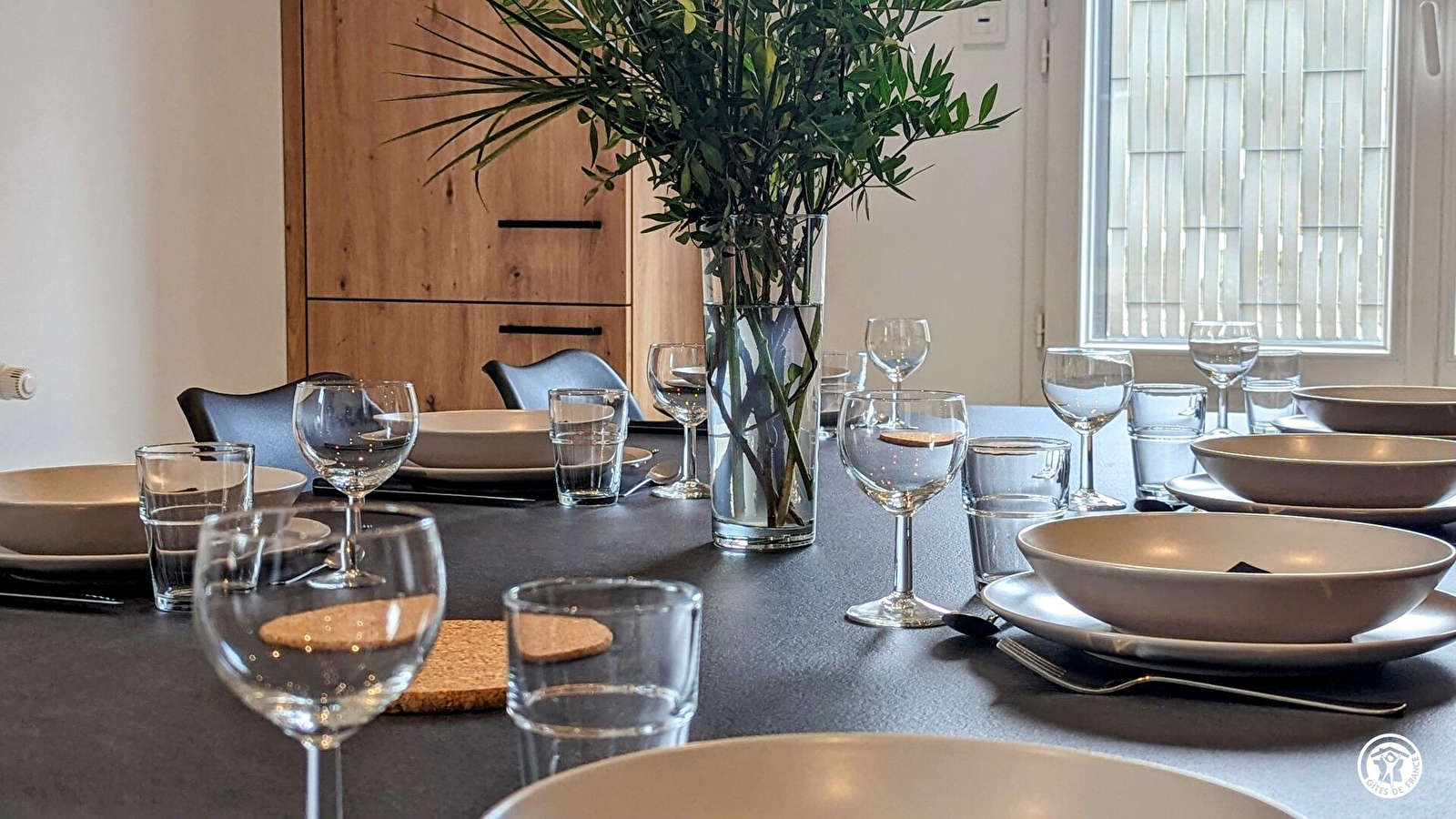 A l'extérieur : Terrasse couverte par voile d'ombrage, salon de jardin, barbecue, brasero, 1 salon de détente, 1 terrain de pétanque, 1 local pour les vélos - Gîte situé à proximité d'une route passante (pas de nuisance à l'intérieur). Animaux acceptés sur demande. Parking privatif, prise renforcée pour la recharge des véhicules électriques (recharge lente). Possibilité de disposer d'un local pour mettre les motos à l'abri (gîte "Accueil motard"). Possibilité de garer 4 voitures dans la cour.