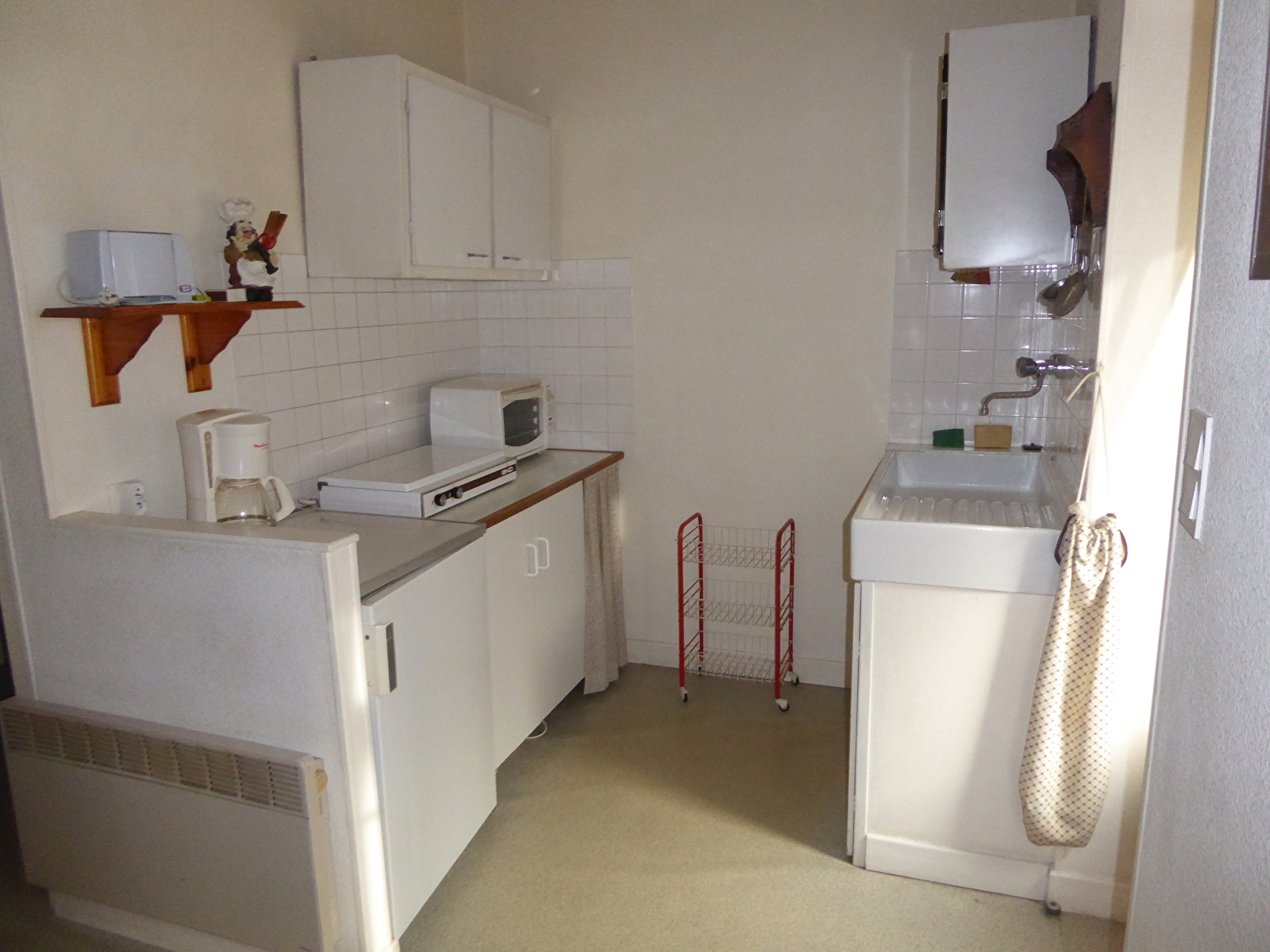 Ce meublé est composé d'un séjour avec TV, d'un coin cuisine avec micro-ondes, cafetière et bouilloire électriques, grille-pain, ventilateur, une chambre avec un lit 2 personnes et un lit 1 personne, une salle de bain avec douche, lavabo WC, un terrain arboré de l'autre côté de la rue avec salon de jardin.