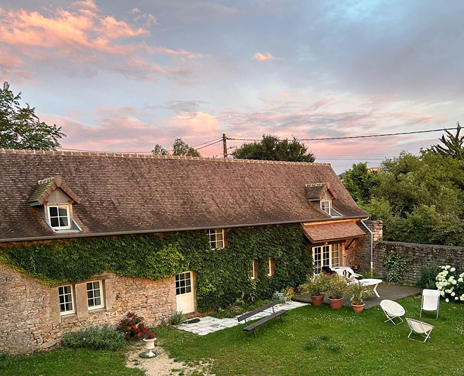 Ravissant bâti de caractère du 18ème siècle intégralement restauré avec soins & chargé d'histoire - anciennes écuries d'un authentique relais de chasse datant de la même époque, toujours existant et jouxtant le gîte, lui également rénové dans les règles de l'art - niché sur une vaste propriété familiale de 7000m², parfaitement entretenue & soignée (grand terrain végétalisé et arboré accessible dans sa totalité en cas d'absence des propriétaires), sise en lisière immédiate de prairies où pâturent les paisibles célèbres vaches charolaises. Calme absolu en pleine campagne chalonnaise, au sein d'un charmant petit hameau rural typique blotti en cœur de bocage vallonné au pied d'une colline boisée, au creux du bucolique vallon verdoyant de la haute vallée du Guye (à la source même de cette rivière poissonneuse). Magnifique cadre paysagé préservé, entre prairies, rivières & forêt. Site ultra reposant & relaxant. A deux pas du pittoresque petit village de Sainte-Hélène (église romane du XIIème & riche patrimoine lié à l'eau : lavoirs, fontaines, puits, anciens moulins…). Spacieux gîte de très bon confort. Vaste pièce de vie « cathédrale » de 50m² sublimée par la majestueuse charpente d'origine (imposant volume). Chaleureux cachet campagnard aux accents contemporains mixant traditions & modernité dans un élégant « mix & match » (beau mobilier de famille). Ambiance douillette & cosy. Agréable jardin privatif engazonné & fleuri bordé des superbes murs d'enceinte historiques en pierres.