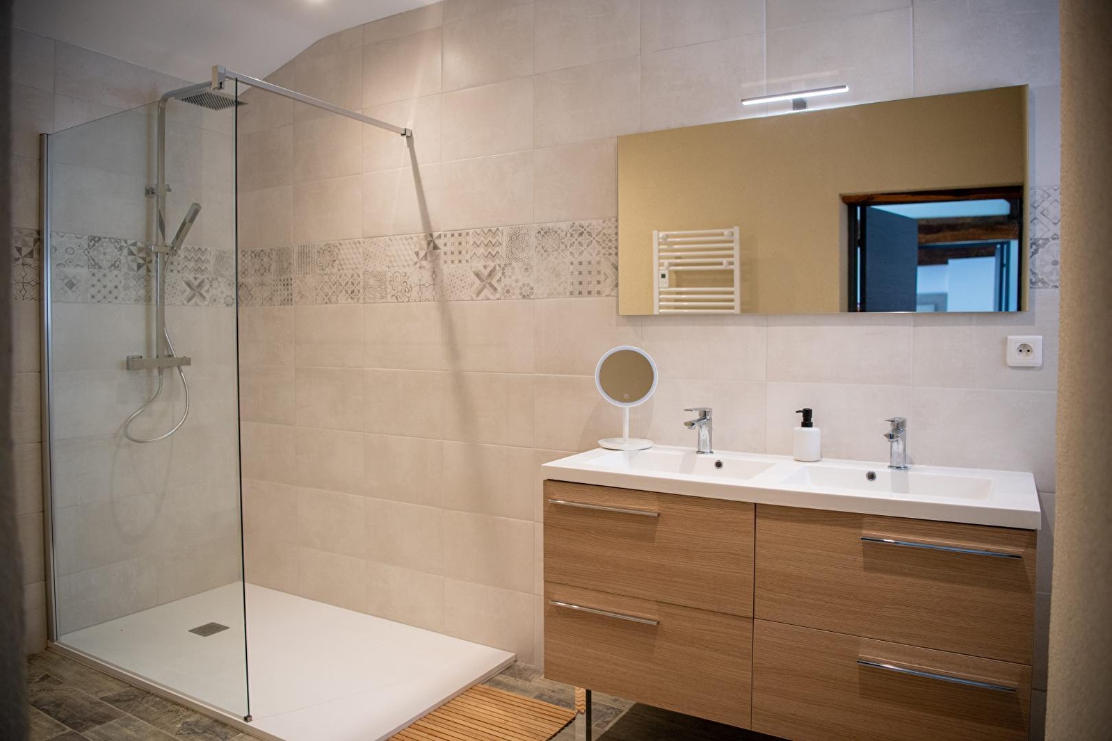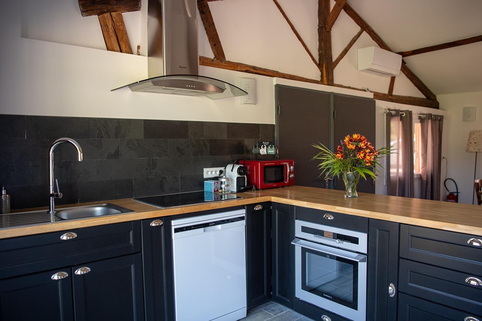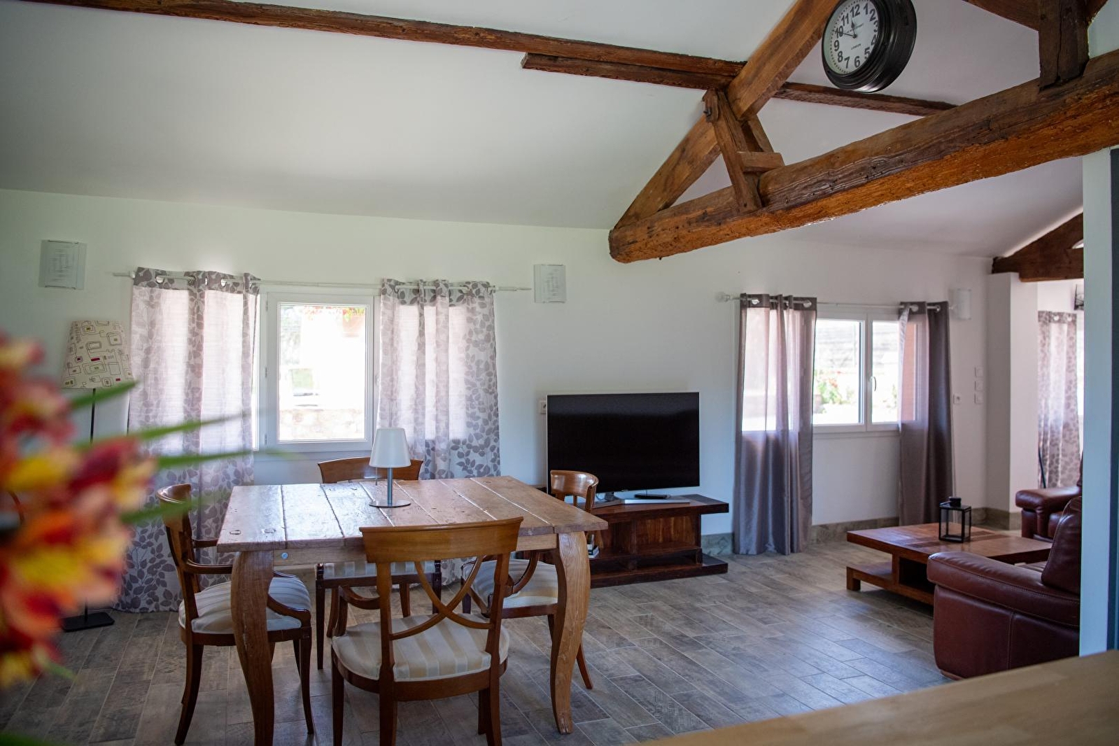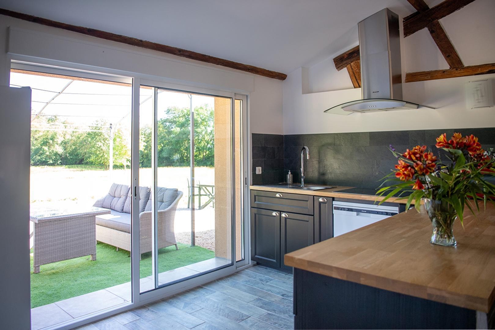Composition : Propriété comprenant 4 gîtes et le bar à vin des propriétaires (ouvert de mai à août uniquement le WE). Gîte mitoyen à autre gîte dans ancienne dépendance (indépendance totale). Wifi (fibre). Chauffage PAC. Climatisation. Lave-linge dans buanderie commune (accès par extérieur). Plain-pied : séjour-cuisine-salon, 2 chambres (lit 2 p. 160x200cm dans chaque), salle d'eau (douche), Wc indépendant. Terrasse + terrasse abritée + parking privés. Terrain 1.4 ha (cour + jardin avec espace terrasse "barbecue" / brasero-plancha-four à pizza) + local vélos en commun. Toutes commodités à 1 km. Supermarché 1.5 km.