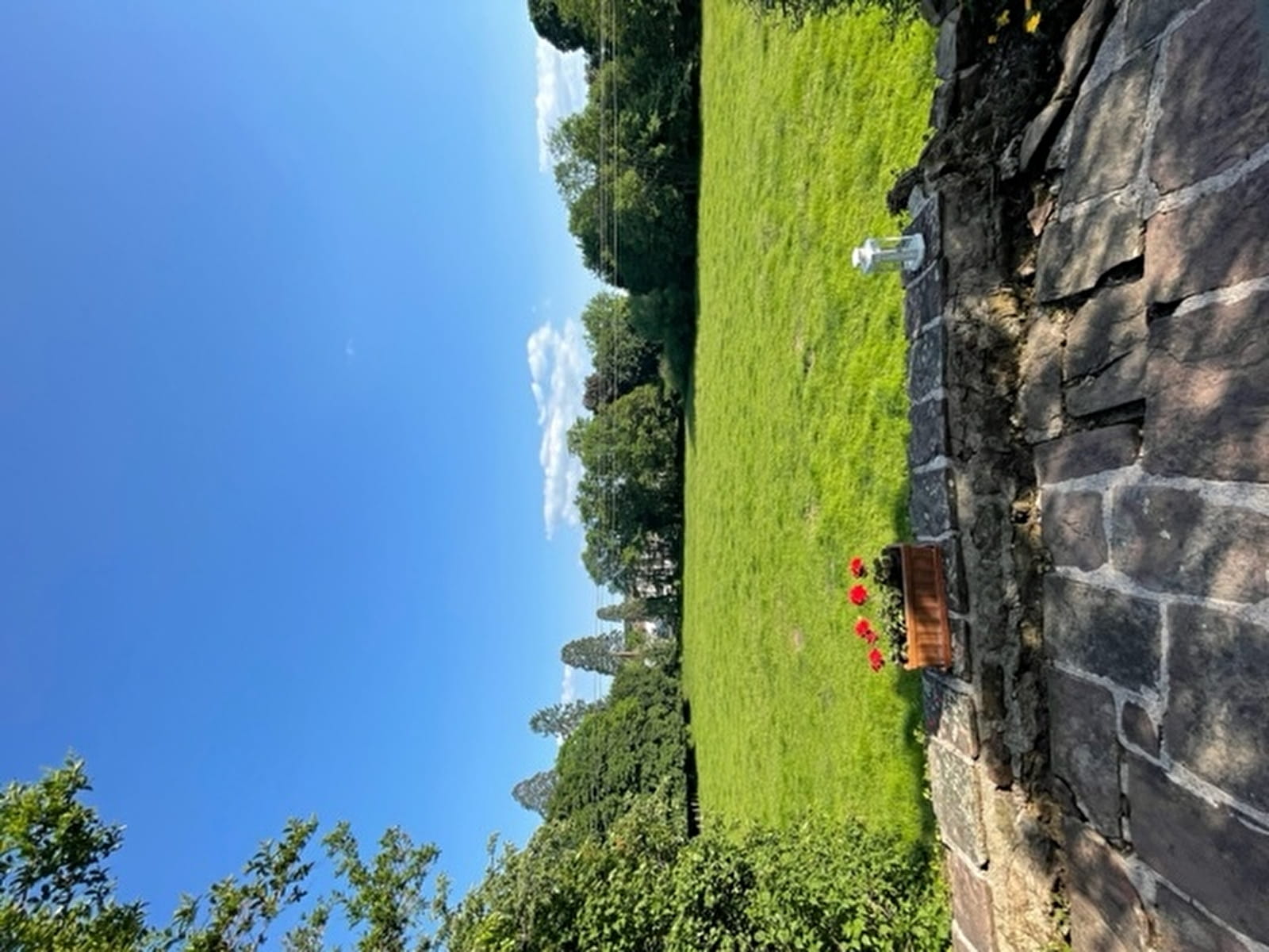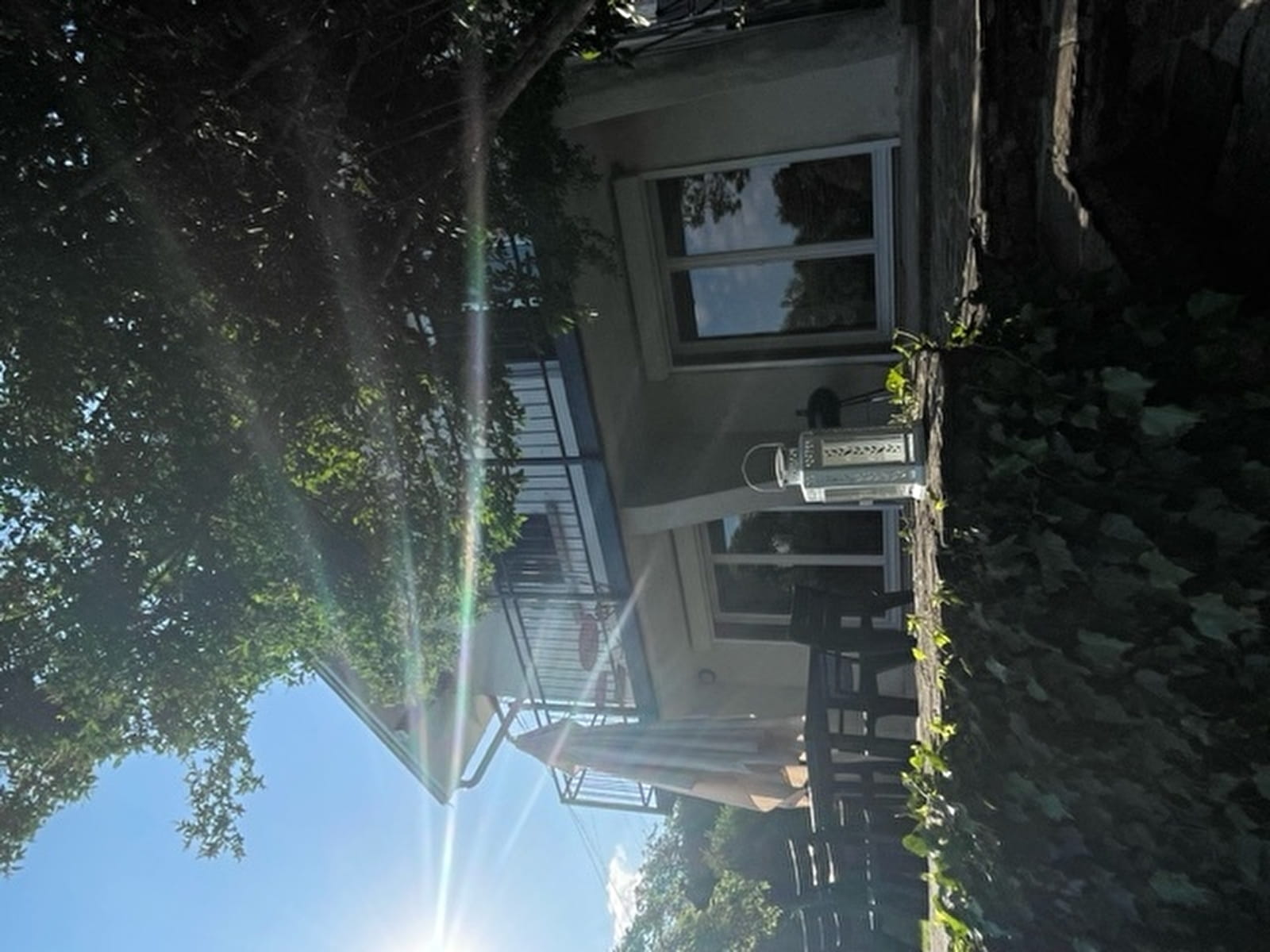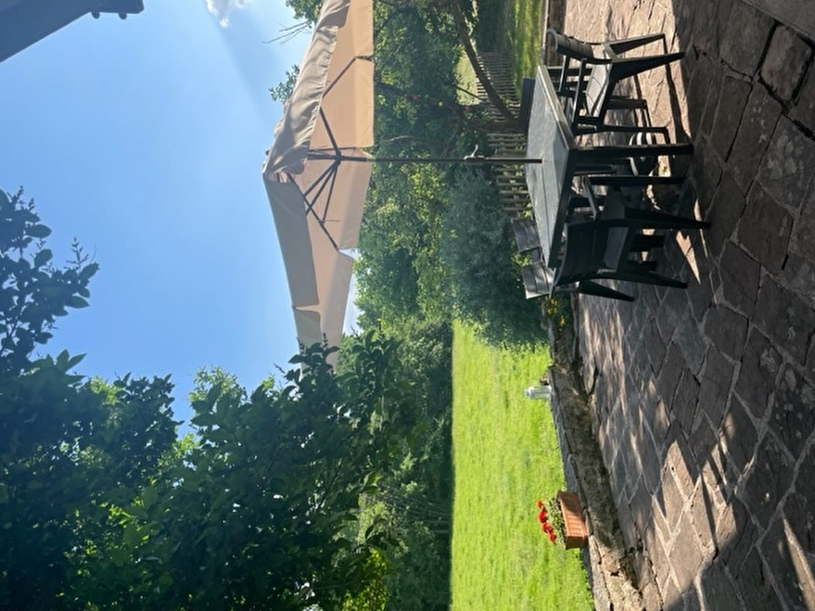 La maison dispose d'un balcon au niveau des chambres avec petite table et chaises et d'une belle terrasse + jardin (environ 400m2) avec vue sur la campagne et la rivière à 5 minutes à pied de toutes les commodités du bourg.