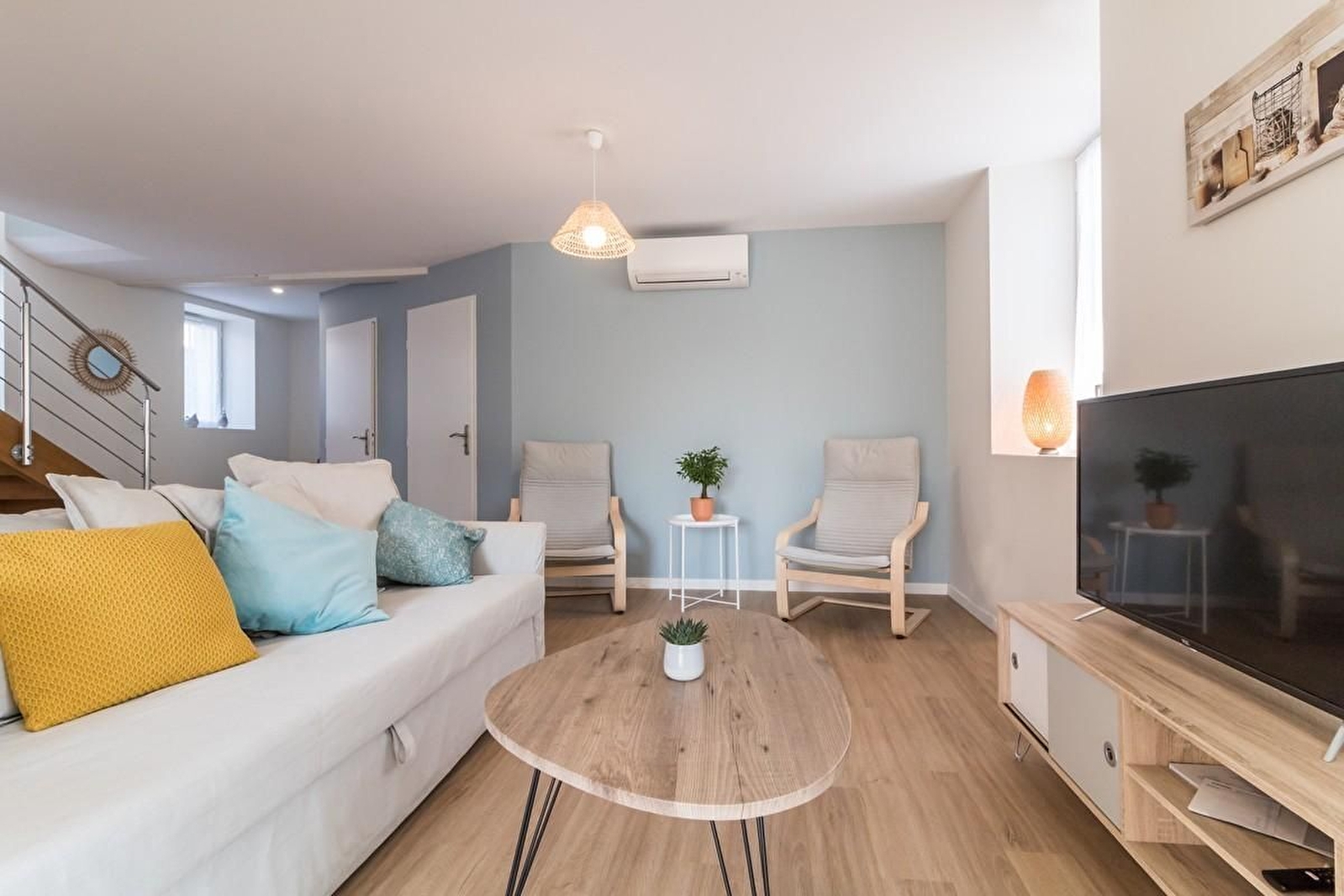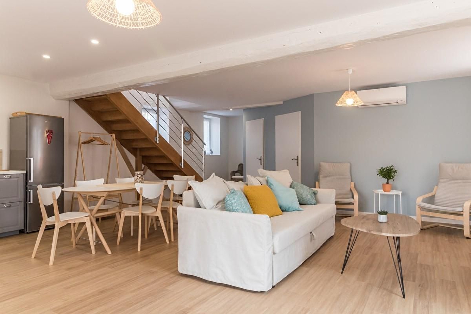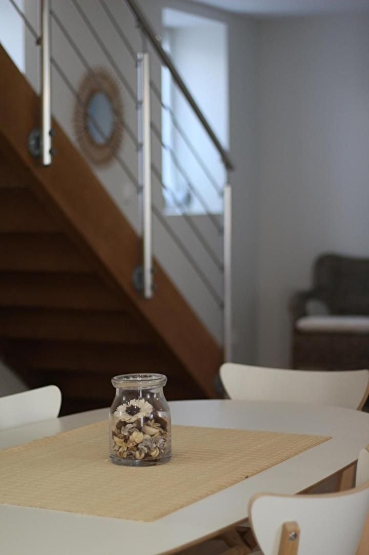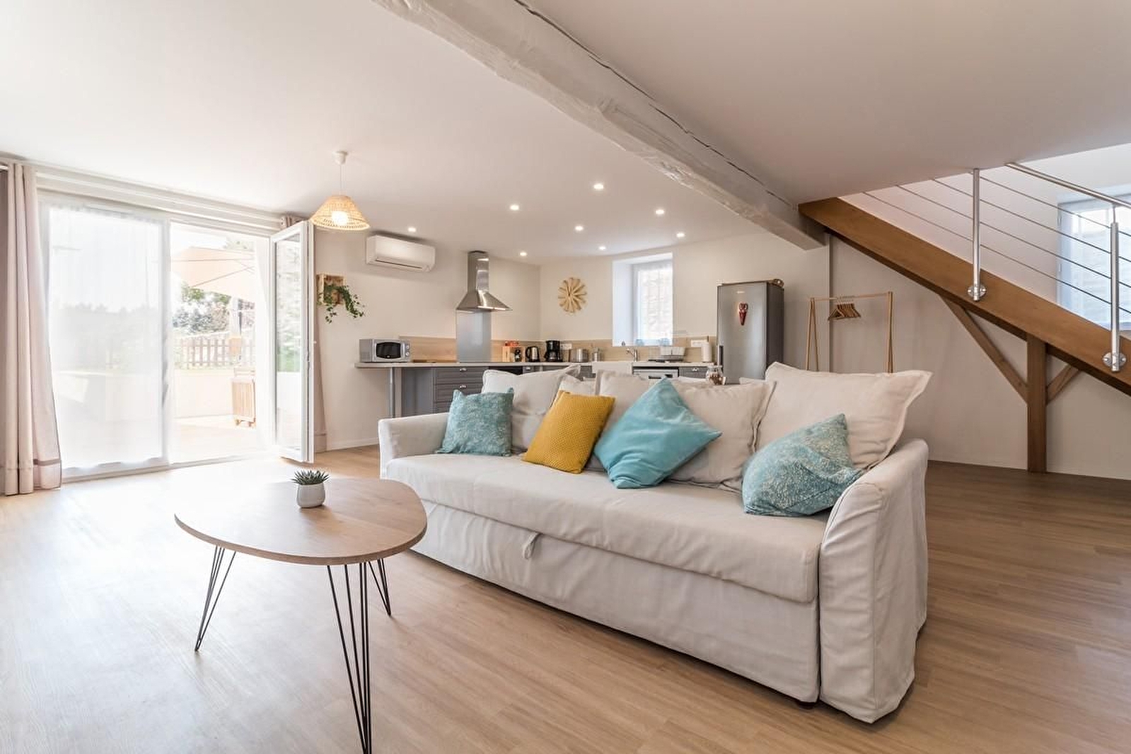 Rez-de-chaussée : grand séjour ouvert avec cuisine intégrée, espaces repas et salon avec canapé convertible (2 couchages possibles en supplément). WC suspendu indépendant. Buanderie. Lit bébé et chaise haute sur demande.