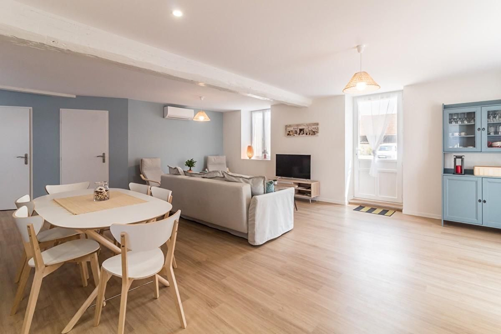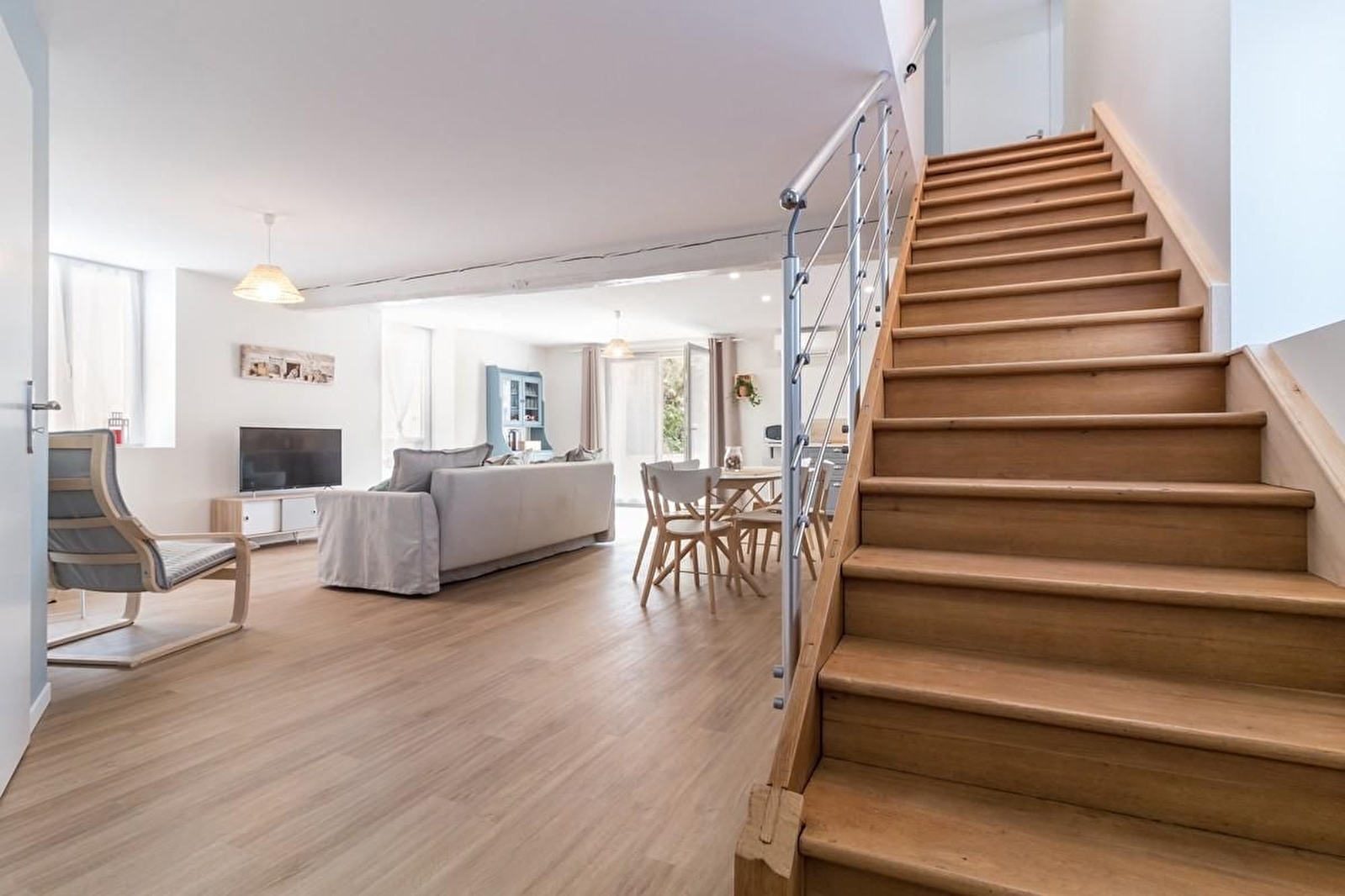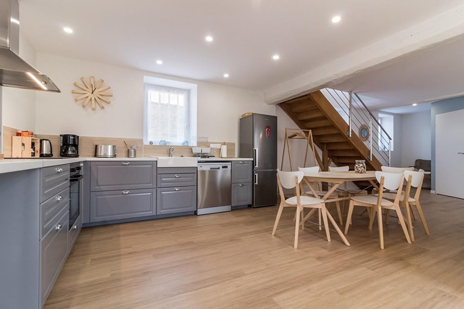Rez-de-chaussée : grand séjour ouvert avec cuisine intégrée, espaces repas et salon avec canapé convertible (2 couchages possibles en supplément). WC suspendu indépendant. Buanderie. Lit bébé et chaise haute sur demande.