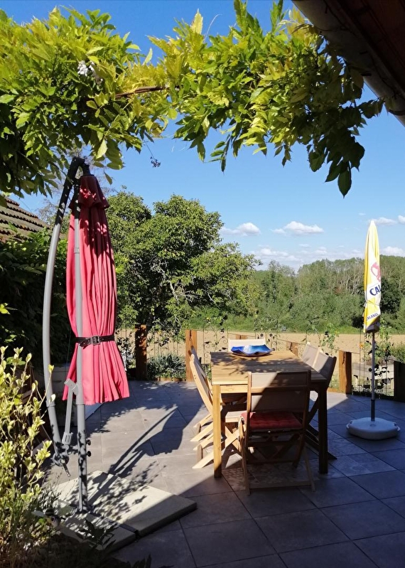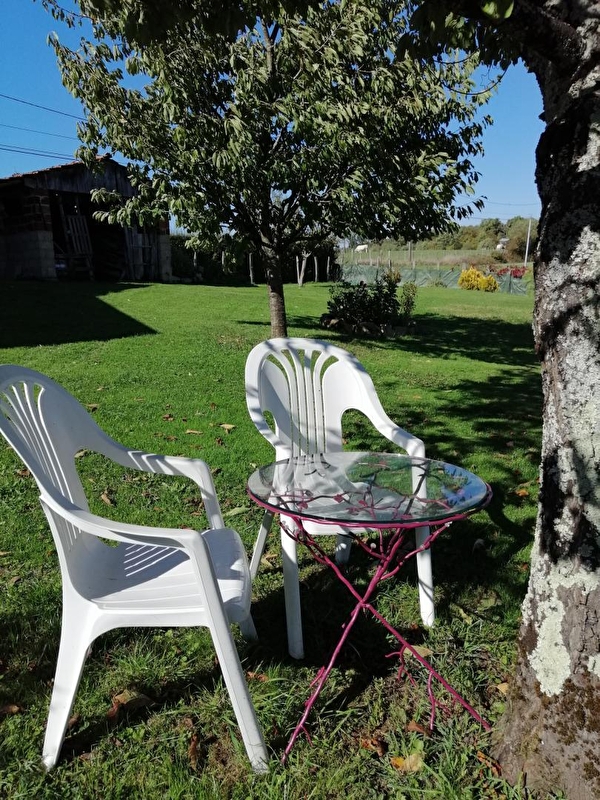 Composition : Maison individuelle voisinant maison de la propriétaire (totale indépendance). Chauffage électrique. Wifi (fibre). Lave-linge + sèche-linge dans buanderie commune (à l'extérieur). Rdc : séjour-cuisine-salon, 2 chambres (lit 2 p. 180x200cm + lit 1 p. 90x190cm / lit 2 p. 160x200cm) dont une avec accès indépendant possible par l'extérieur (accès intérieur "en enfilade" par autre chambre & salle d'eau), salle d'eau (douche/Wc). Coursive abritée + terrasse + parking privés. Jardin (1500m²) en commun avec propriétaire. Local vélos. Commerces 12 km. Supermarché 10 km.