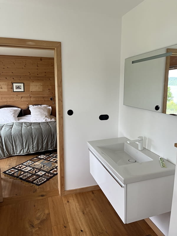 Dans l'espace nuit vous trouverez 3 chambres lumineuses dont 2 avec vue sur le lac. Toutes les chambres ont un accès direct à une salle d'eau ou de bain. Une buanderie avec lave-linge et sèche-linge est également présente.