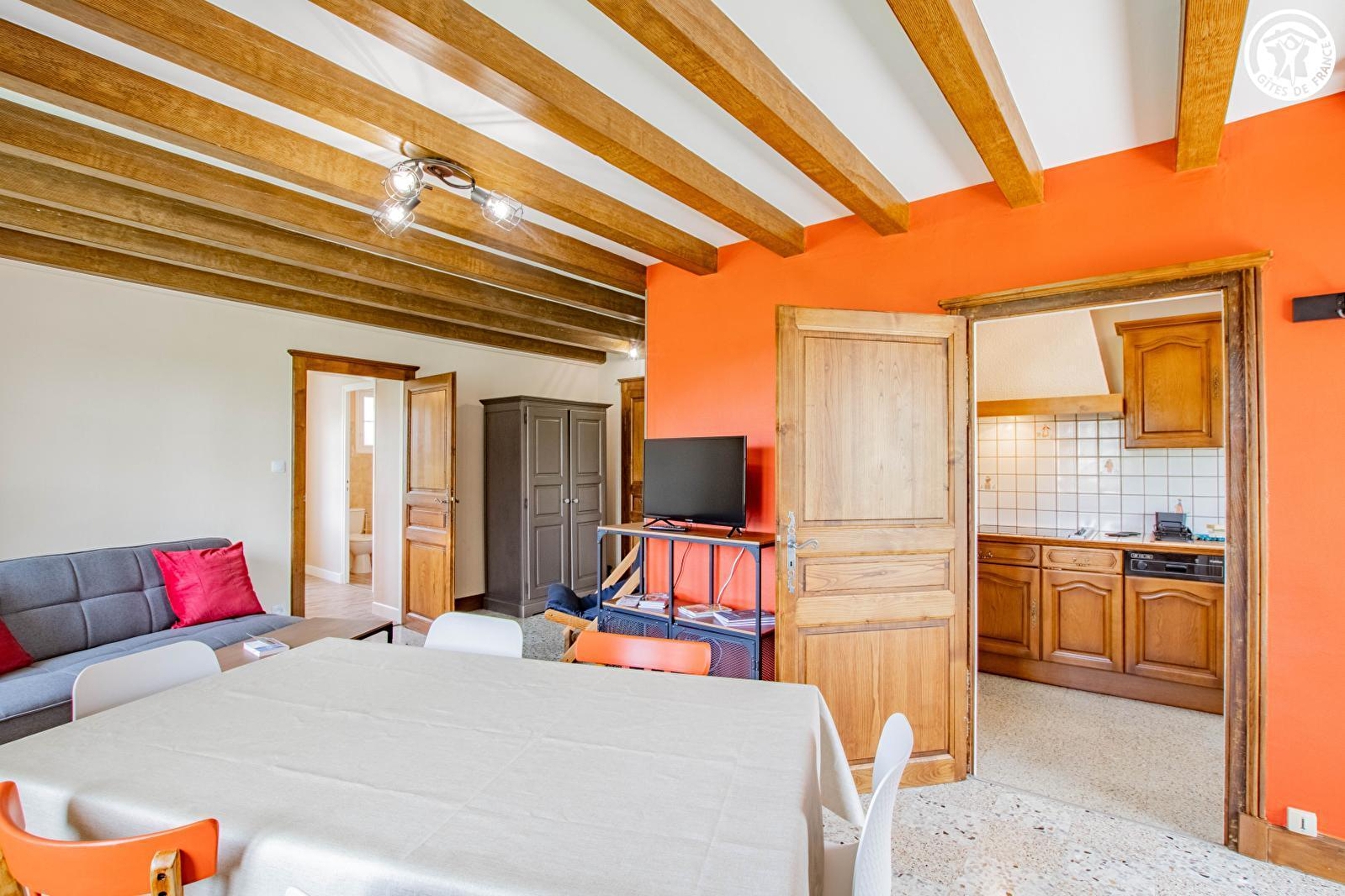 Composition : Gîte au 1er étage de la maison des propriétaires (indépendance totale / accès par escalier extérieur). Wifi (fibre). Chauffage PAC. Lave-linge dans buanderie commune avec propriétaires (accès direct depuis terrasse). Cuisine, séjour-salon, chambre (lit 2 p. 140x190cm), salle d'eau (douche/Wc). Balcon-terrasse + terrasse (sur mini terrain clos) + local vélos + parking privés. Supermarché 8.5 km. Toutes commodités 12 km.