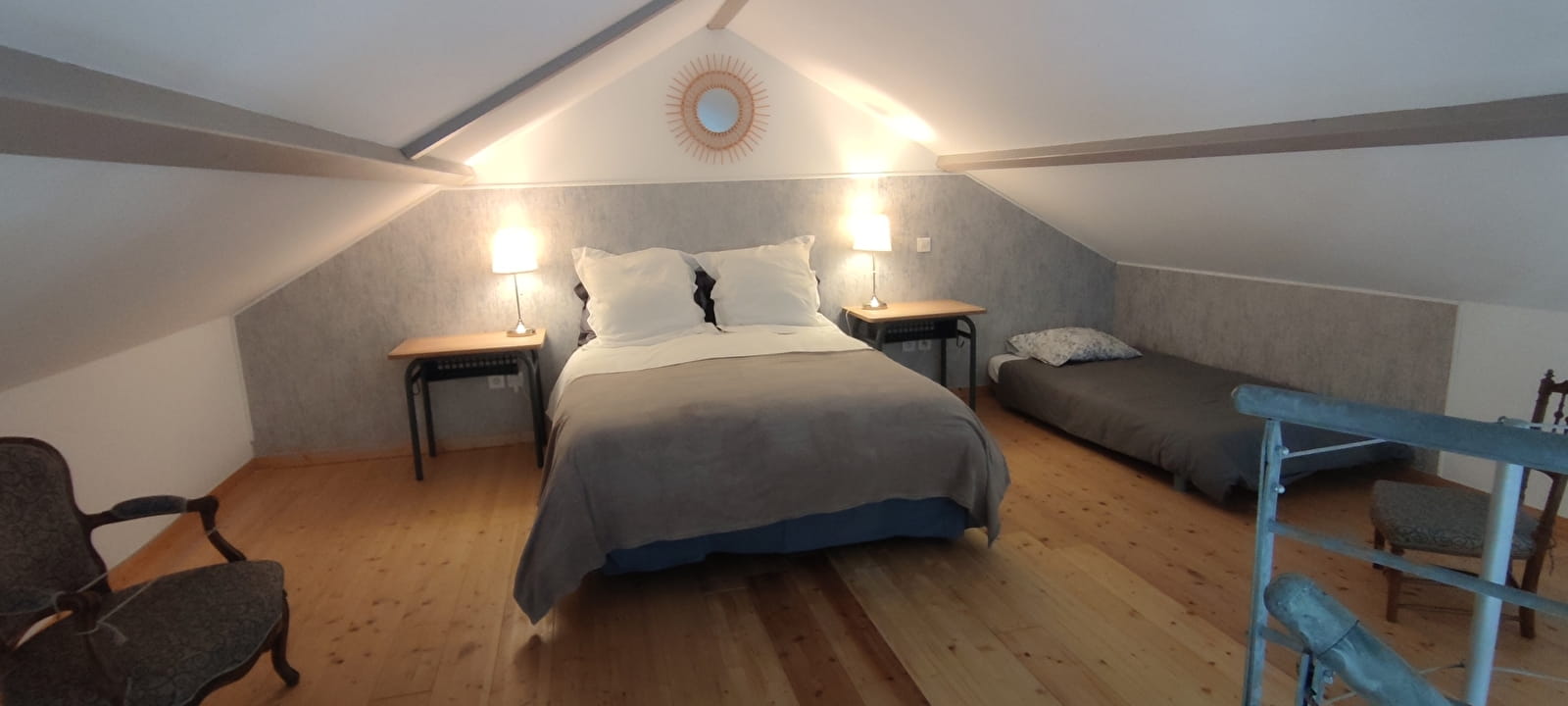 Une mezzanine de 25 m² est meublée d'un lit double, d'un lit simple et d'une commode. Le linge de qualité hôtelière est fourni.