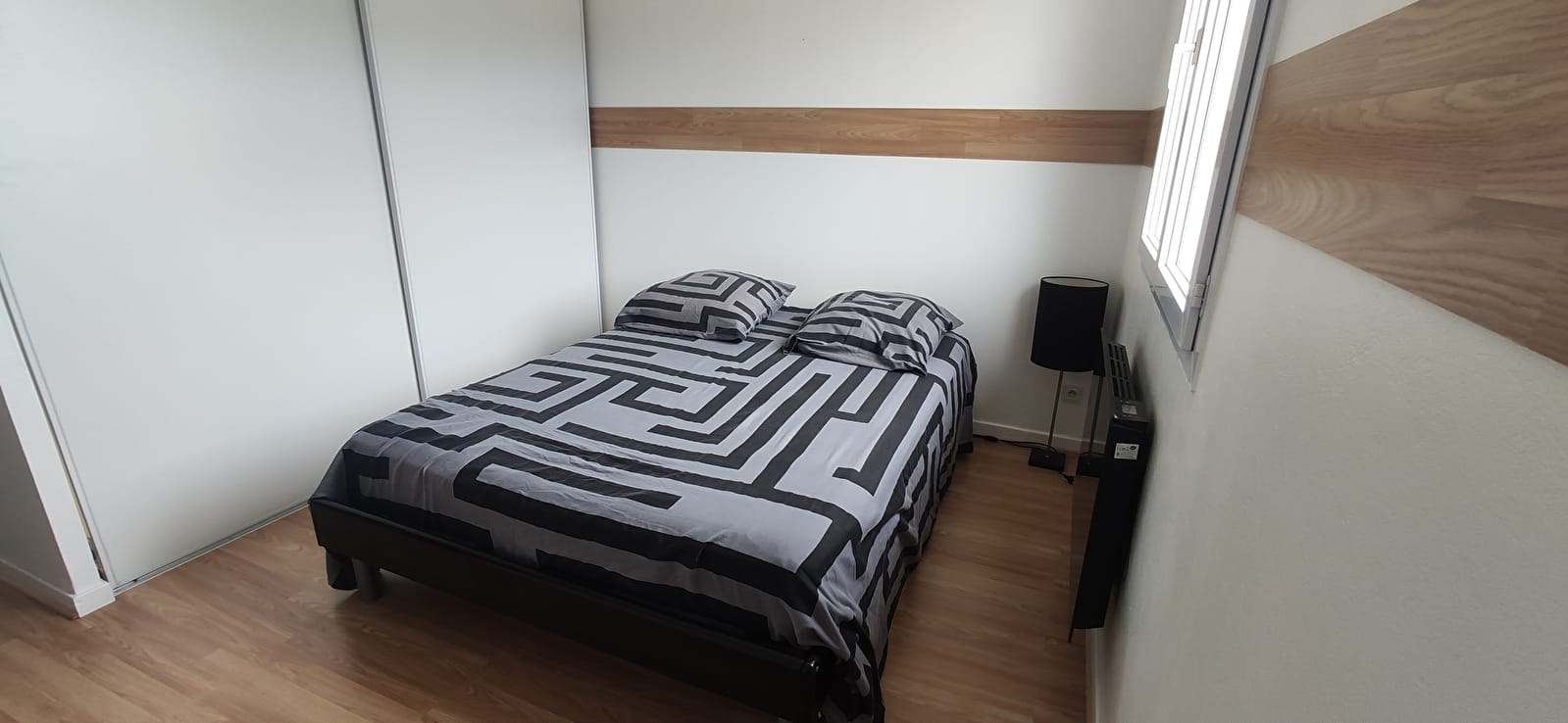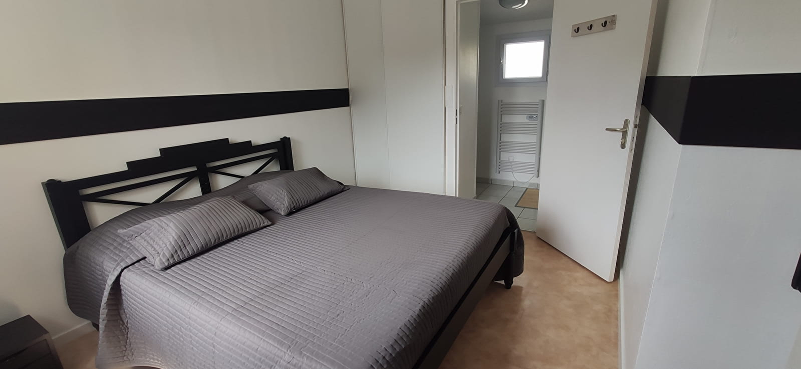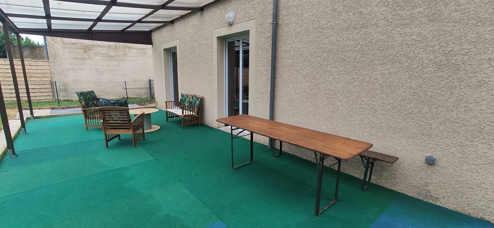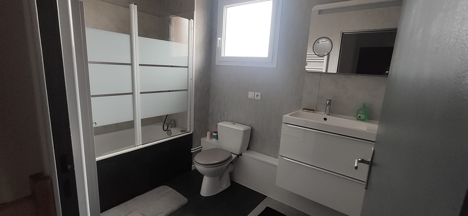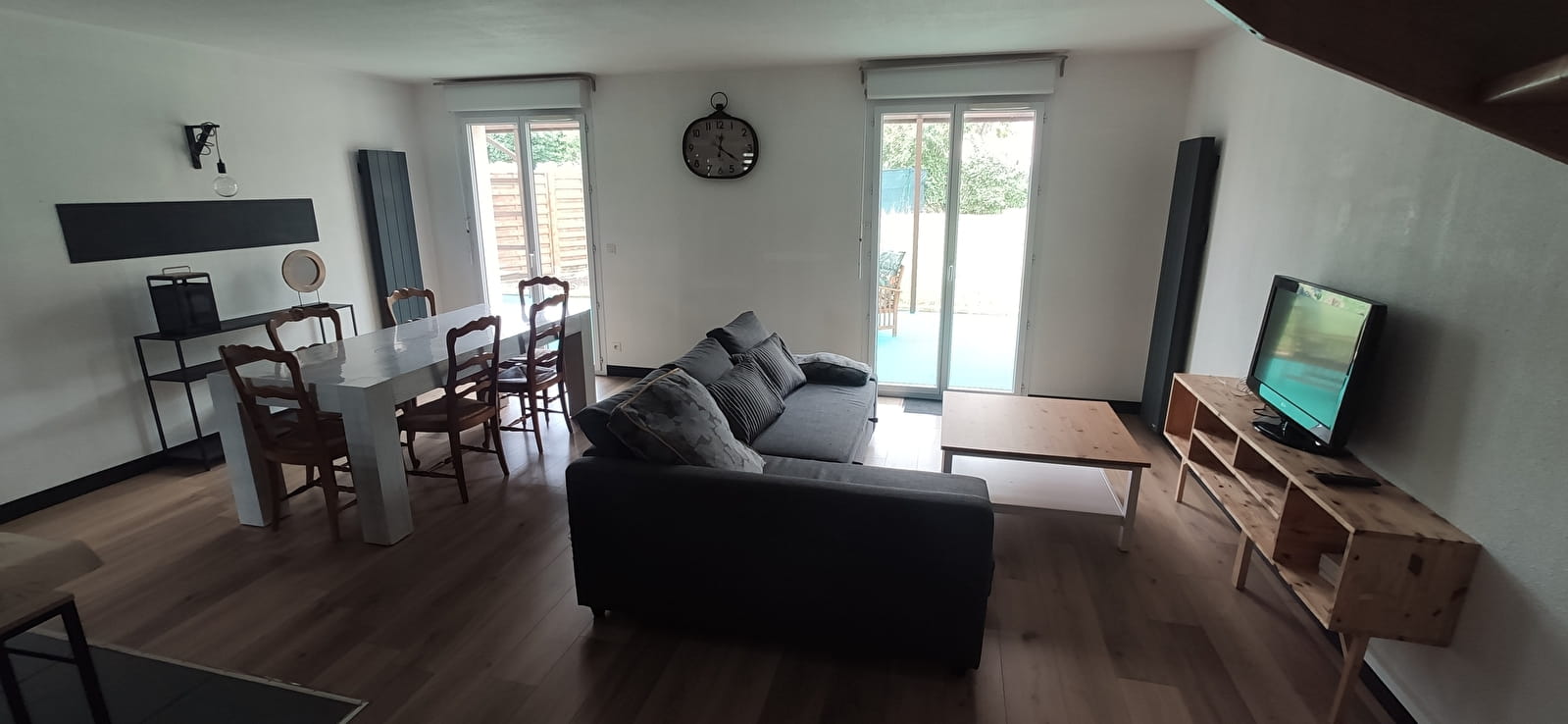 Au rez-de-chaussée : cuisine équipée ouverte sur la salle à manger/salon, canapé convertible, coin télévision, WC. Terrasse couverte donnant sur un petit jardin. La terrasse couverte dispose d’une table pour manger ainsi qu’un salon de jardin.