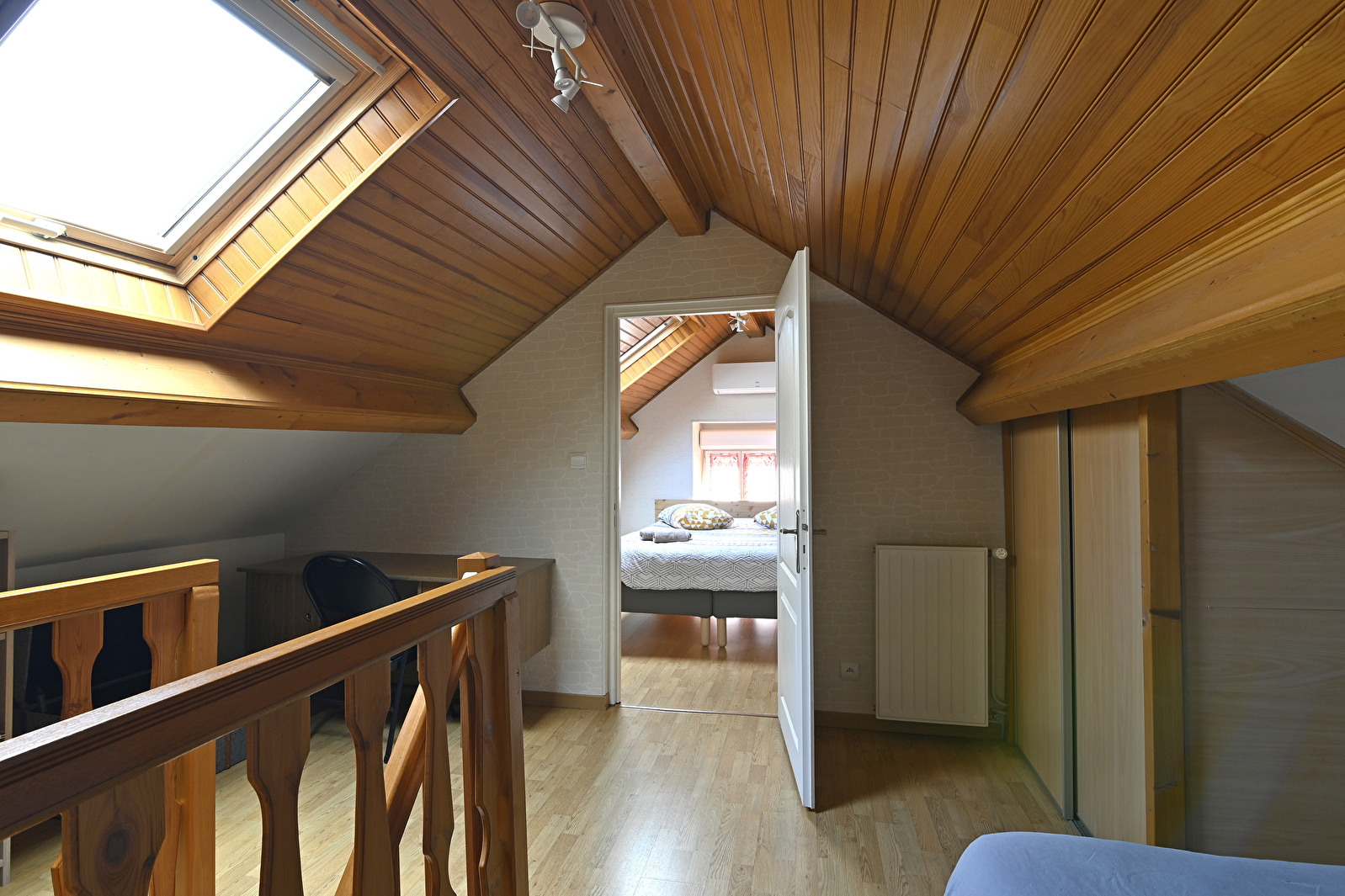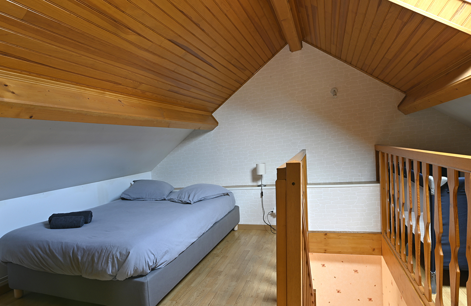 A l'étage : une chambre avec 1 lit double et un deuxième lit double sur la mezzanine.