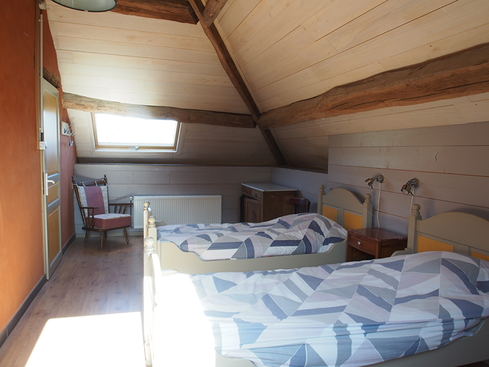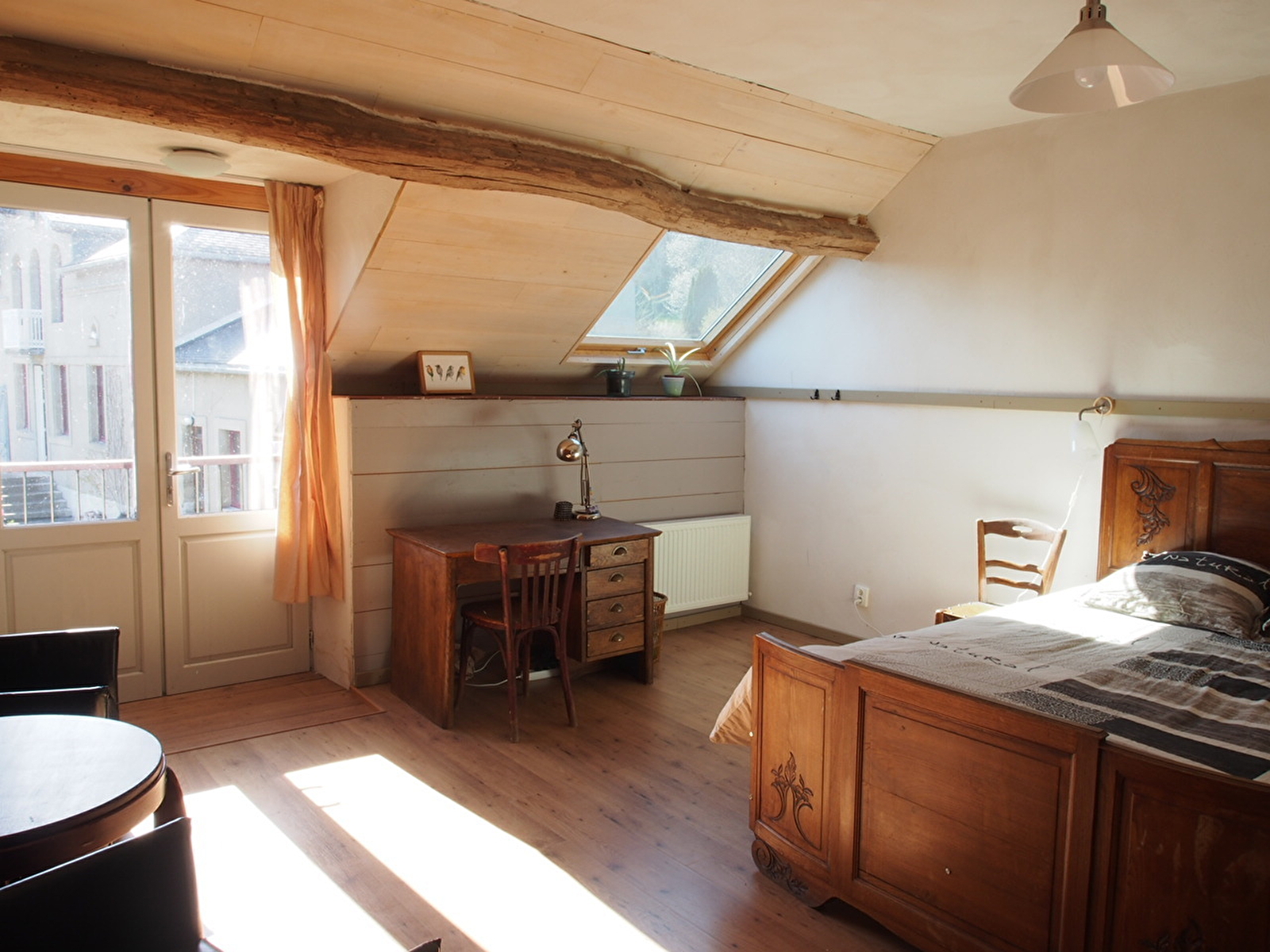 L'entrée donne sur un espace chaleureux alliant cuisine aménagée et séjour et doté d'un poêle de masse pour les soirées d'hiver. Le couloir permettant d'accéder à l'escalier dessert les sanitaires, une petite salle de bains équipée d'un douche et un espace vestiaire pour ranger vestes et chaussures. À l'étage, la première chambre abrite deux lits simples sous un haut-plafond en cathédrale et aux poutres apparentes et peut accueillir un troisième matelas à votre demande. La deuxième chambre comporte un lit double, une table basse et deux fauteuils ainsi qu'un bureau idéalement placé sous le velux et à côté du balcon pour profiter de la luminosité extérieure. À l'arrière vous avez également accès à une terrasse exposée au soleil le matin et à l'ombre l'après-midi ; idéal pour se réveiller avec les premiers rayons du soleil et y déjeuner au frais, face à l'un des vergers en devenir du domaine.