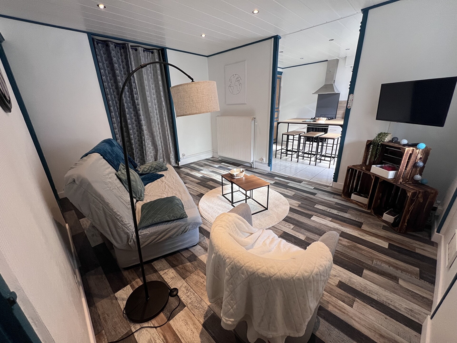 La cuisine s’ouvre sur un salon convivial, doté d’un canapé convertible où vous pourrez vous détendre ou regarder la télévision.