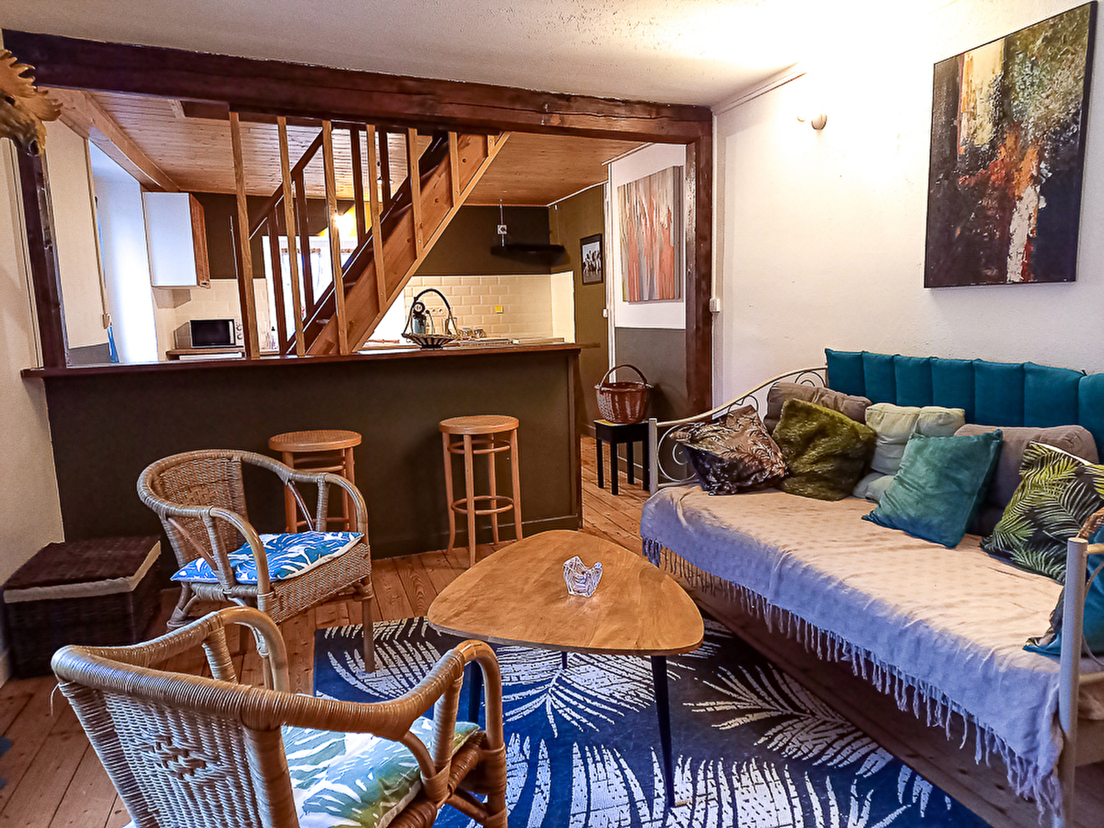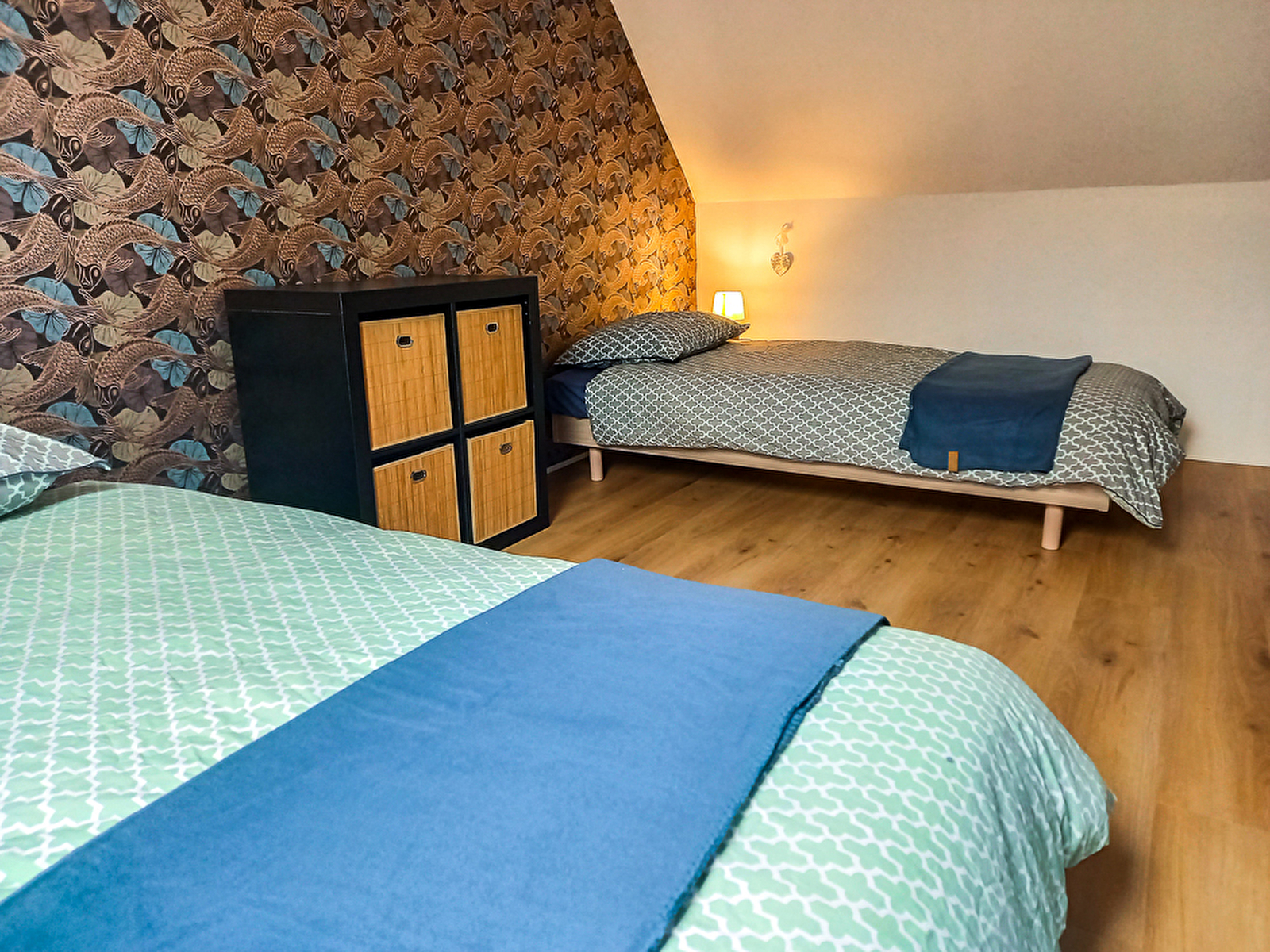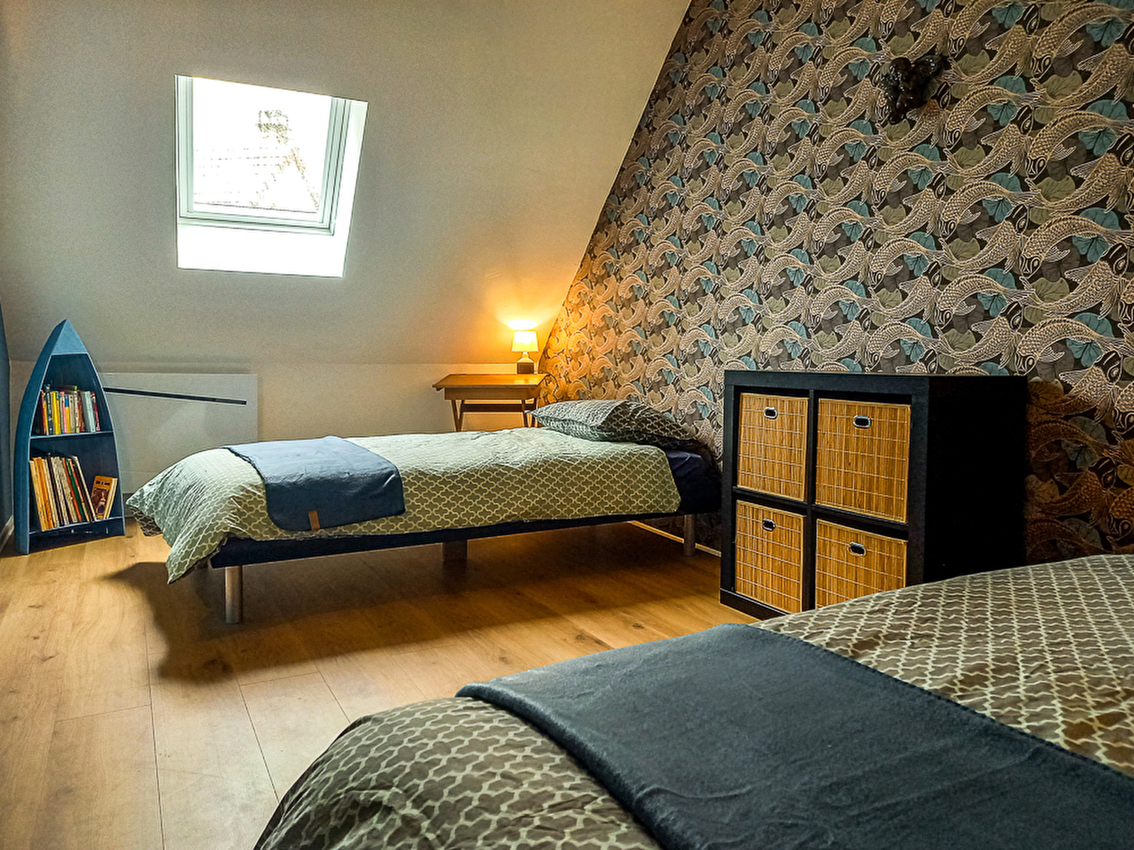 Le logement clair, chaleureux, fonctionnel, avec une décoration très soignée, se compose d’une entrée, d’un salon cosy, télévision, jeux et bibliothèque, d’une cuisine entièrement équipée avec électroménager neuf. A l’étage, deux vastes chambres mansardées. L’une avec un lit 160, literie neuve, rangements, bibliothèque. L’autre avec deux lits 90, literies neuves. Rangements, bibliothèque enfants.