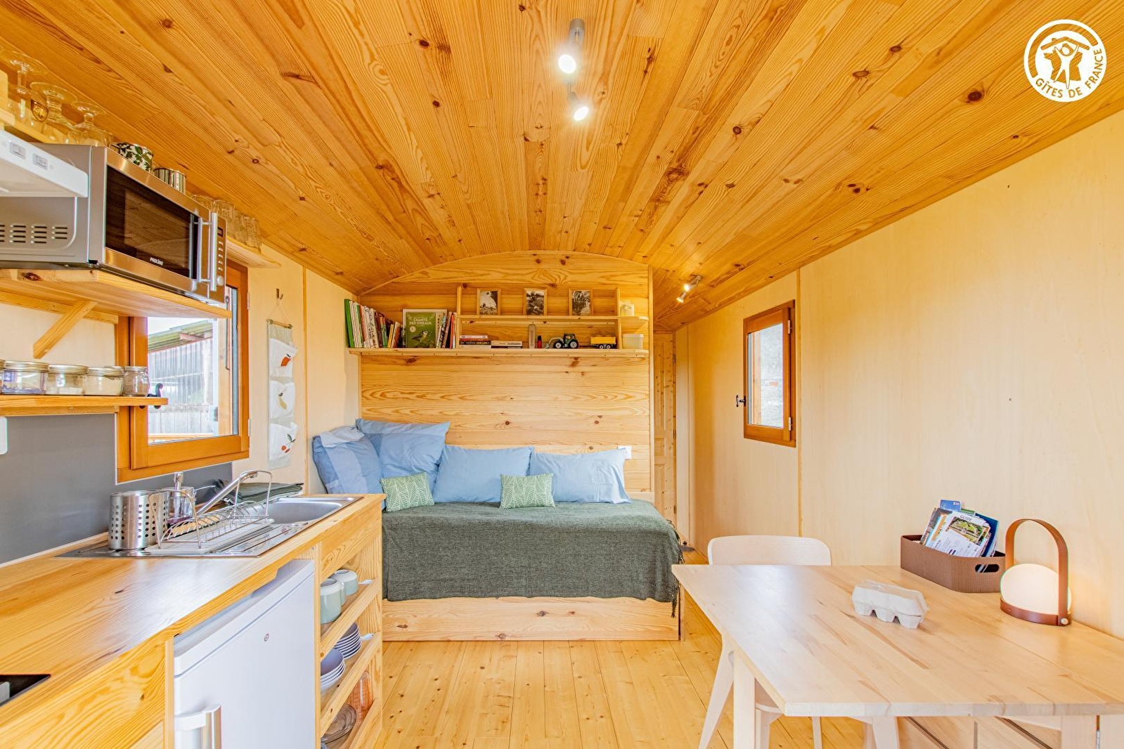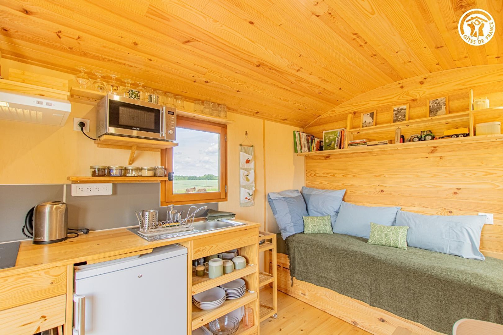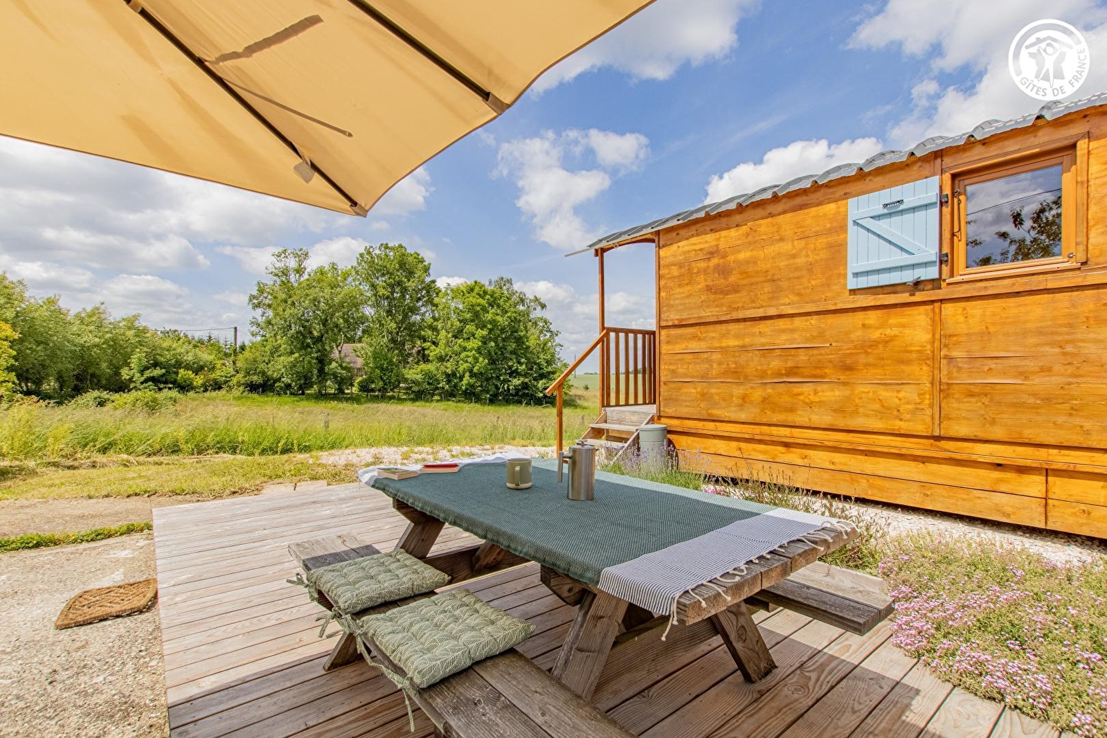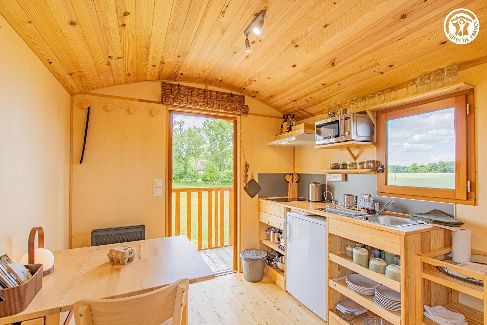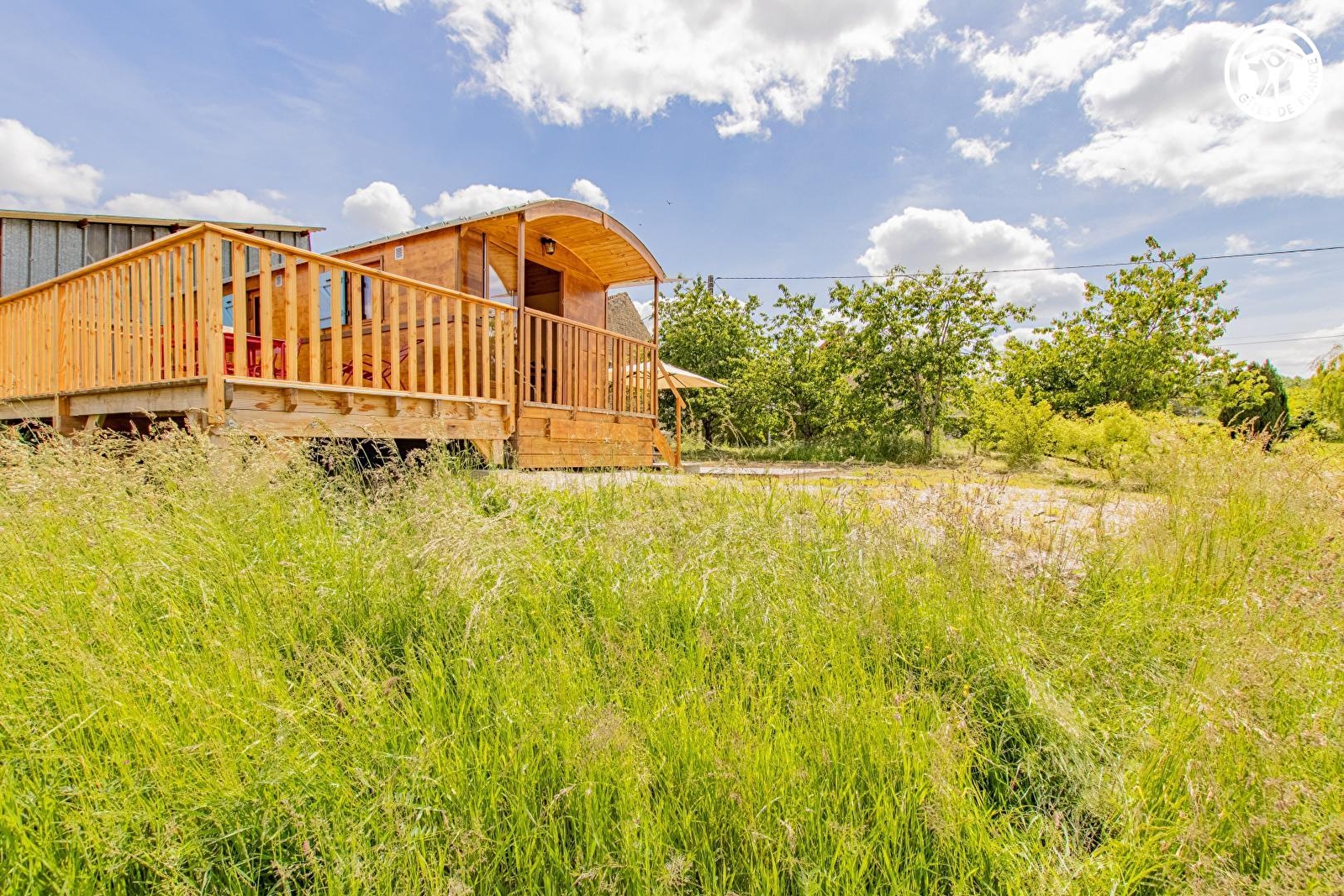 Passionnés de nature et d'environnement, Delphine & Jérôme vous accueillent au sein d'une insolite roulotte sise au calme, en lisière des prés (dont une mini pâture accueillant en saison leurs deux ânes), bien "à l'écart" sur leur petite ferme familiale de production de fruits & légumes en "agroécologie" (abritant également un petit poulailler & leur atelier de menuiserie artisanale). Totale tranquillité au sein d'un paisible petit hameau rural, en pleine campagne bressane au creux d'un apaisant écrin préservé de nature & verdure (protégé en ZNIEFF pour ses richesses faunistiques & floristiques), vaste plaine vallonnée de champs de cultures & prairies parsemée de nombreux étangs (en partie protégés pour leurs exceptionnels biotopes, notamment ornithologiques, abritant des espèces très rares), à deux pas d'une grande forêt sauvage. Cadre & site ultra relaxant, non loin des rives du Doubs (véritable paradis des kayakistes & site de pêche ultra réputé pour ses célèbres silures, sandres ou carpes) remarquable écosystème pour partie protégé en "Zone Natura 2000" pour son exceptionnelle réserve ornithologique riche de 160 espèces & ses variétés végétales très rares. Enveloppant "cocon" de très bon confort au chaleureux cachet campagnard boisé. Vaste balcon-terrasse panoramique offrant une splendide vue dégagée sur la campagne environnante complétée, "côté cour", par une seconde large terrasse exposée & fleurie bordée de cerisiers (cueillette possible).