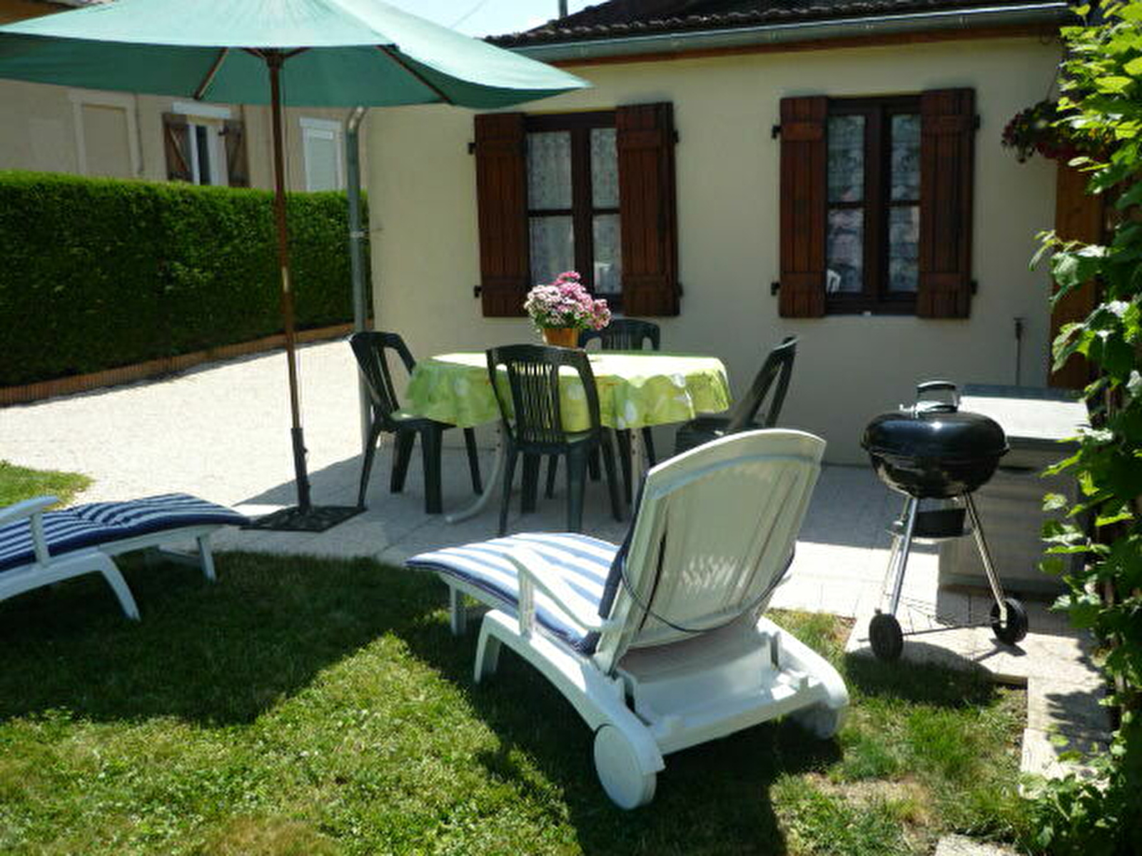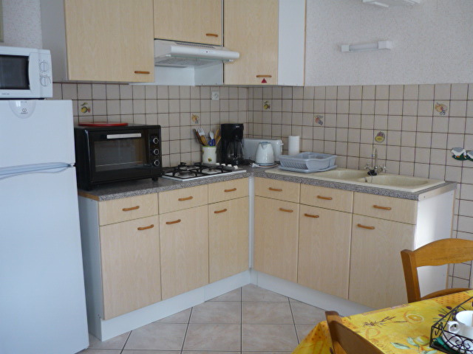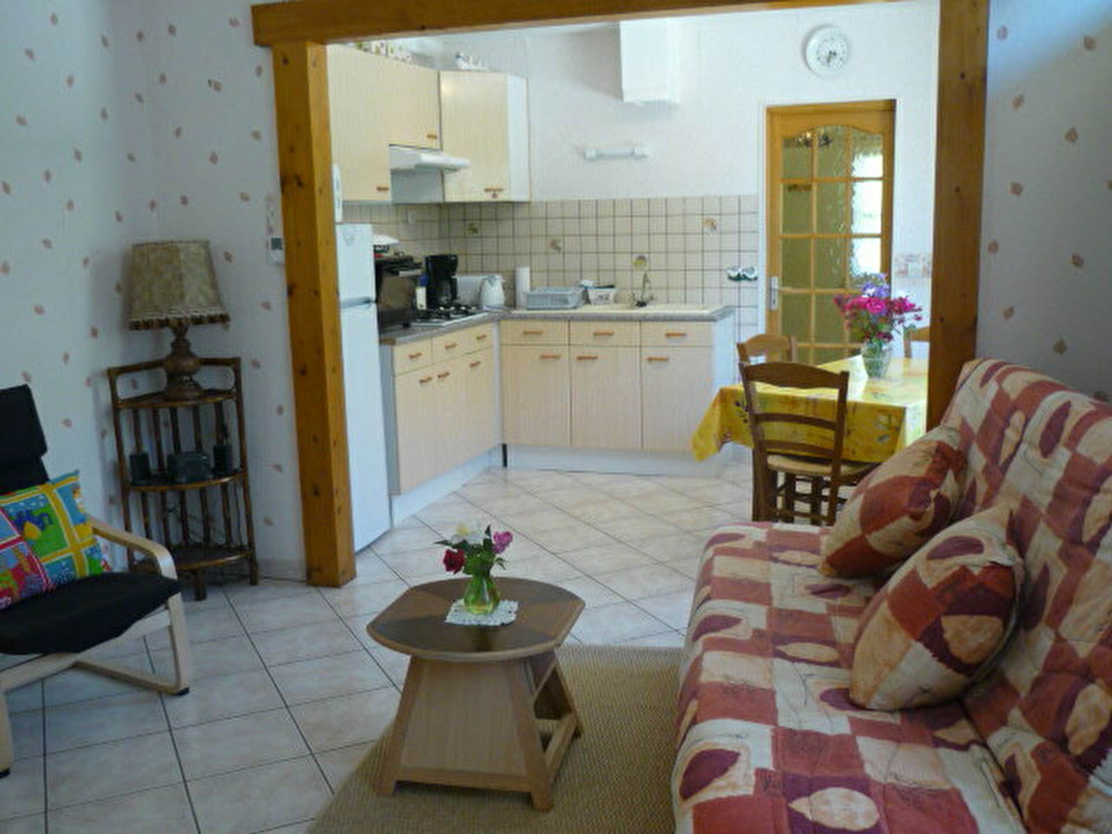 Hall d'entrée, cuisine équipée, salon avec clic-clac, TV, bibliothèque,1 chambre 1 lit de 140 et 1 lit de 90, WC, salle d'eau (douche). Terrasse, salon de jardin, cour fermée.