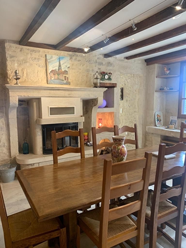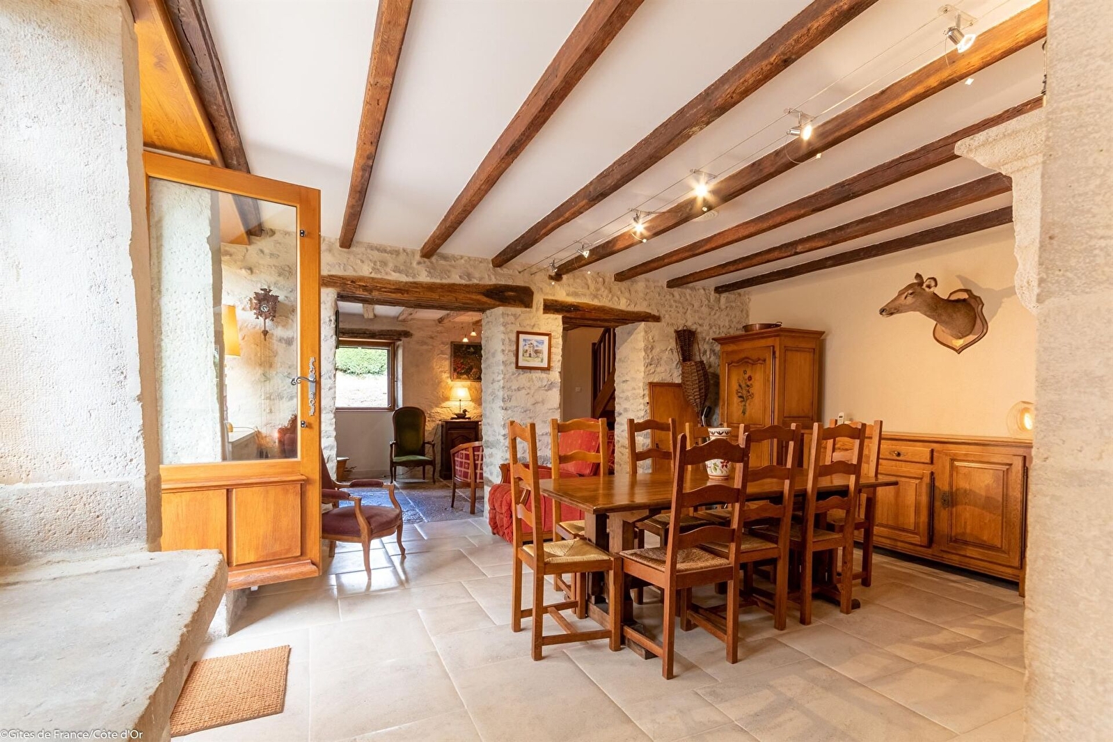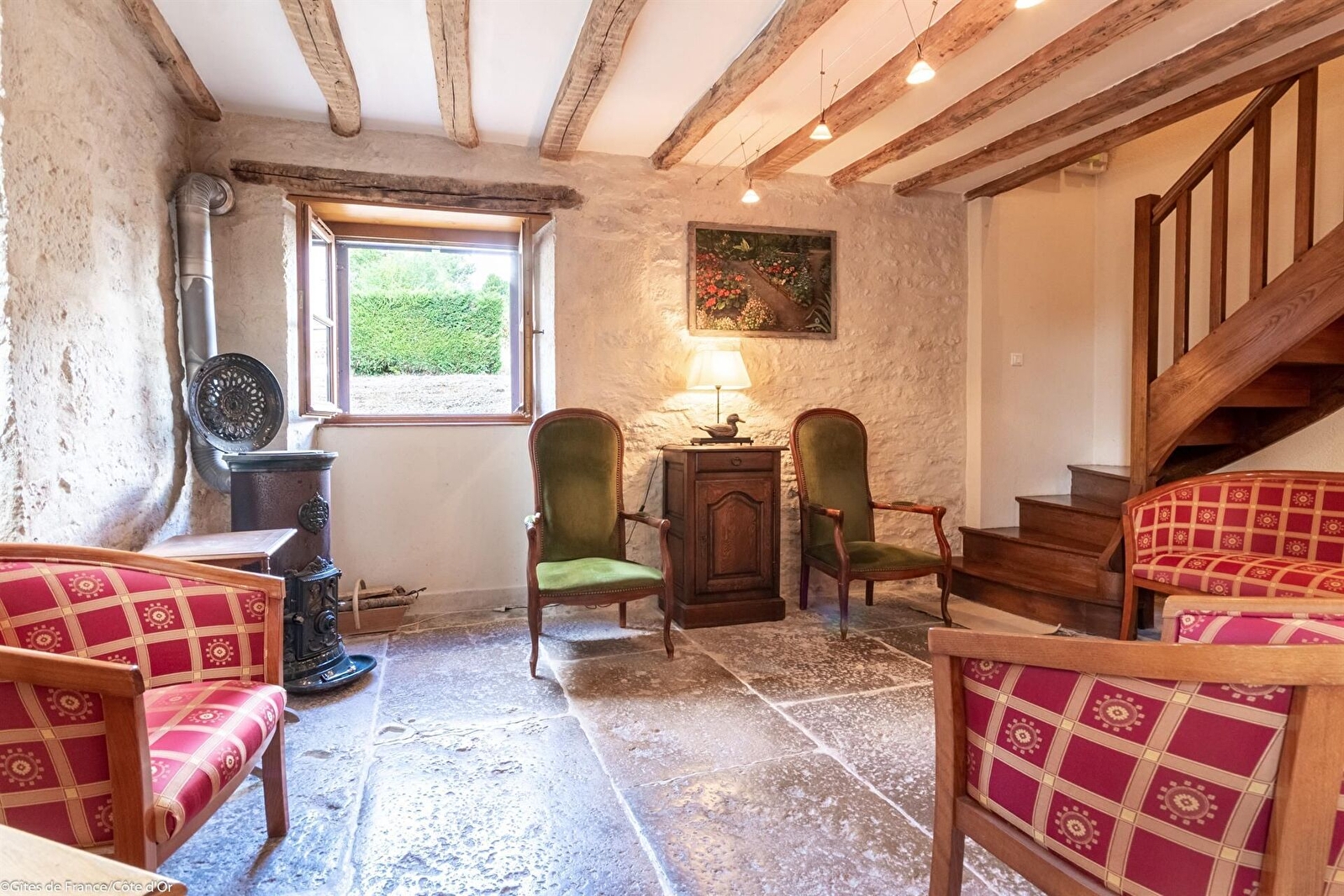 Rez-de-chaussée avec dalles de Bourgogne et poutres : cuisine intégrée neuve, salle à manger avec cheminée à foyer fermé ou ouvert et salon avec poêle à bois. WC.