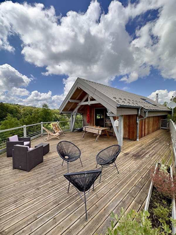 Chalet au charme original et design au centre du village de Châtelneuf, sur l'axe Champagnole-Genève. Vous vous trouvez dans une région calme où chaque saison a ses attraits : ski, randonnée, baignade, cascades, mycologie. Votre location de vacances, entièrement rénovée et tout confort, dispose d'une cuisine équipée, coin salon avec poêle à bois et accès à une vaste terrasse extérieure exposée au Sud. Au rez de chaussée, vous trouverez une chambre avec 1 lit 2 places, une chambre avec 2 lits superposés, salle de bain, wc indépendant. Cour et jardin en partie clos, abri voiture et appentis. Animaux non admis. Option ménage : 70€. Fourniture de bois : 5€ le casier (un panier offert). Merci d'apporter vos draps et linge de toilette. A 10 km : courses, baignade, randonnée, VTT, pêche, équitation, tennis. A 20 km : canoé, golf, ski de fond. A 50 km : ski alpin, via ferrata