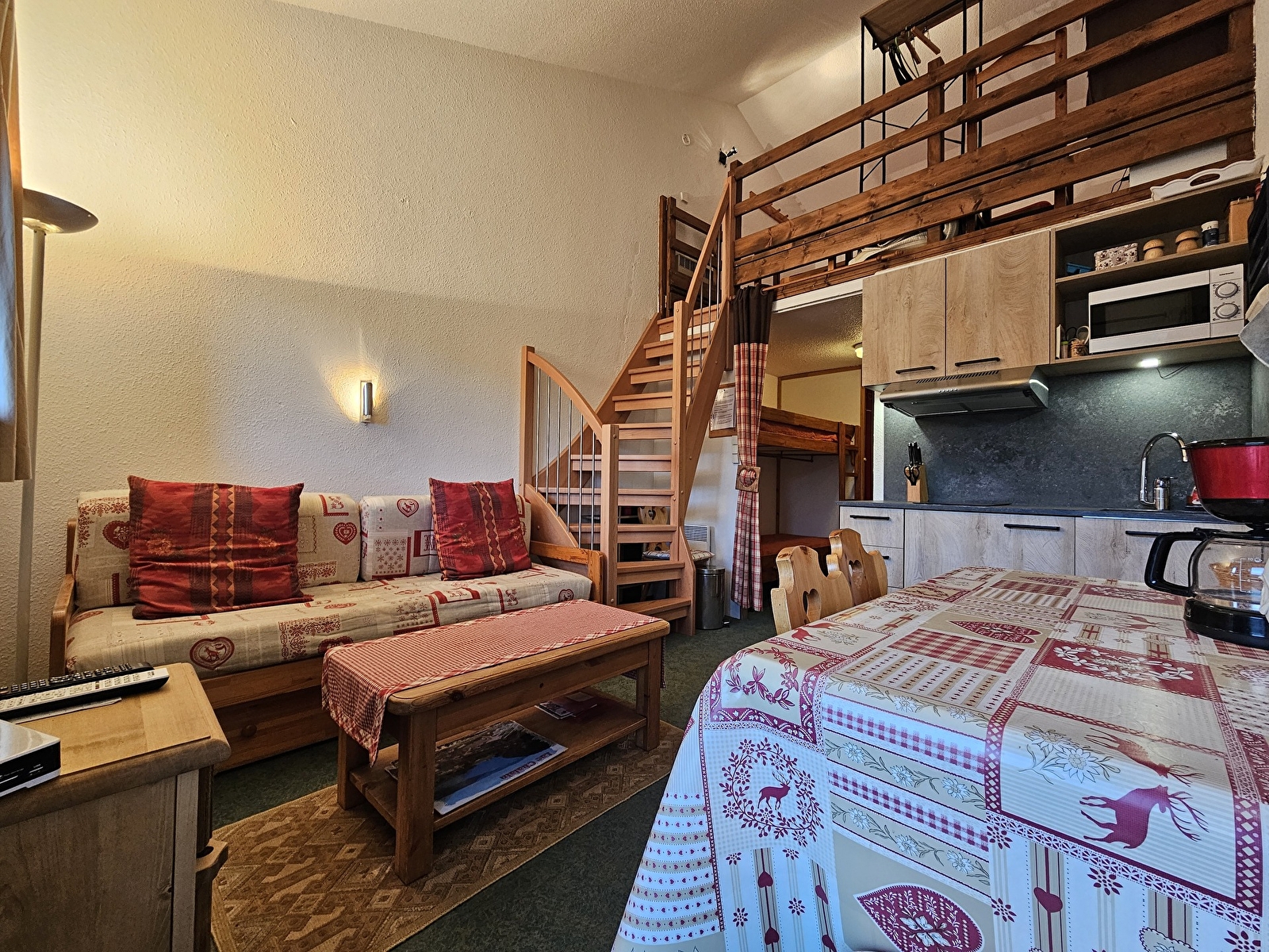 Situé dans la résidence "La Roche du Creux", le studio de 32m² est composé d'une entrée avec lits superposés (2x90cm), d’une pièce principale avec coin cuisine et canapé lit gigogne et d'une salle d'eau. Mezzanine avec deux lits de 90cm.