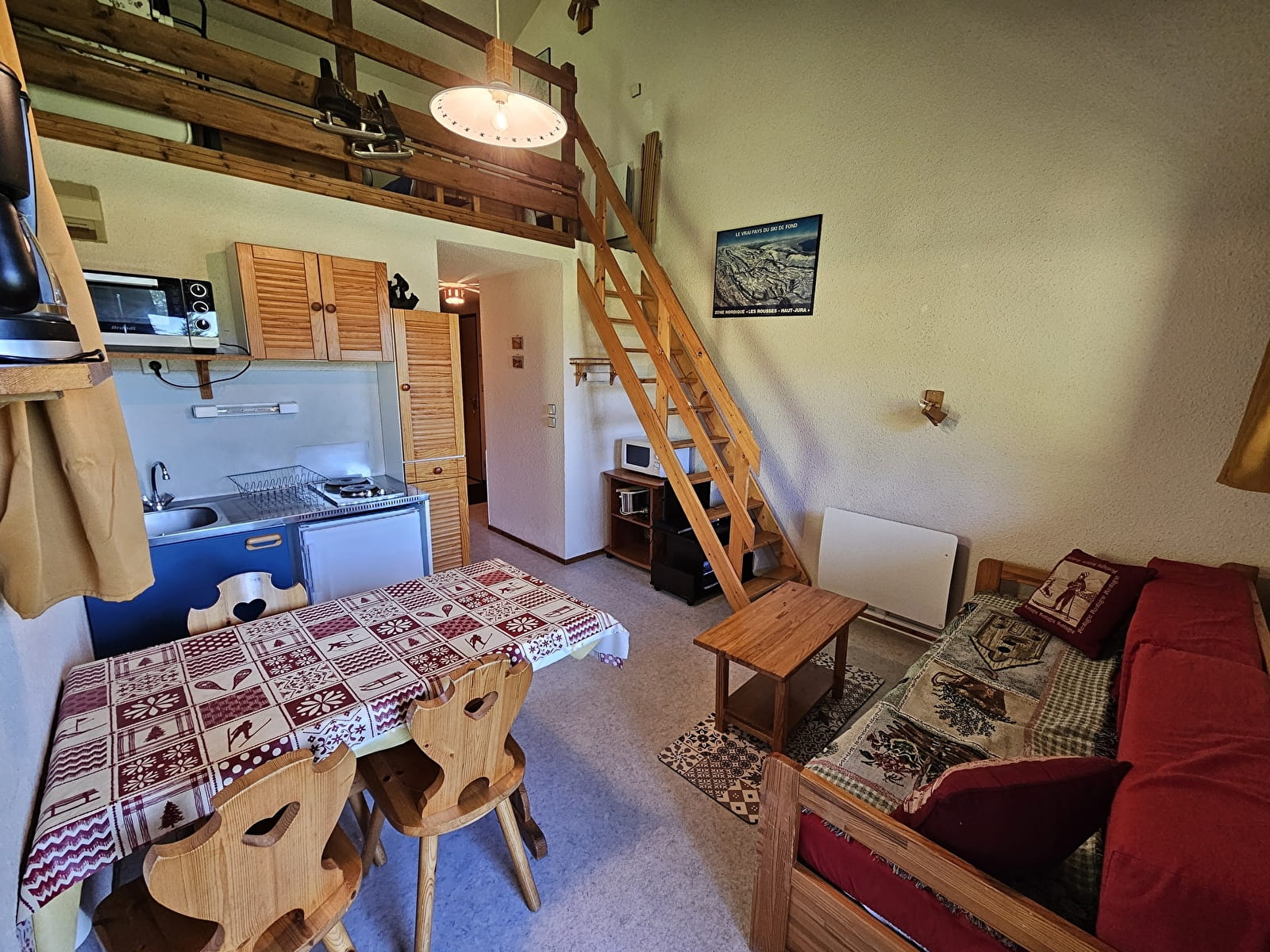 Situé dans la résidence "La Roche du Creux", le studio/mezzanine de 37m² est composé d’une pièce principale avec coin cuisine et banquette, d’une chambre indépendante avec lit en 140cm ainsi que d'un coin nuit en mezzanine avec deux lits de 90cm. Salle d'eau et WC indépendants..