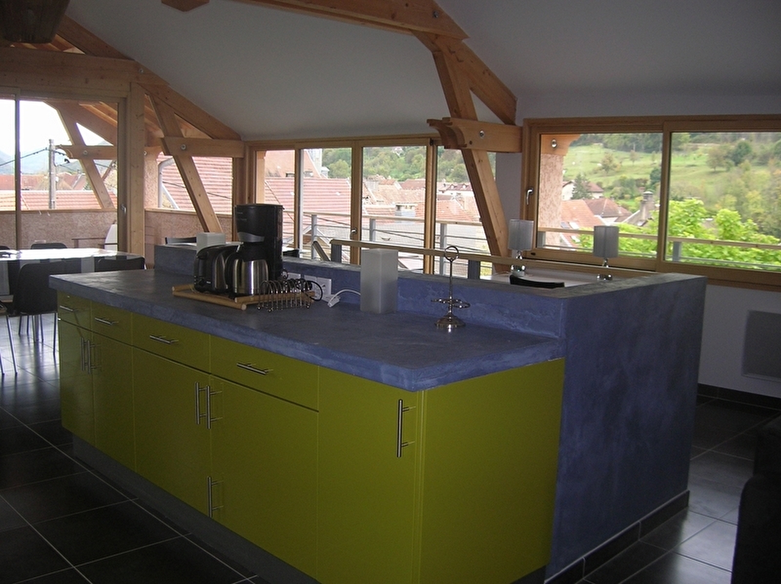 Maison d'architecte spacieuse et lumineuse, située à 5mn du centre d'Ornans. Prestation haute gamme, déco tendance et design. Vue imprenable sur l’enfilade de la vallée et la ville d’Ornans.