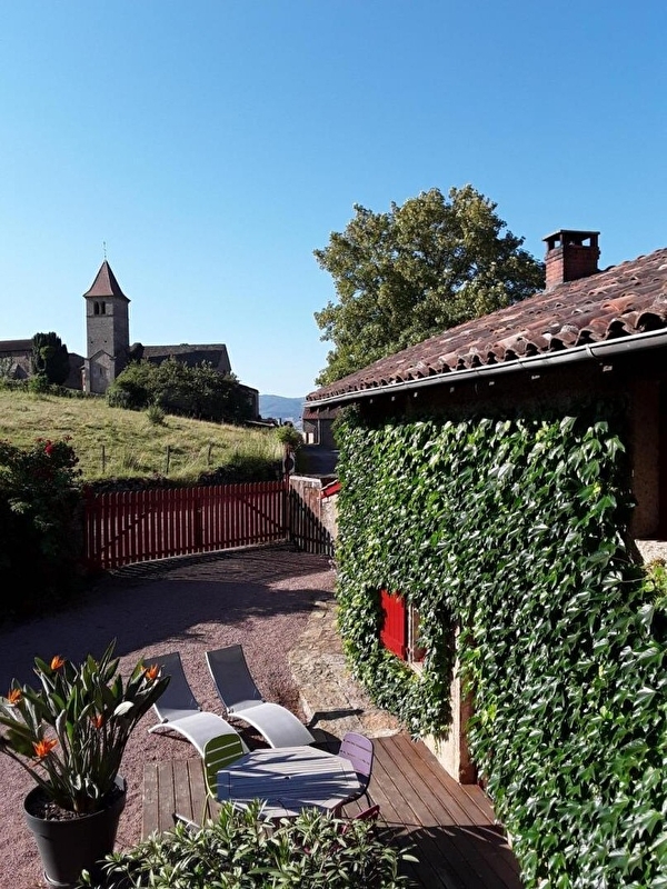 Tous deux agriculteurs retraités (anciens éleveurs de vaches charolaises & chèvres), Monique et André vous accueillent au sein d'une ravissante authentique ferme de pays du XVIIème siècle chargée d'histoire & restaurée avec soins (propriété familiale depuis des générations), sublimée par une élégante vigne vierge multi-centenaire qui habille sa façade. Calme absolu au cœur d'un paisible & pittoresque petit hameau typique de la campagne clunisoise abritant une église romane classée de la première moitié du XIème siècle (chapelle Saint Jean-Baptiste sise à deux pas du gîte), blotti en belvédère sur un vaste plateau adossé à un coteau sud-ouest exposé dominant la vallée de la Grosne. Sublime cadre paysager, littéralement enchanteur, au creux d'un bucolique écrin préservé de nature et verdure, en lisière immédiat de bocage, forêts & prairies, cerclé de collines boisées, offrant une exceptionnelle vue dégagée sur les monts du sud Mâconnais. Somptueux panorama & site rural préservé de toute beauté. Spacieux gîte de bon confort. Chaleureux cachet campagnard néo-rustique allié à la charmante ambiance dépaysante d'une ancienne demeure bourguignonne préservée (restauration patrimoniale ultra soignée : historiques poutres & manteaux de cheminée, rare et exceptionnel sol en dalles de pierres d'origine…). A l'extérieur, vous disposez d'une agréable large cour close végétalisée offrant une vaste terrasse exposée et ombragée.