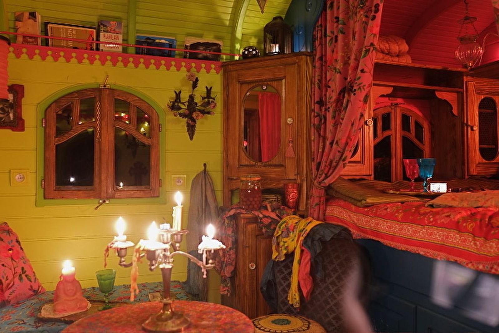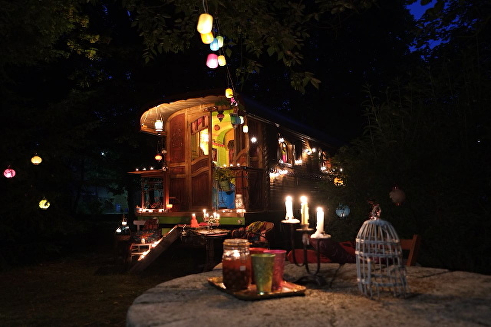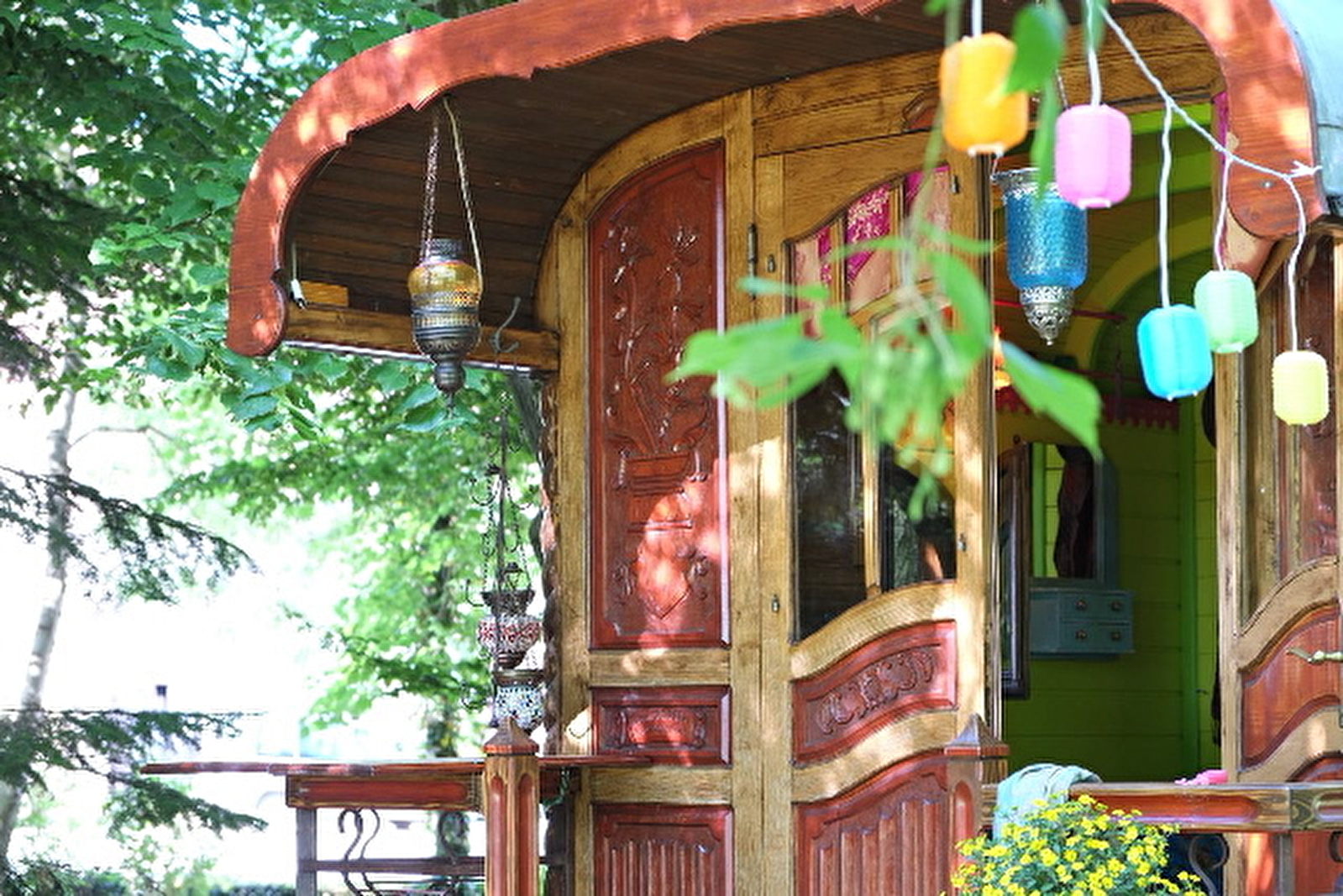 Lovée sous de grands arbres, dans un petit parc clos, longé par un cour d’eau, la Roulotte de Sandor, douce et colorée, vous attend. Cette roulotte a une belle histoire de roulotte qui a roulé... Petit-déjeuner inclus.